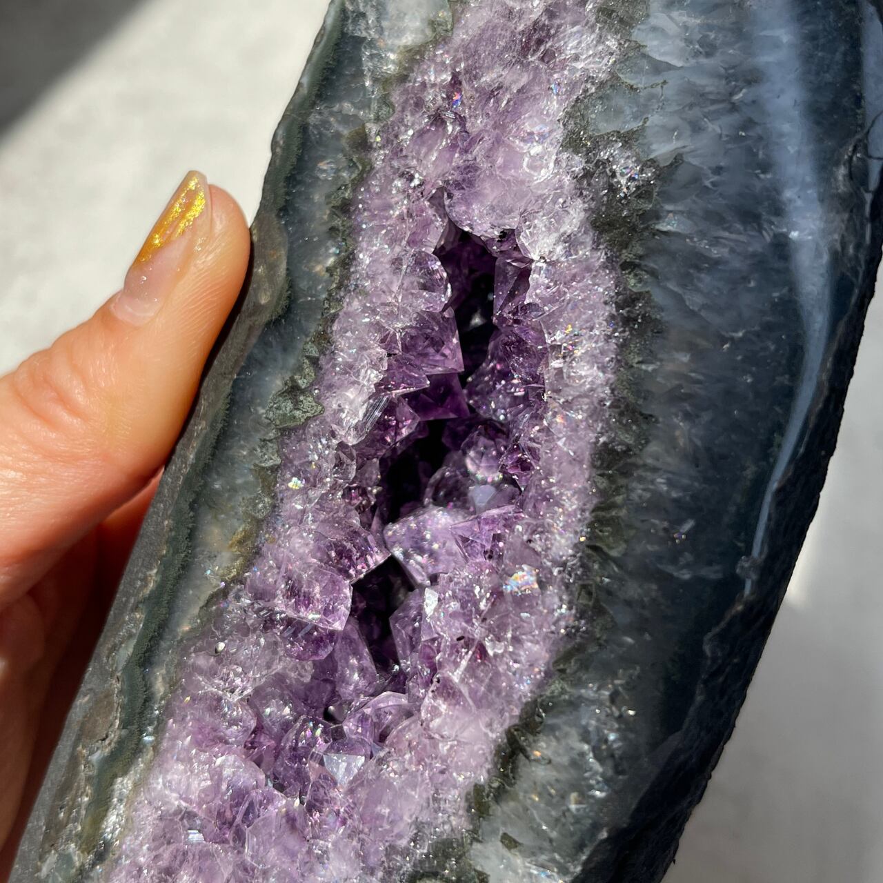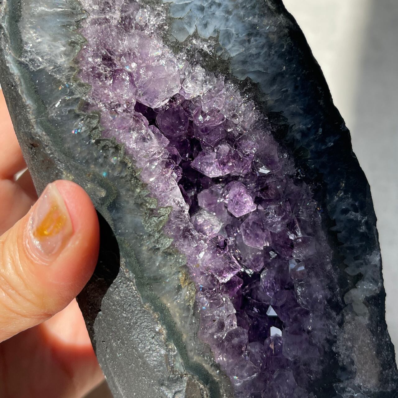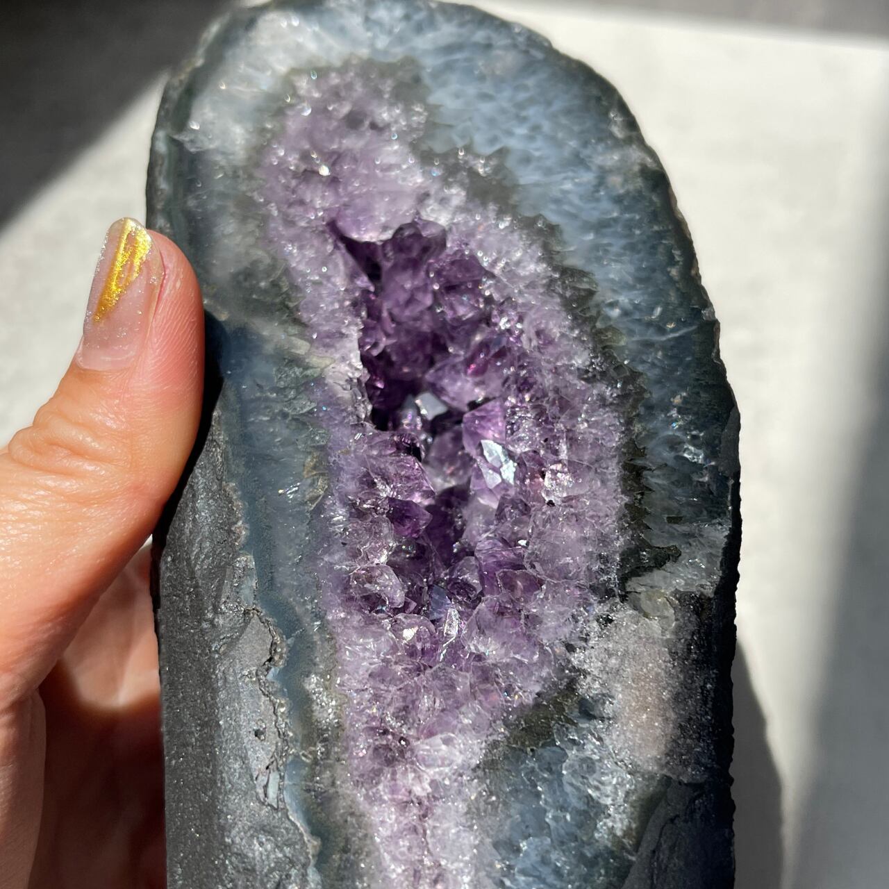 グレー色と濃淡パープルのコントラストが美しく、大粒の結晶がキラキラ煌めく素敵な子です。