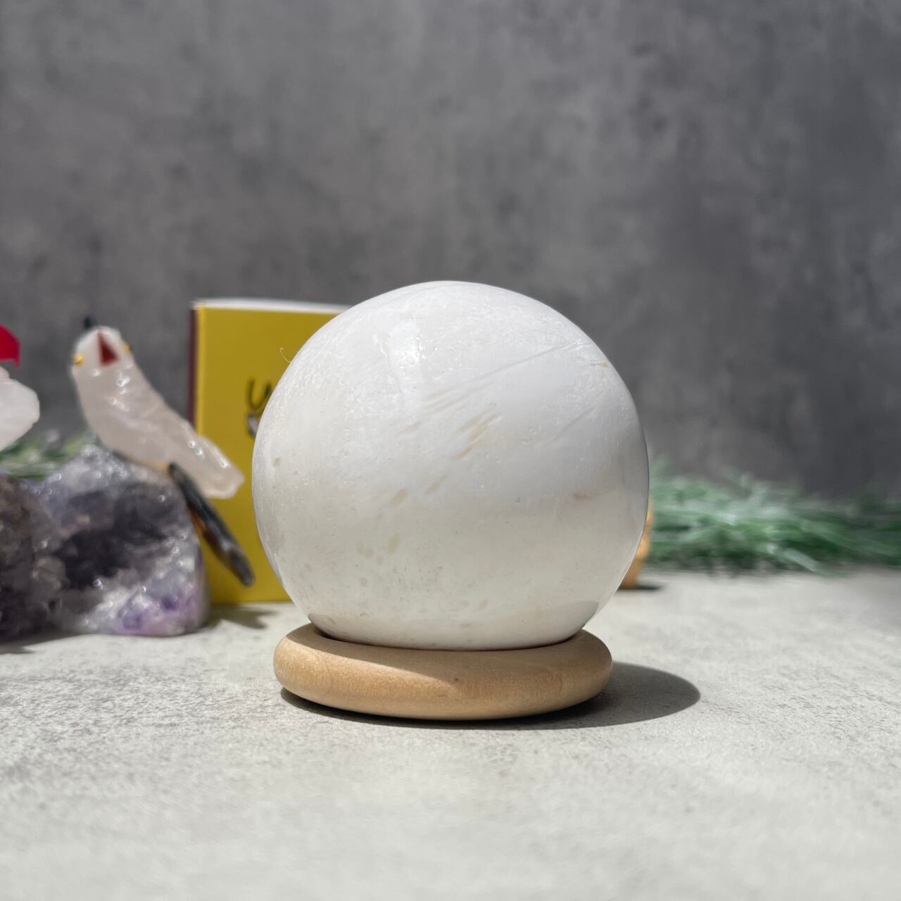 不透明な白色の光沢が美しく、繊維質な見た目が特徴的なインド産スコレサイトスフィア。
