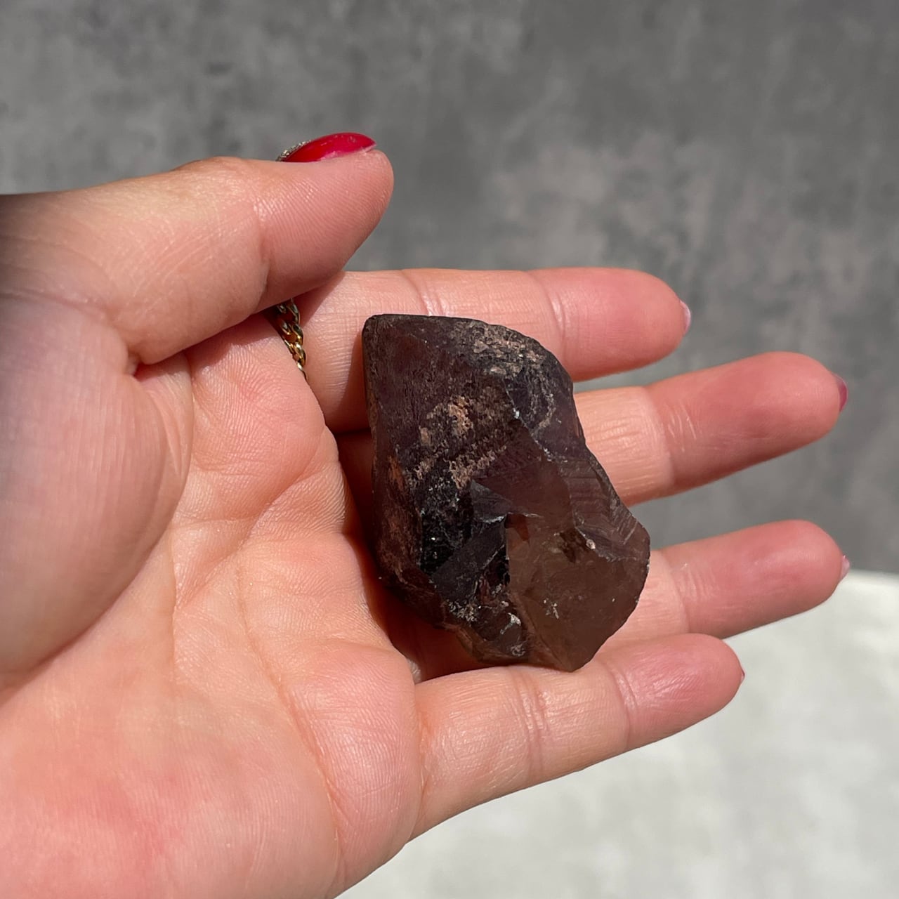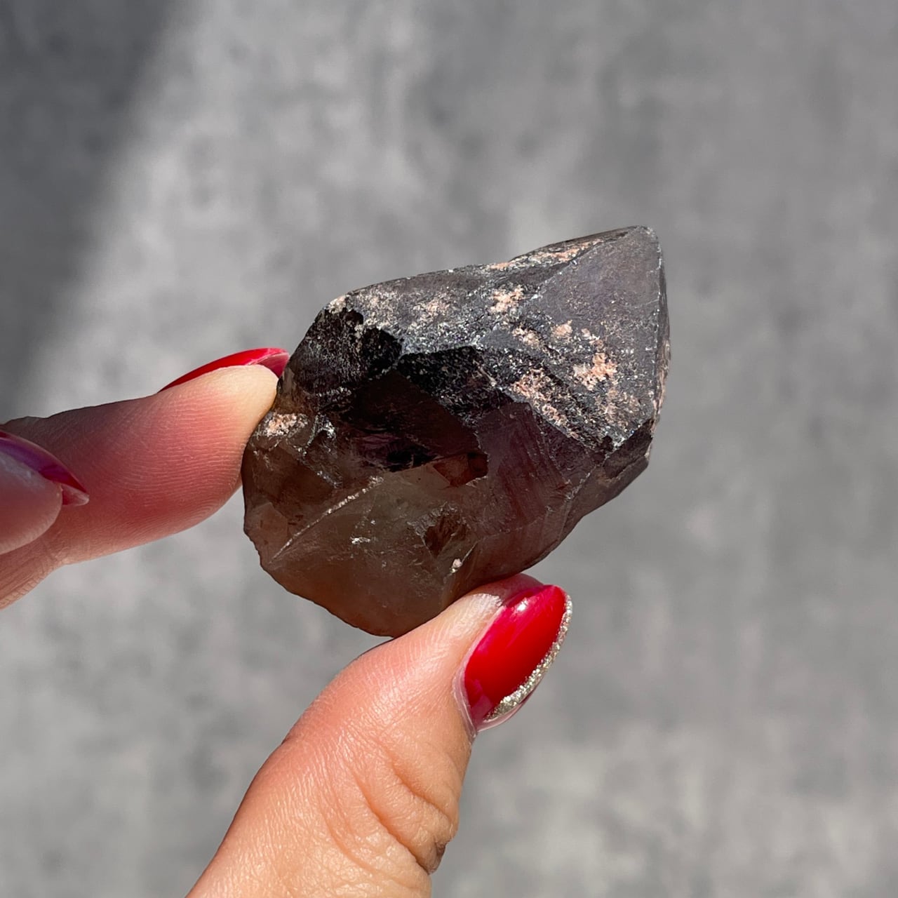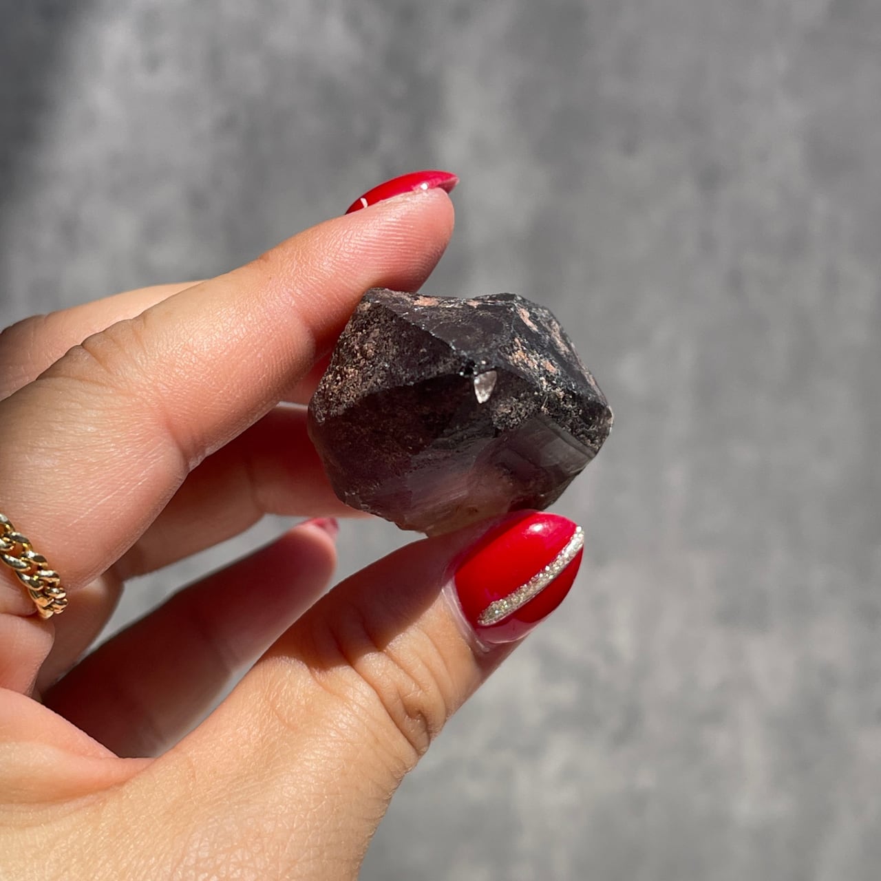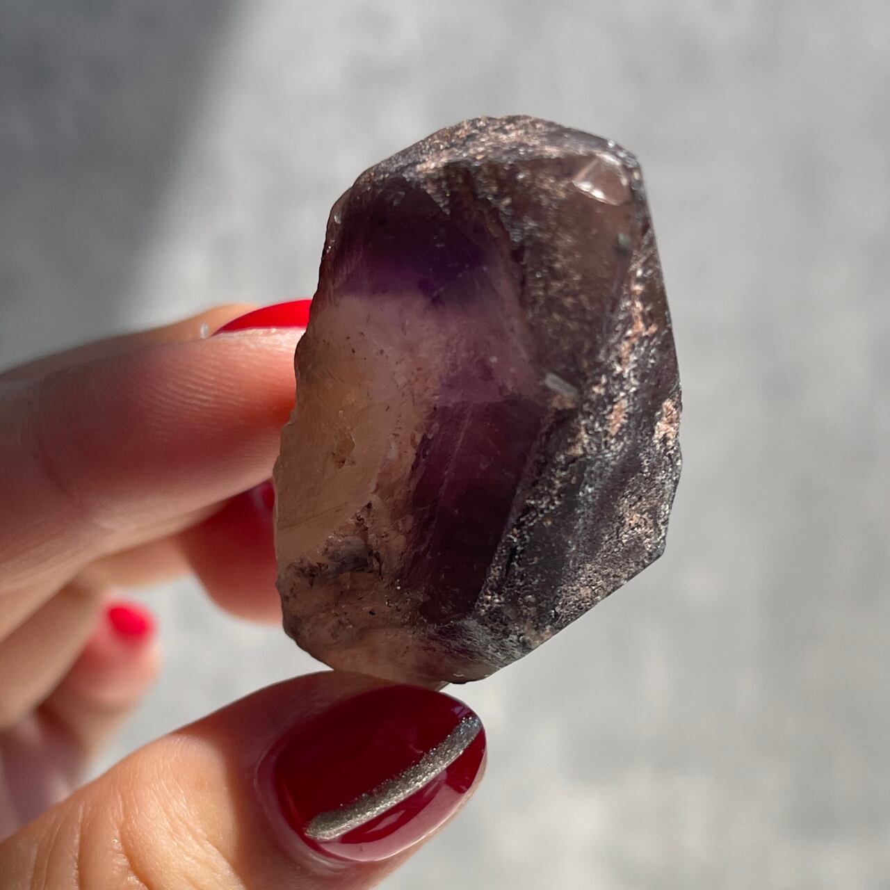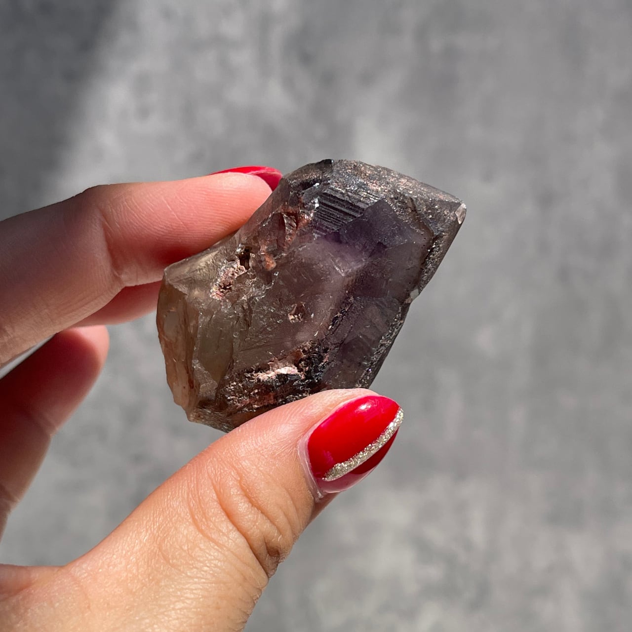 マダガスカル産のアメジストは色味が淡く、結晶の一部が紫色になっているものが多いです。また、紫色というよりも黒っぽさが際立つようにも見えます。