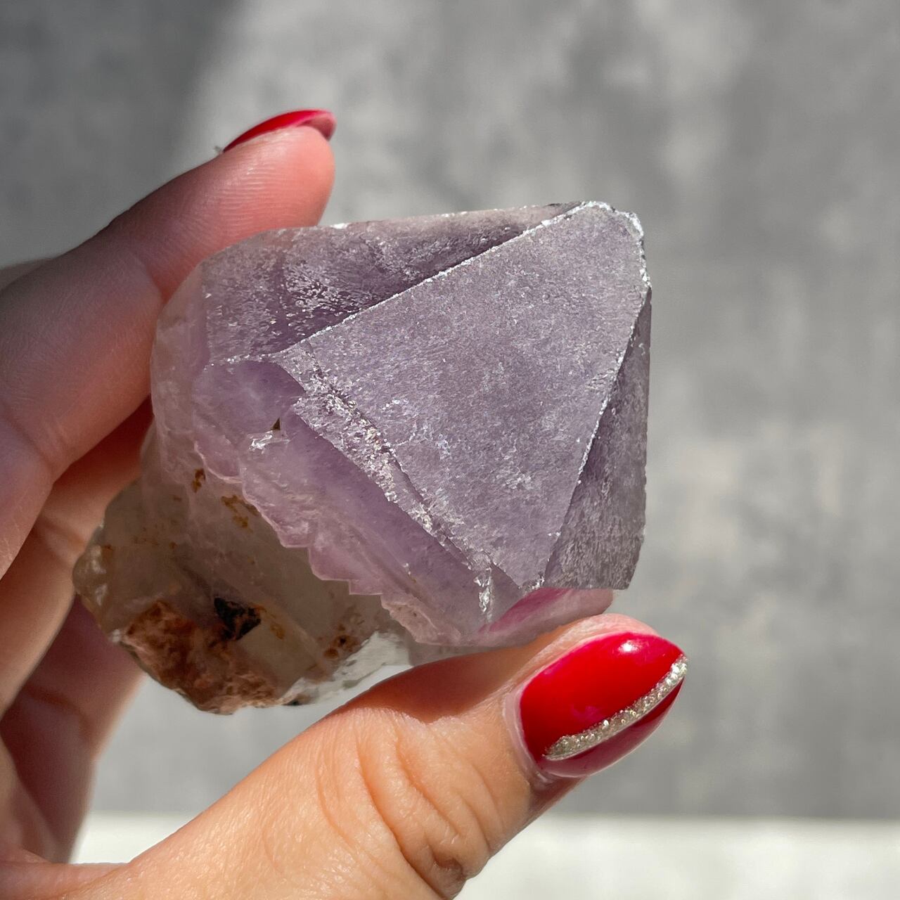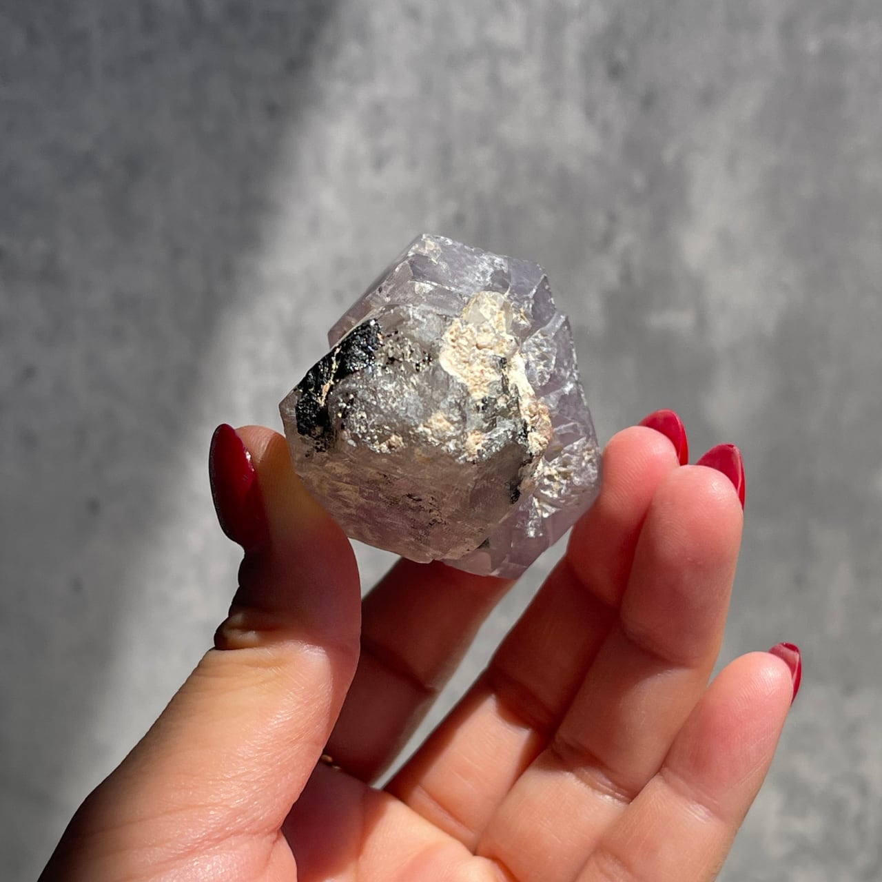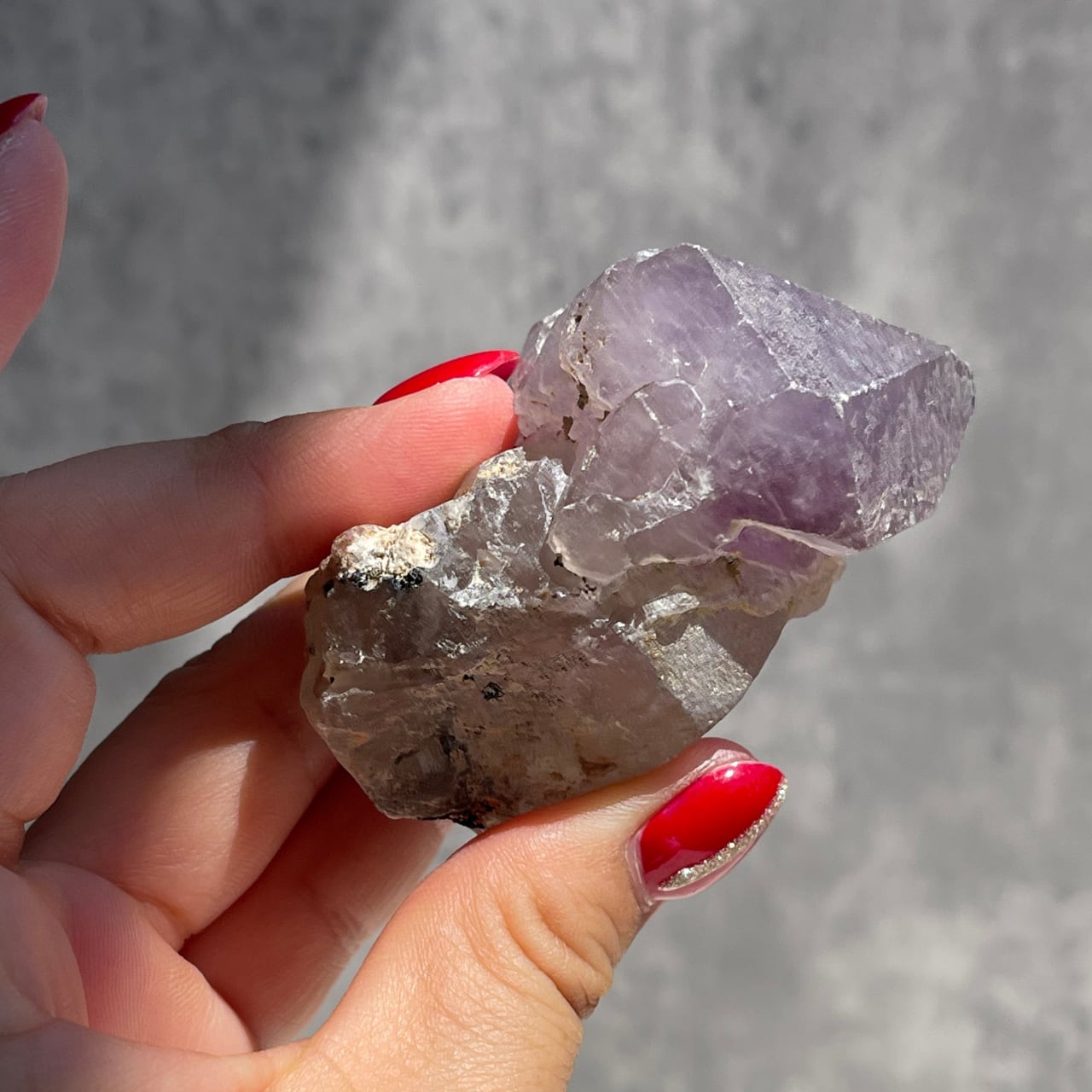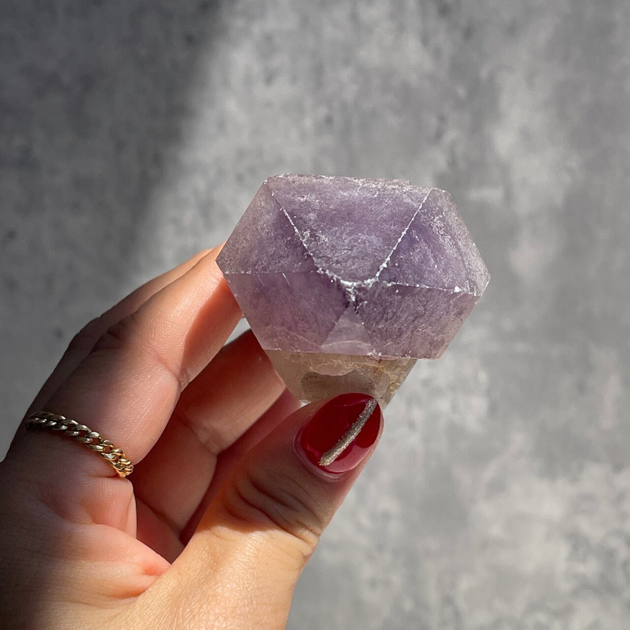 マダガスカル産のアメジストは色味が淡く、結晶の一部が紫色になっているものが多いです。また、紫色というよりも黒っぽさが際立つようにも見えます。