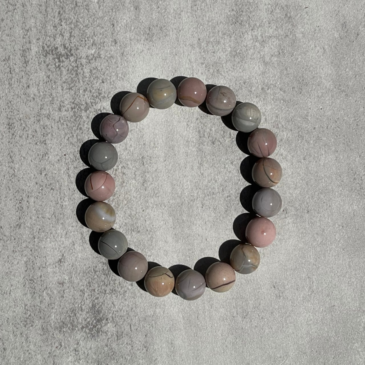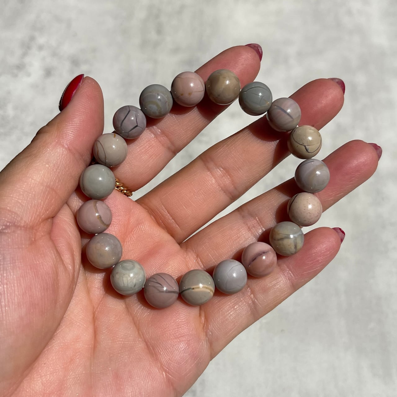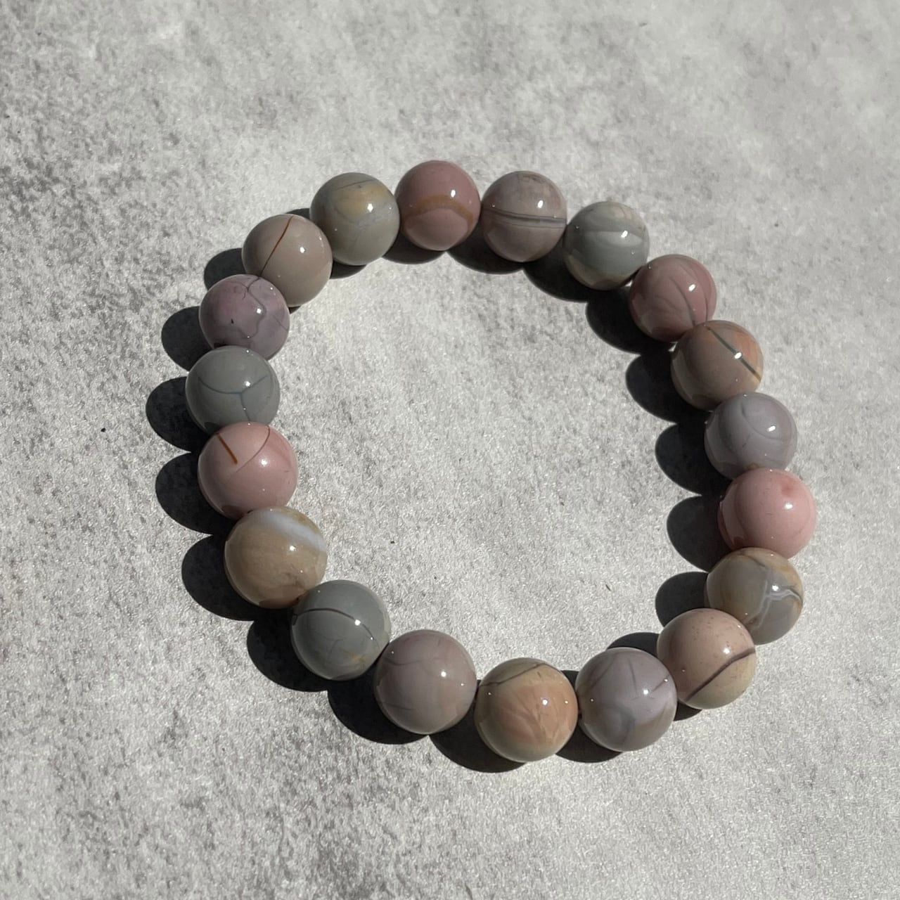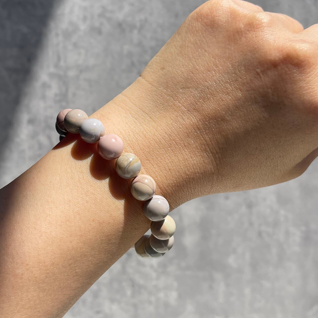 ピンクやイエロー、ベージュ、グレーなどのパステル調の優しい色合いが魅力の、アラシャンアゲートのブレスレット。