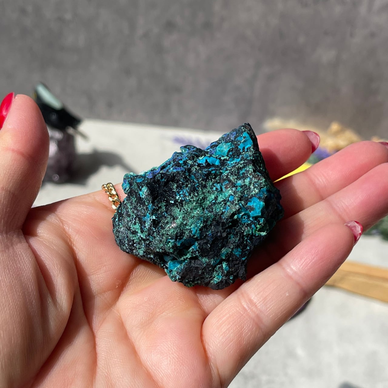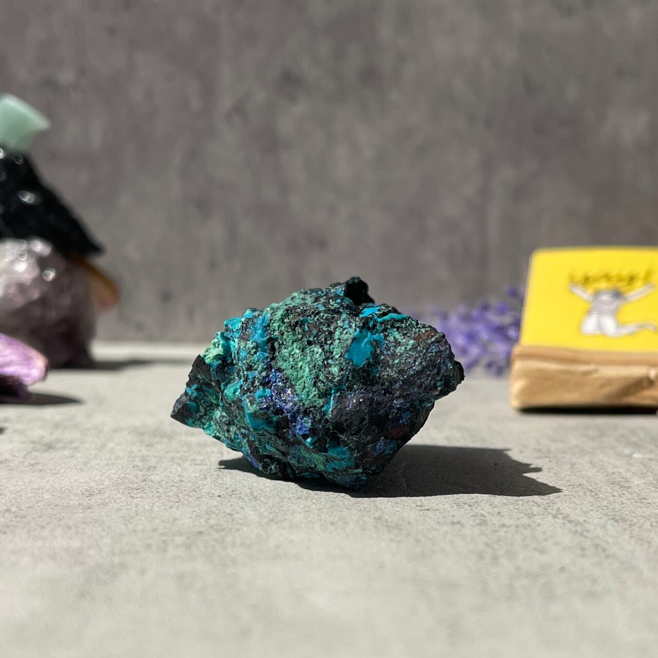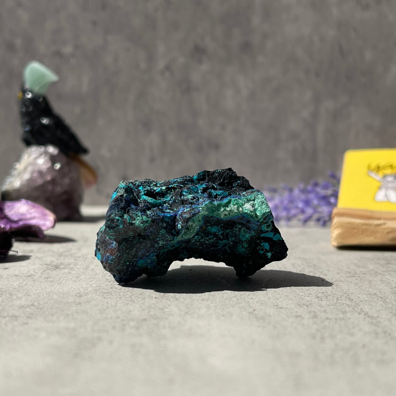 コバルトブルーのアズライト(藍銅鉱)と深緑色のマラカイト(孔雀石)、ターコイズブルーのクリソコラ(珪孔雀石)が共生した、ナミビア産アズライトマラカイトクリソコラの原石。