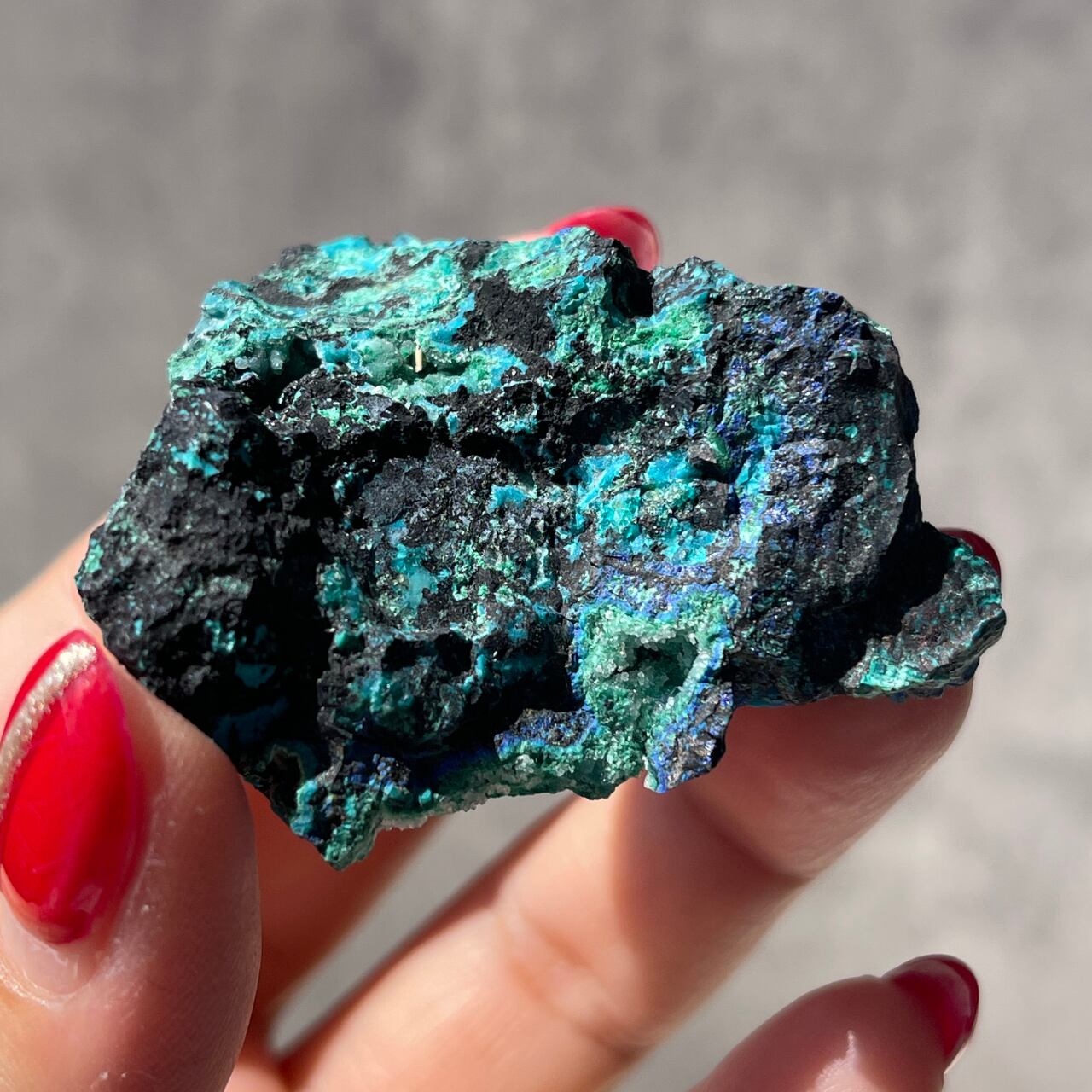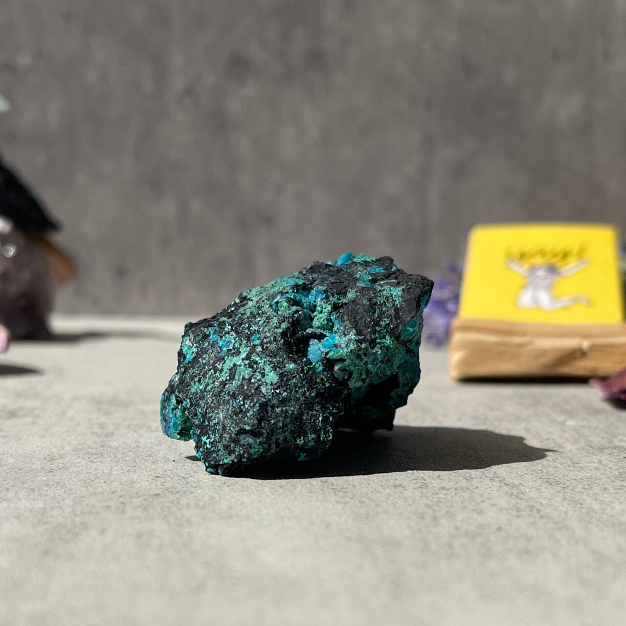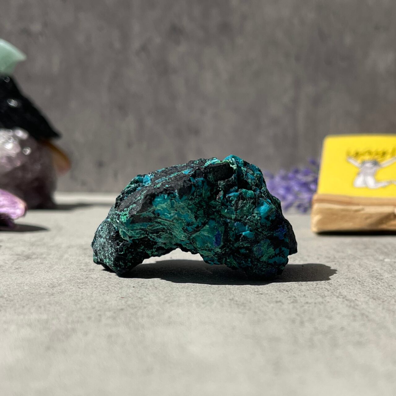 コバルトブルーのアズライト(藍銅鉱)と深緑色のマラカイト(孔雀石)、ターコイズブルーのクリソコラ(珪孔雀石)が共生した、ナミビア産アズライトマラカイトクリソコラの原石。