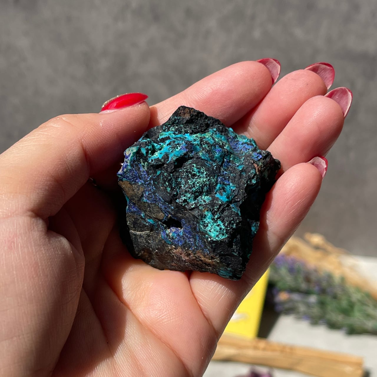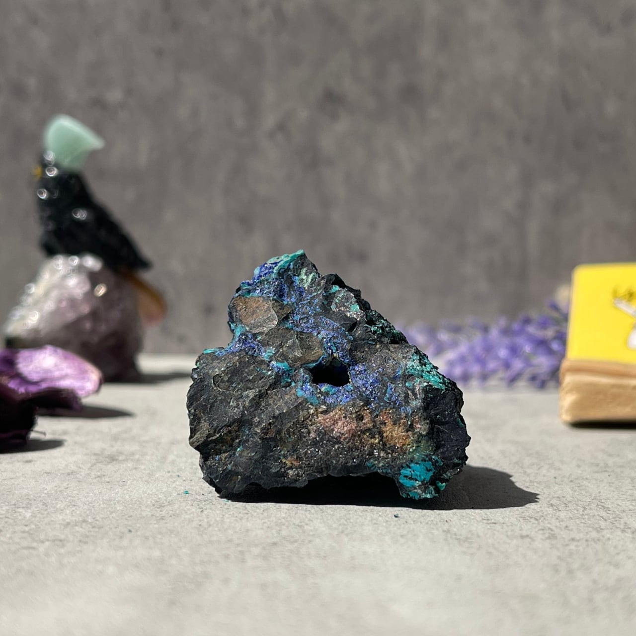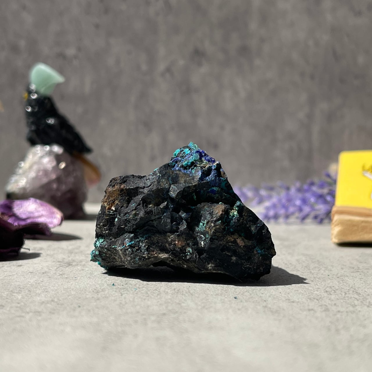 コバルトブルーのアズライト(藍銅鉱)と深緑色のマラカイト(孔雀石)、ターコイズブルーのクリソコラ(珪孔雀石)が共生した、ナミビア産アズライトマラカイトクリソコラの原石。