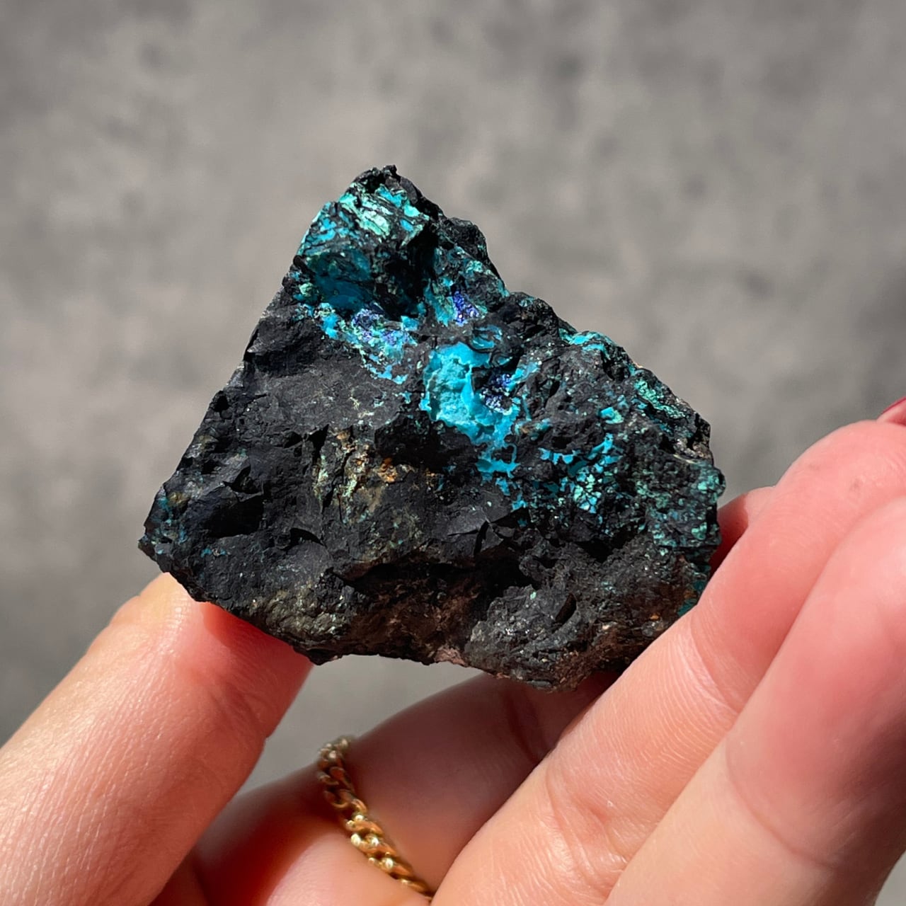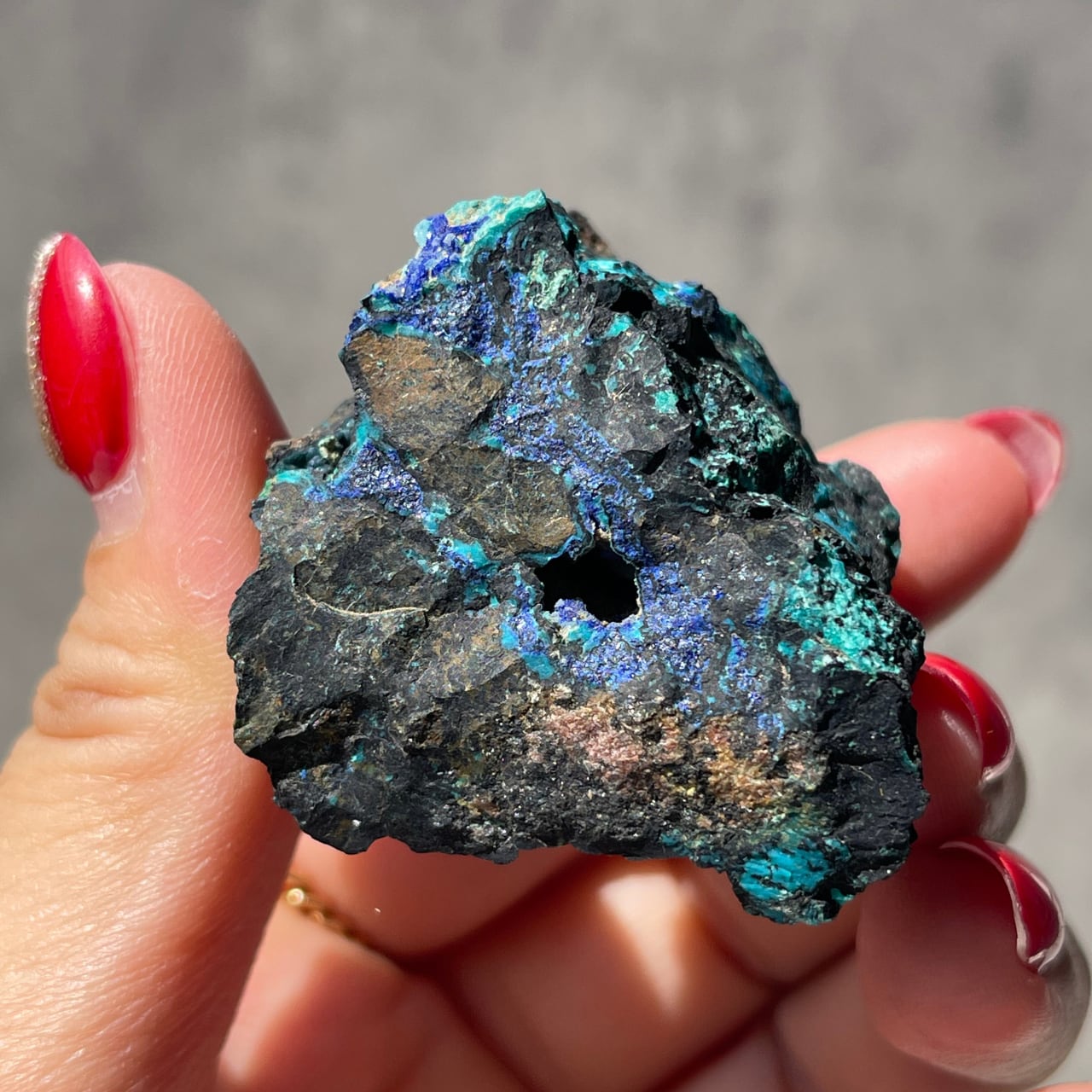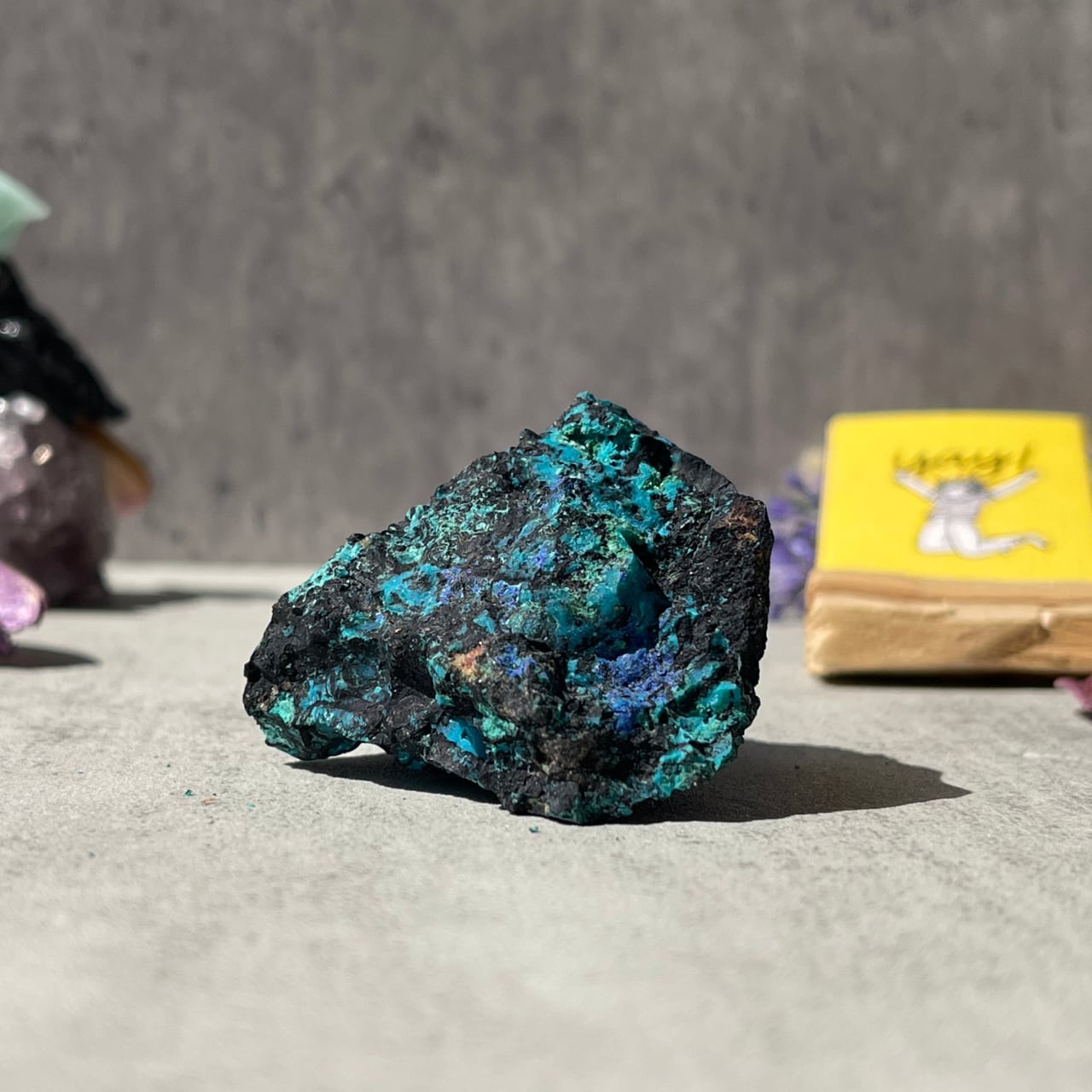 コバルトブルーのアズライト(藍銅鉱)と深緑色のマラカイト(孔雀石)、ターコイズブルーのクリソコラ(珪孔雀石)が共生した、ナミビア産アズライトマラカイトクリソコラの原石。