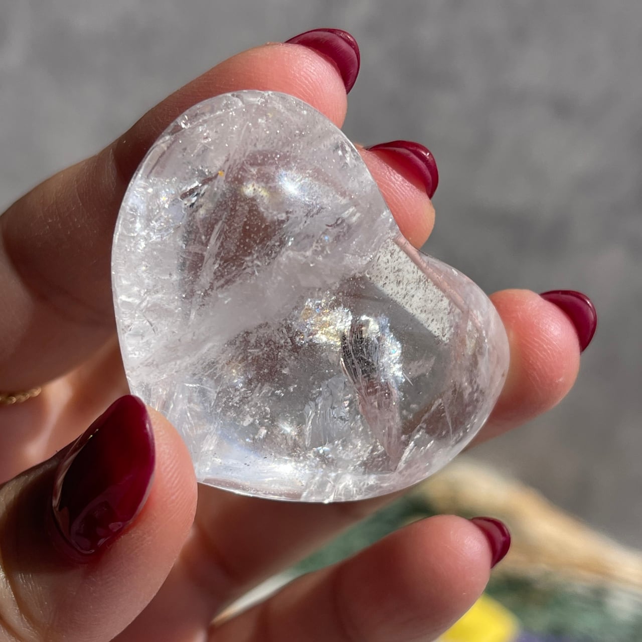 美しい透明感ときらきら煌めく虹が入った、可愛らしいハート型のブラジル産クリアクォーツ。