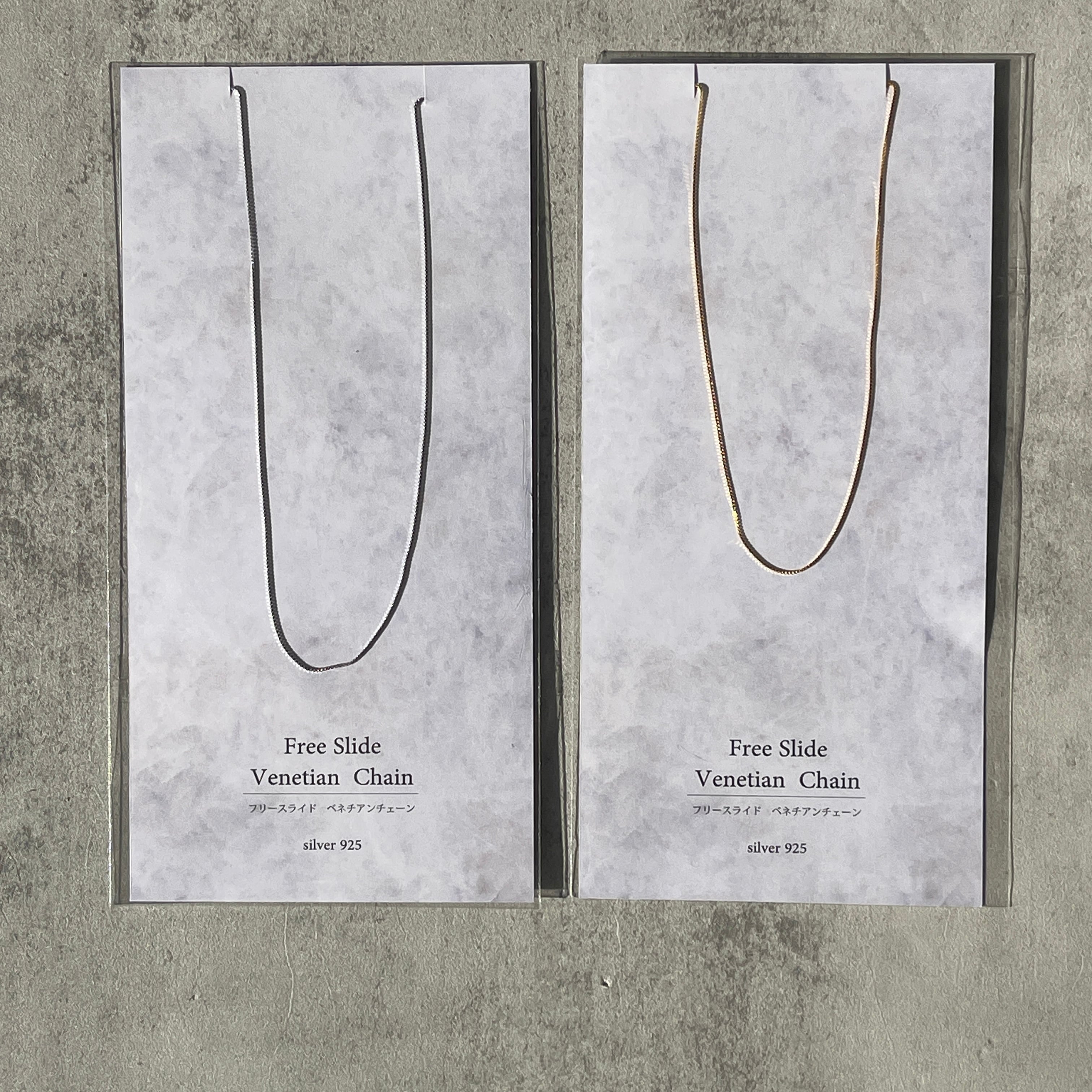 ベネチアンチェーンは、四角いコマを連ねた構造が特徴で、すっきりとした直線的な印象と、程よい存在感があります。