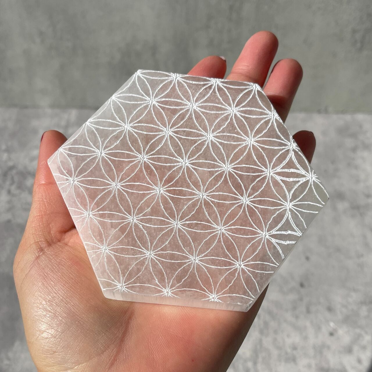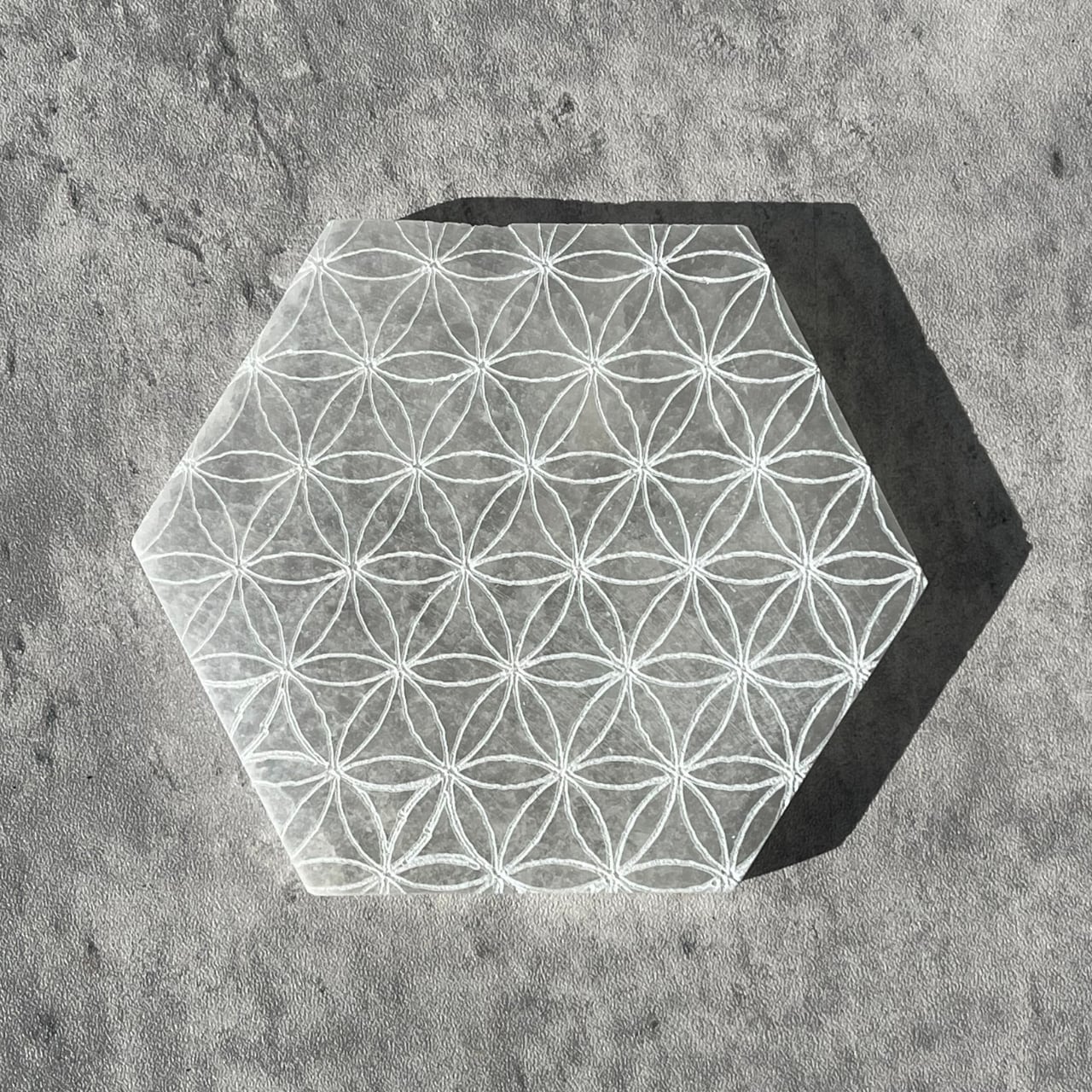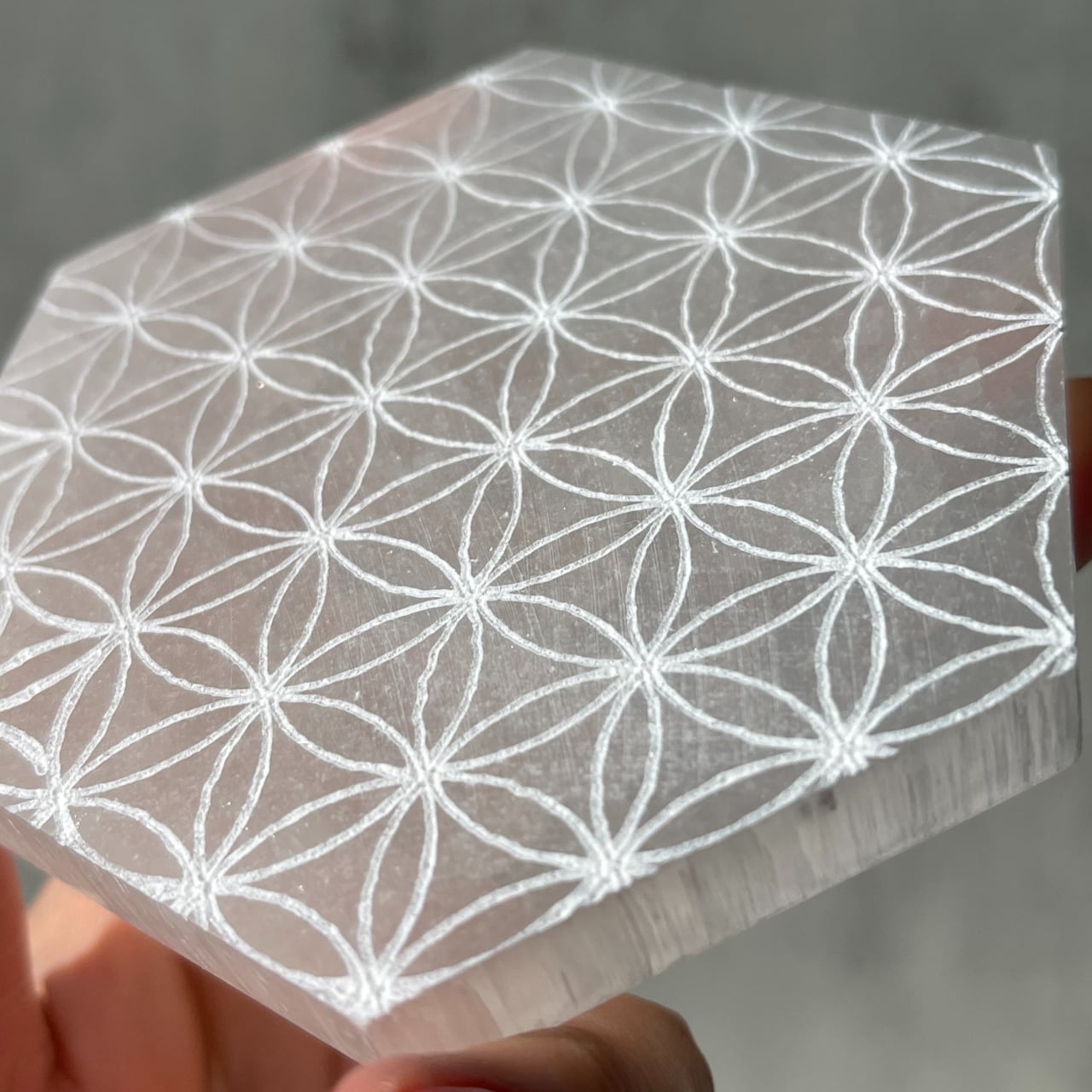 ミルキーホワイトの美しさとパワフルなエネルギーを持つ、セレナイトのフラワーオブライフヘキサゴンプレート。