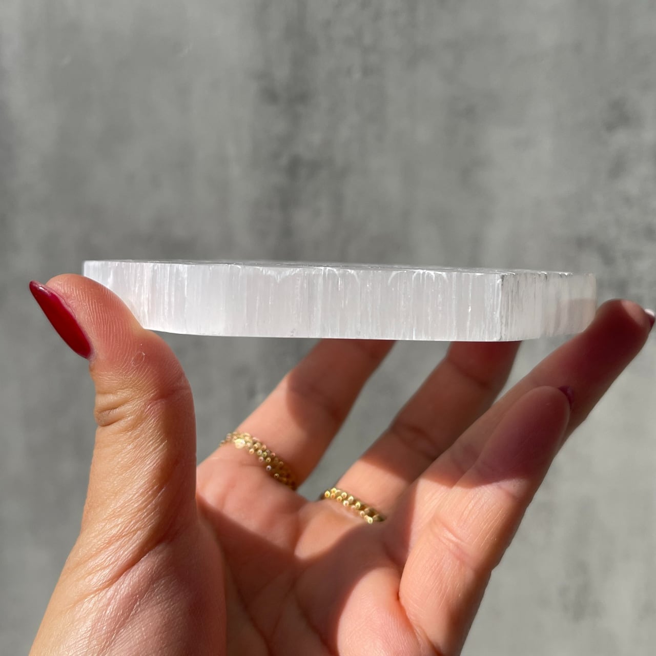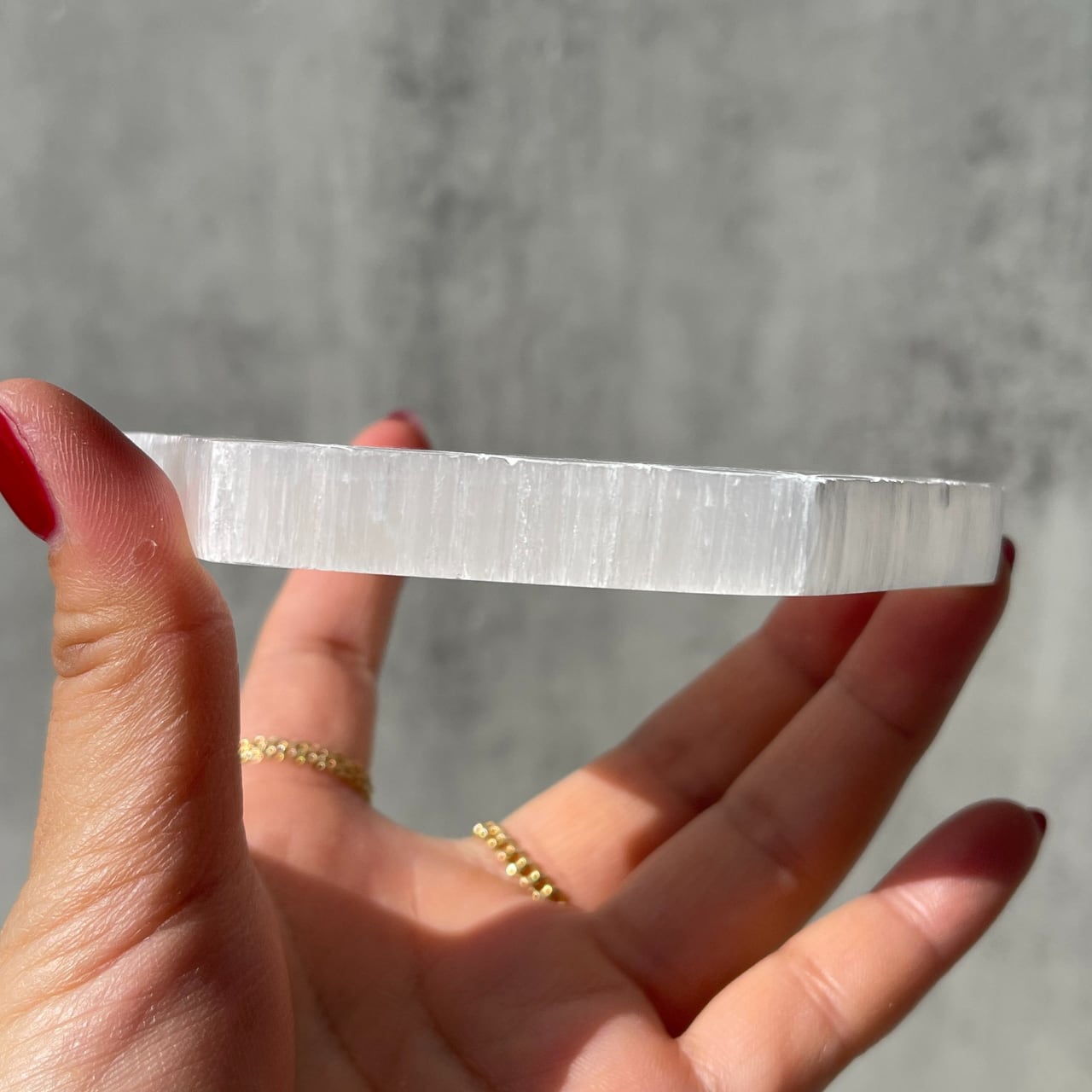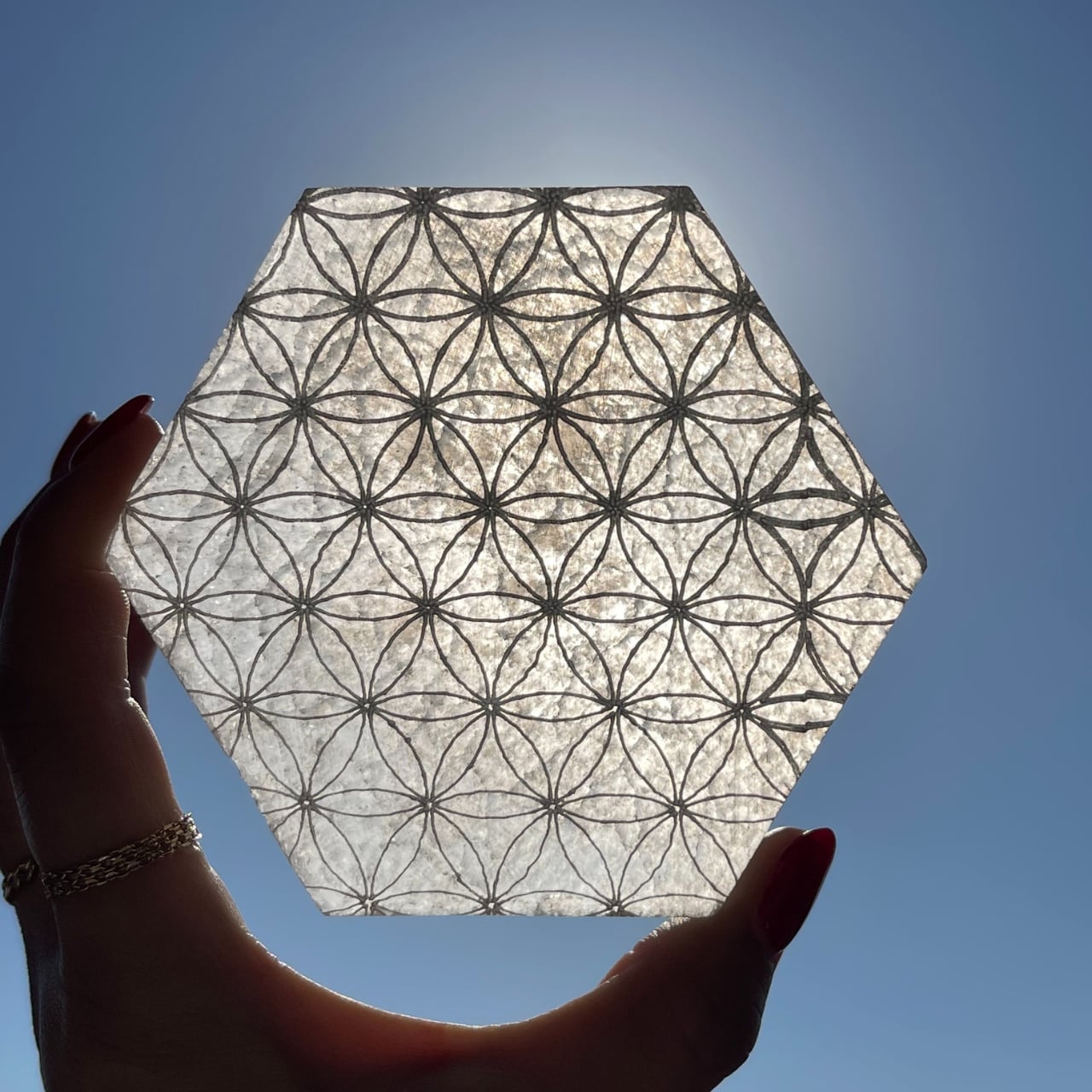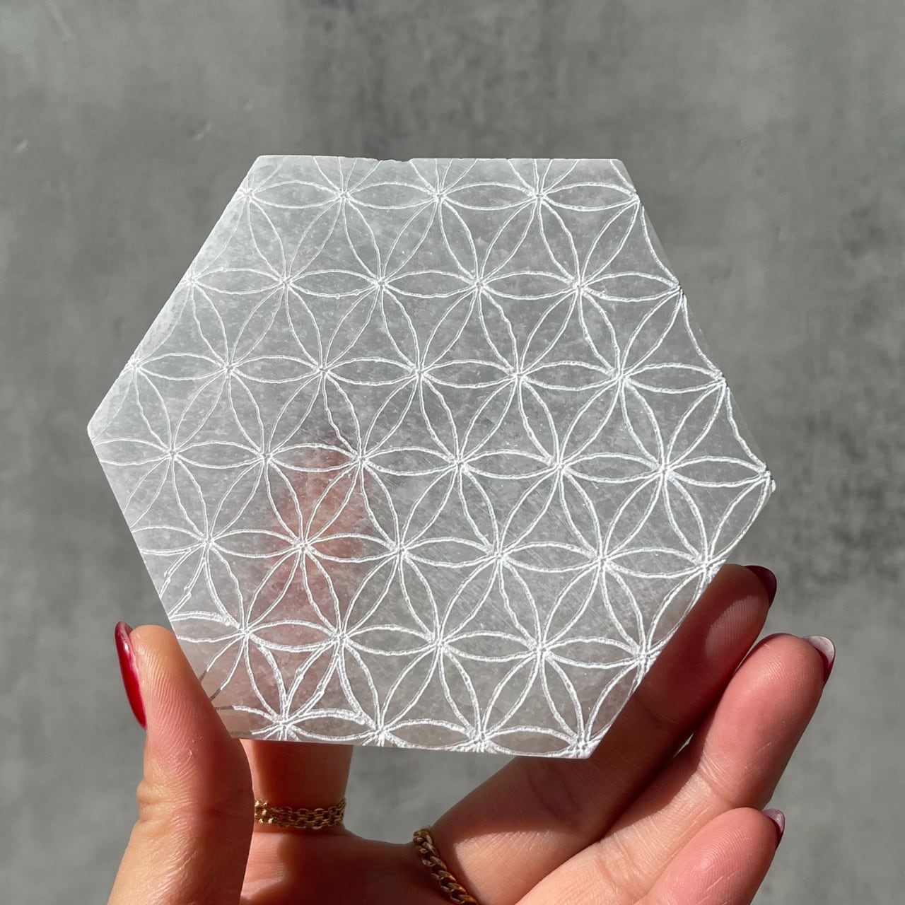ミルキーホワイトの美しさとパワフルなエネルギーを持つ、セレナイトのフラワーオブライフヘキサゴンプレート。