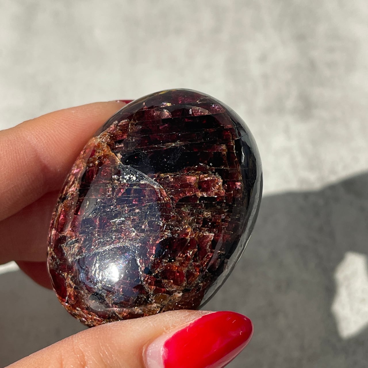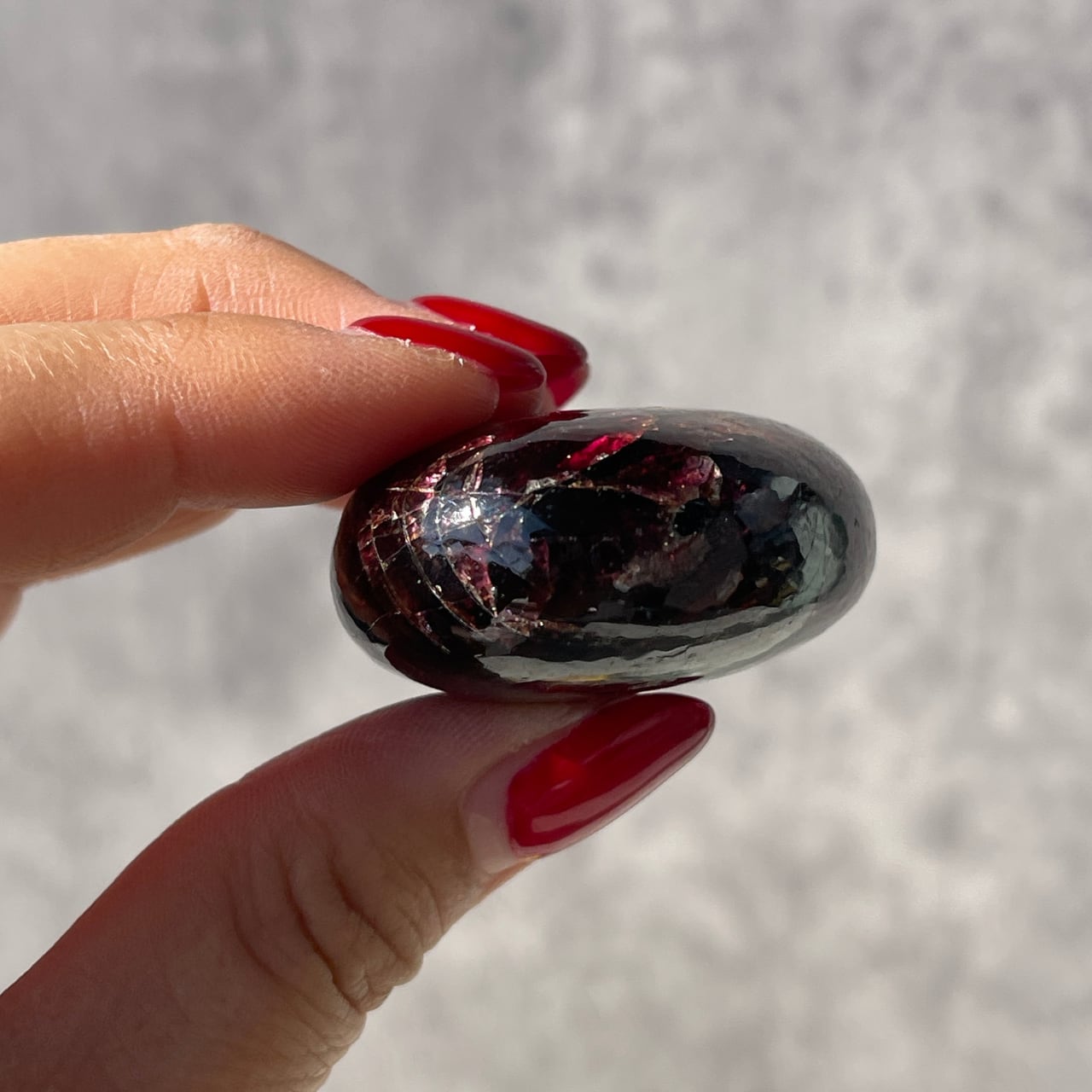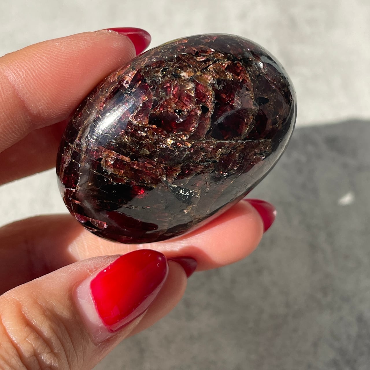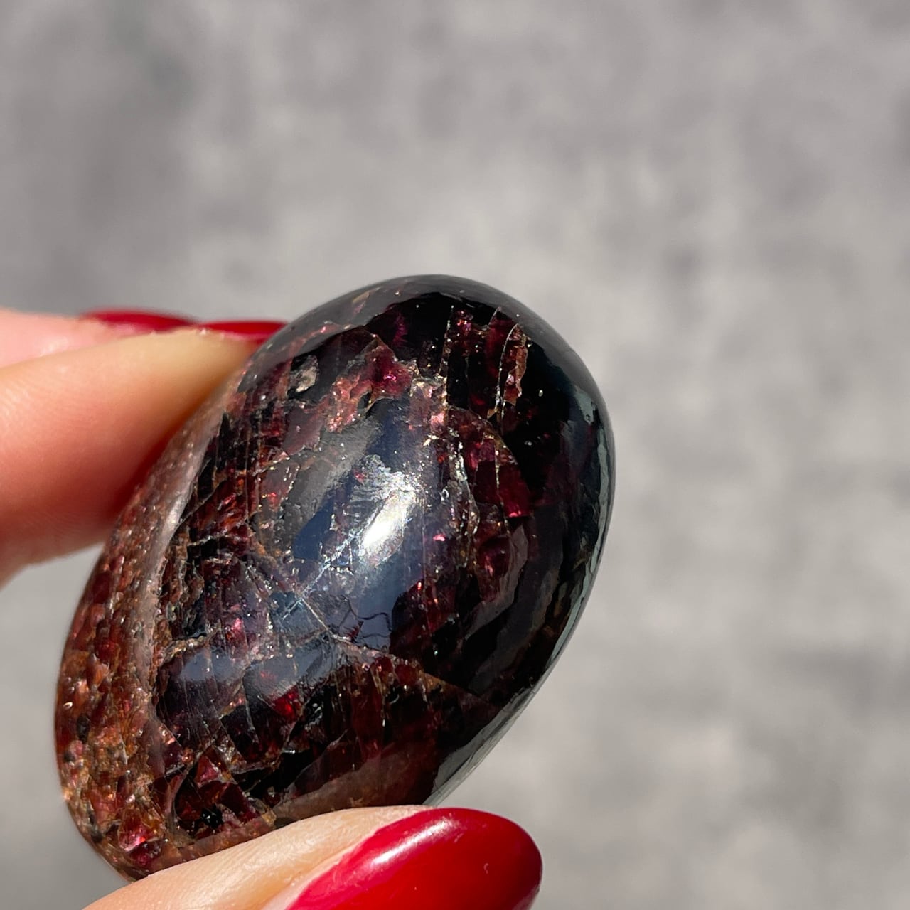 とても濃く深みのある赤色と紫色が絡み合った煌めきが美しい、インド産ロードライトガーネットのパームストーン。