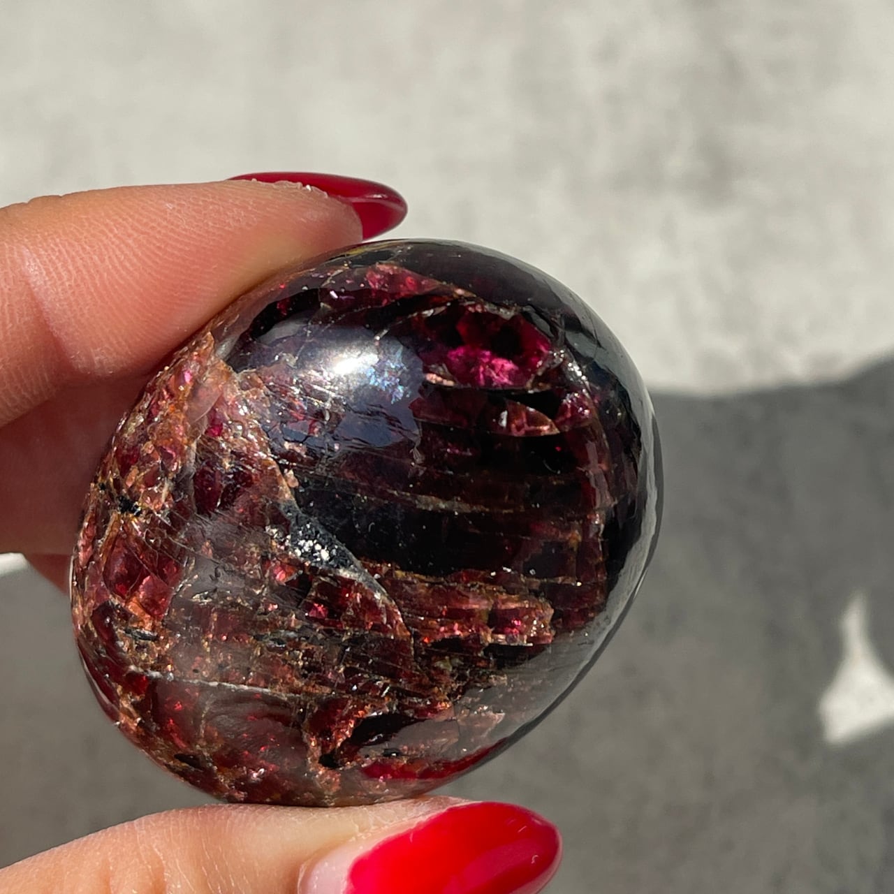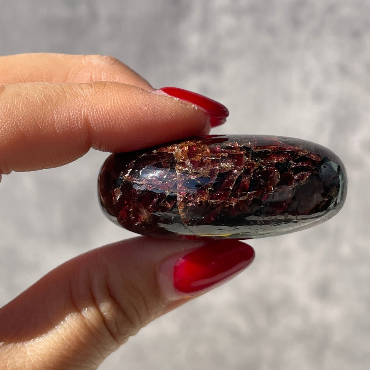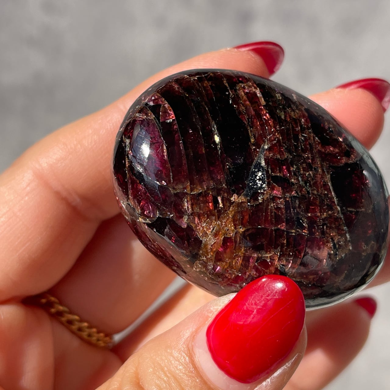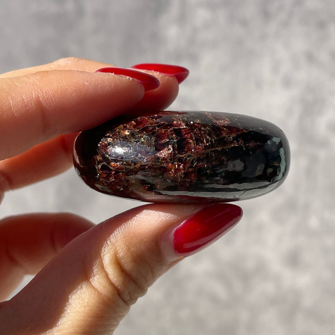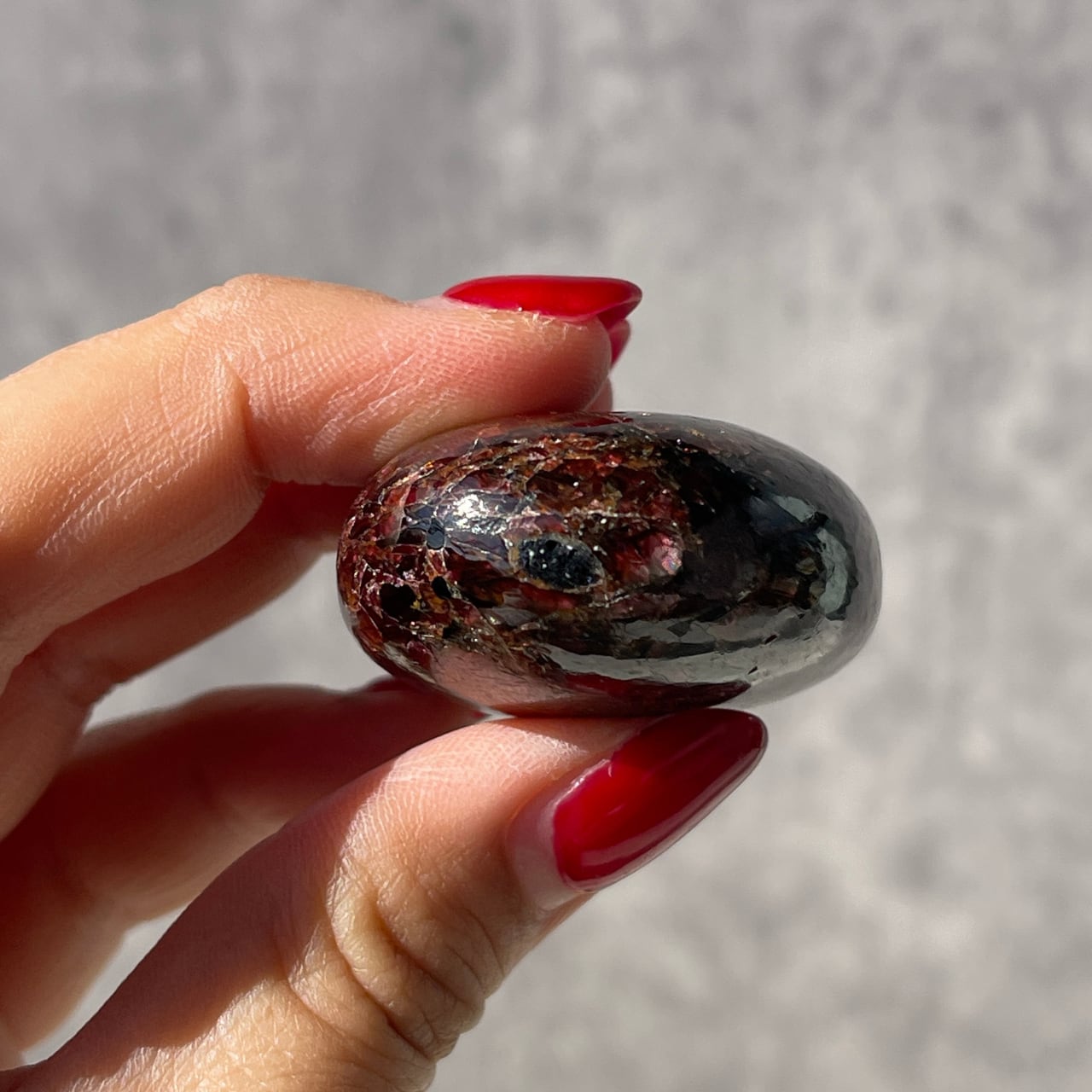 とても濃く深みのある赤色と紫色が絡み合った煌めきが美しい、インド産ロードライトガーネットのパームストーン。