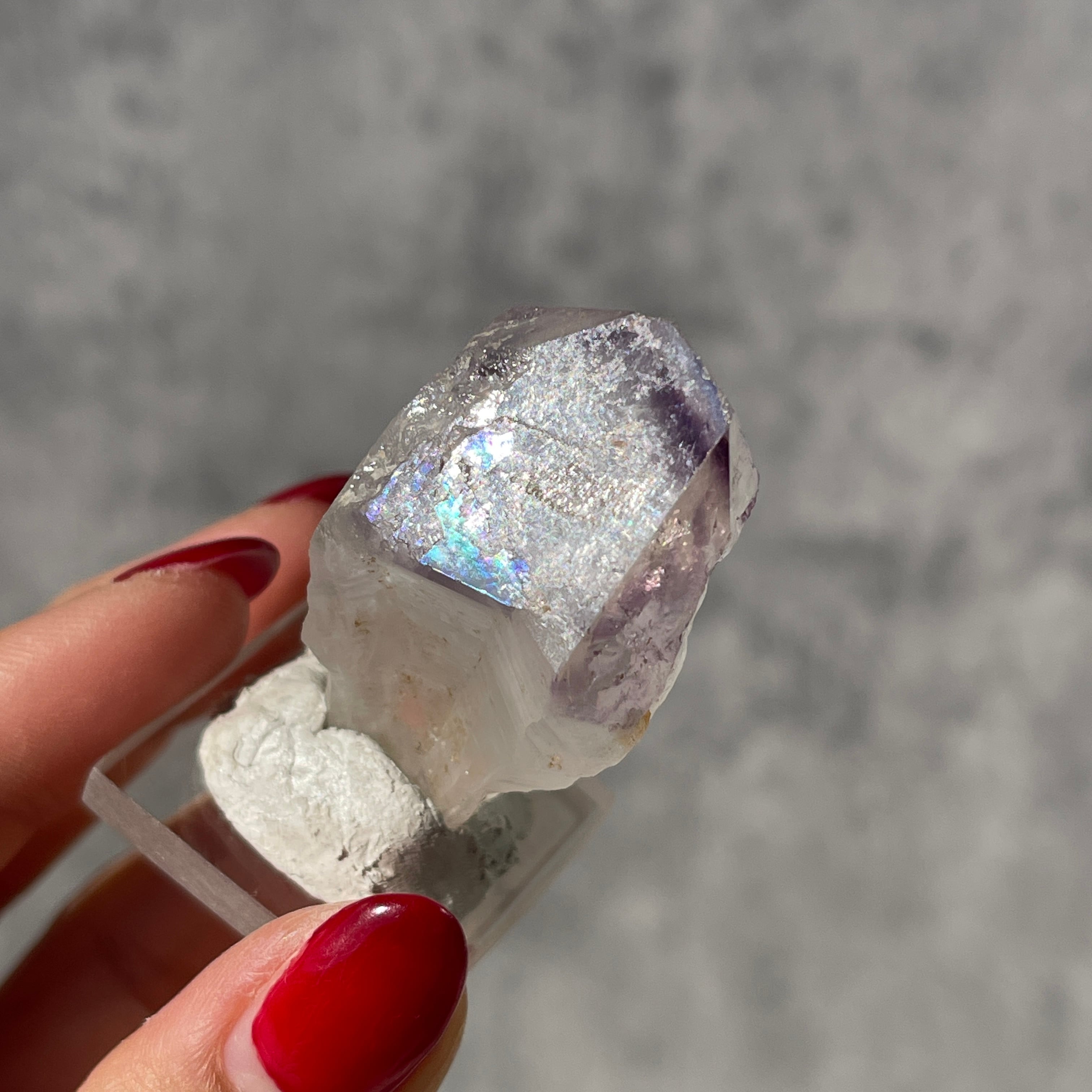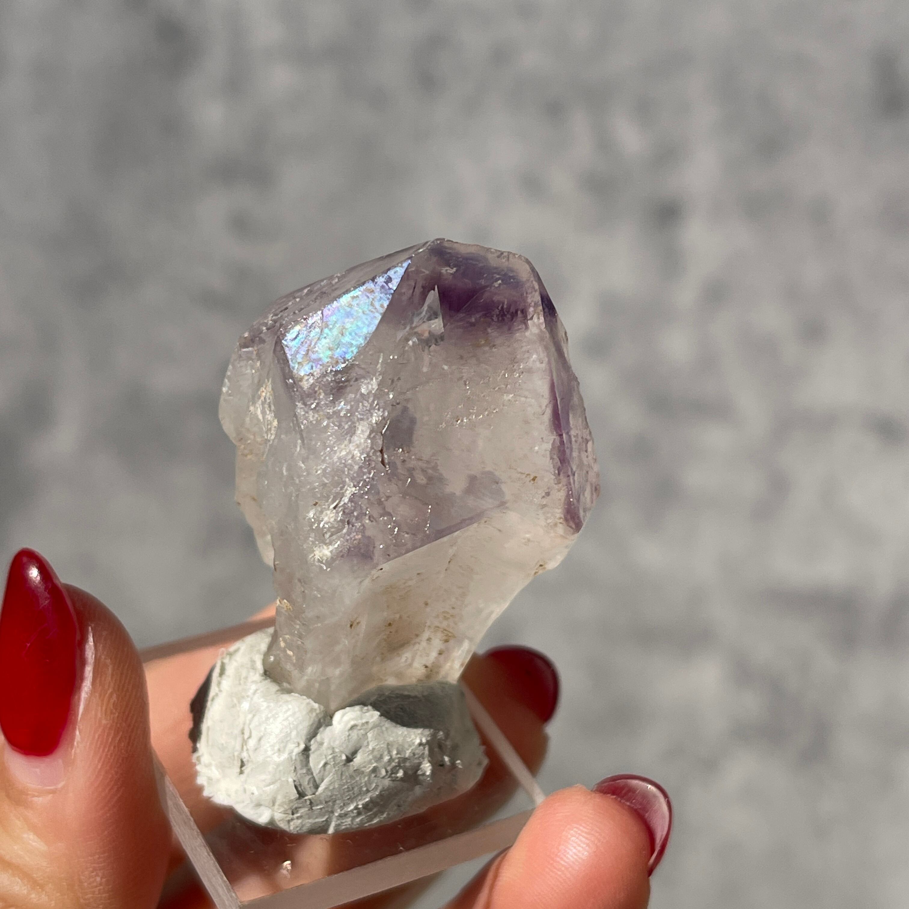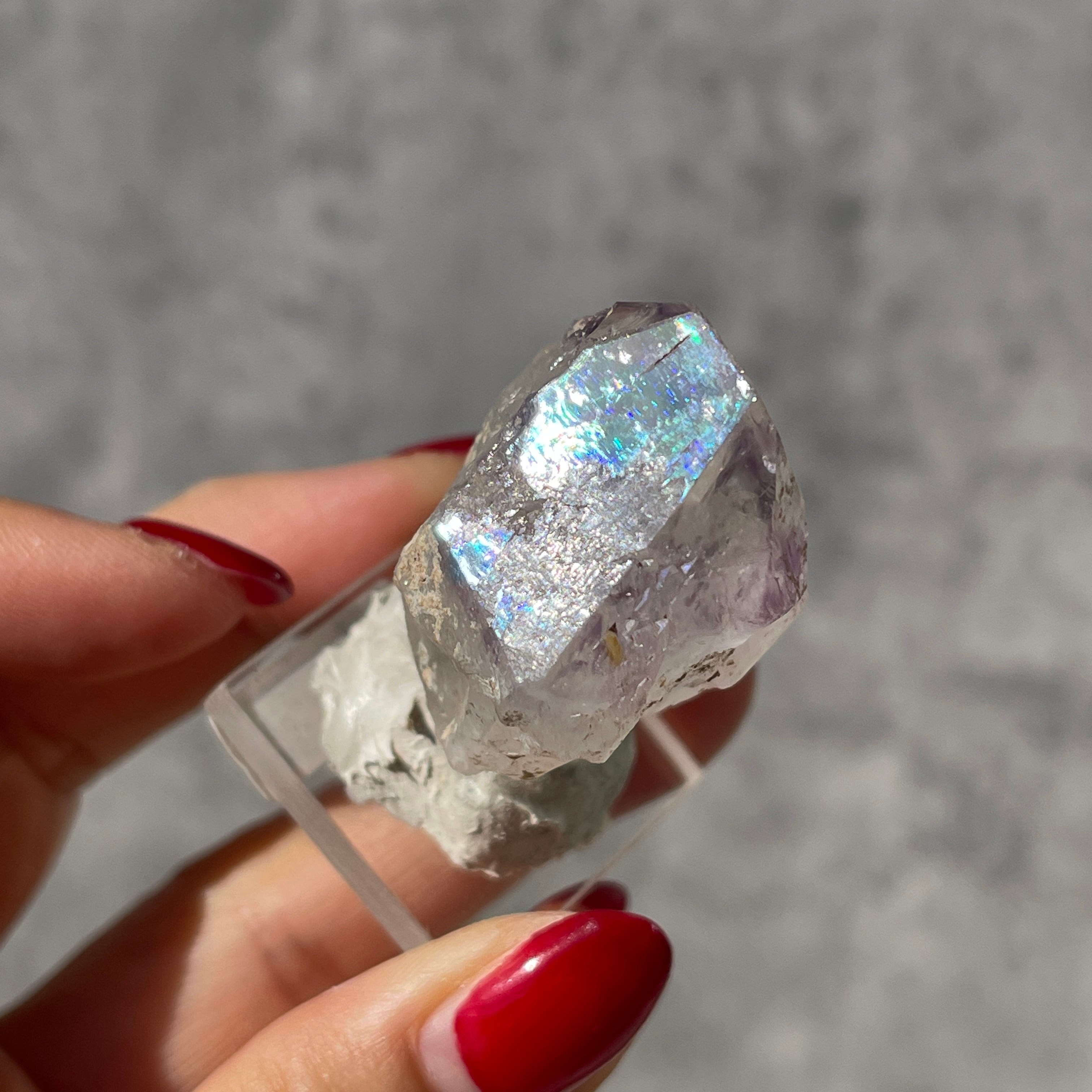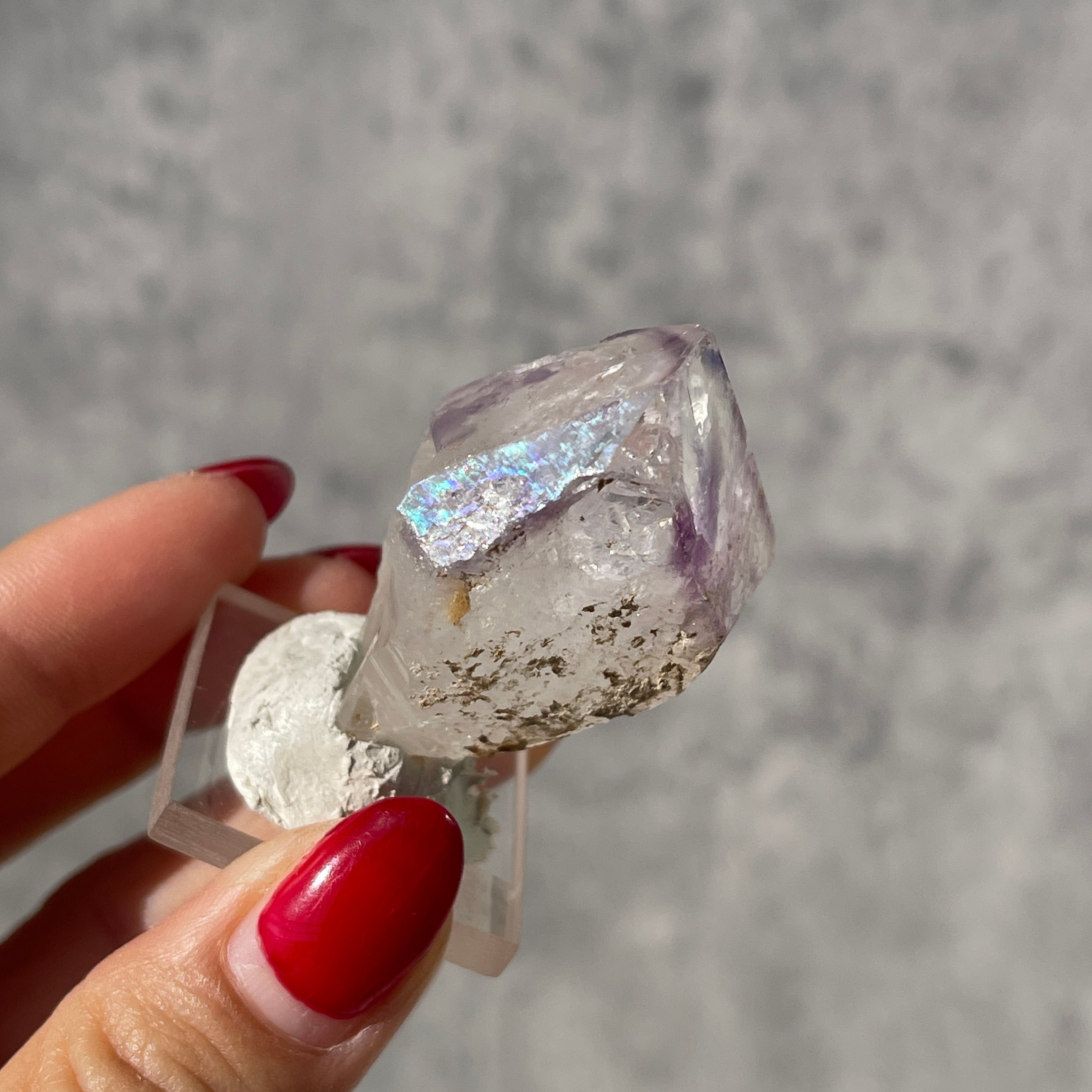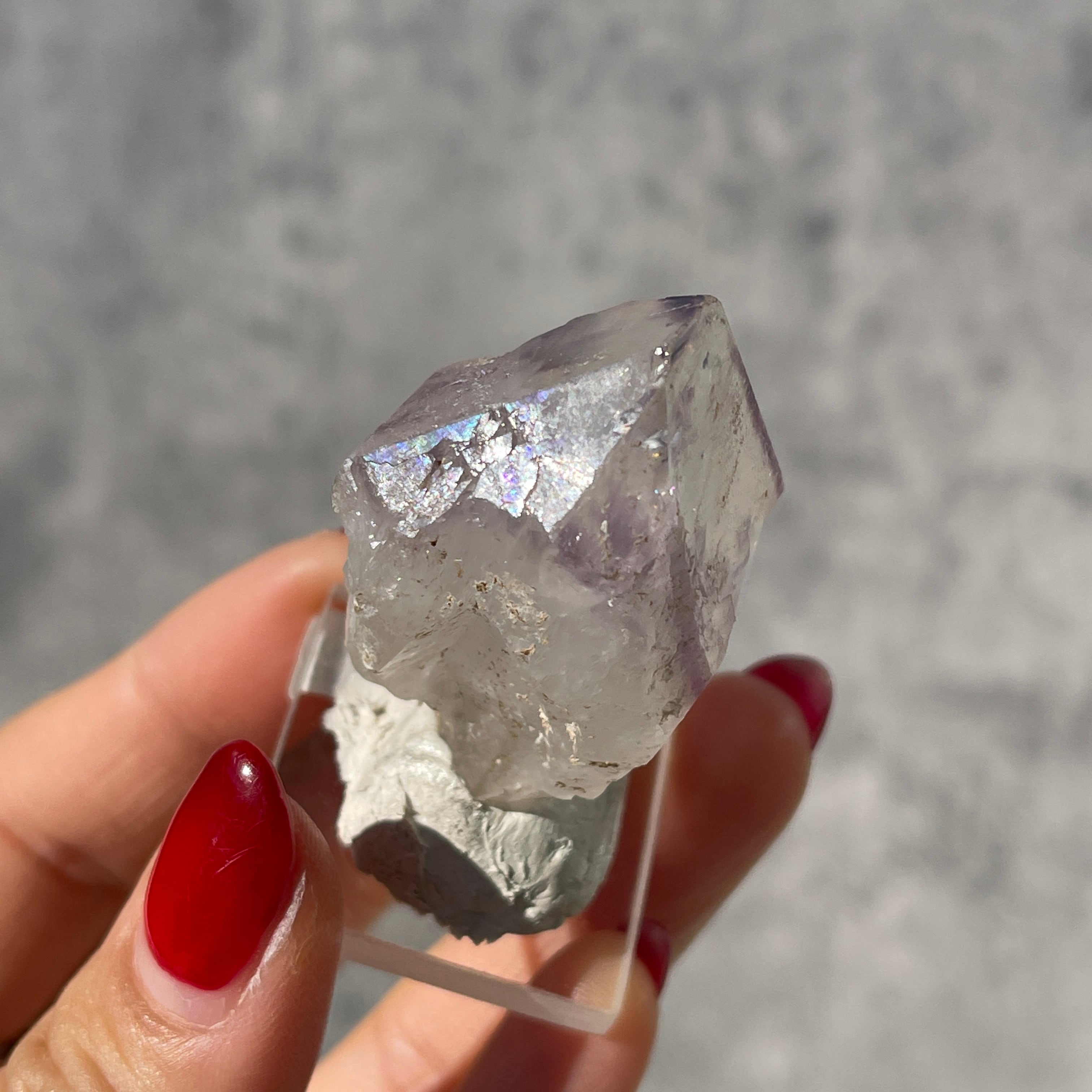 こちらは マダガスカル産アメジスト の中でも、結晶表面に 天然のイリデッセンス(虹色の干渉色) が現れている、極めて稀な原石です。