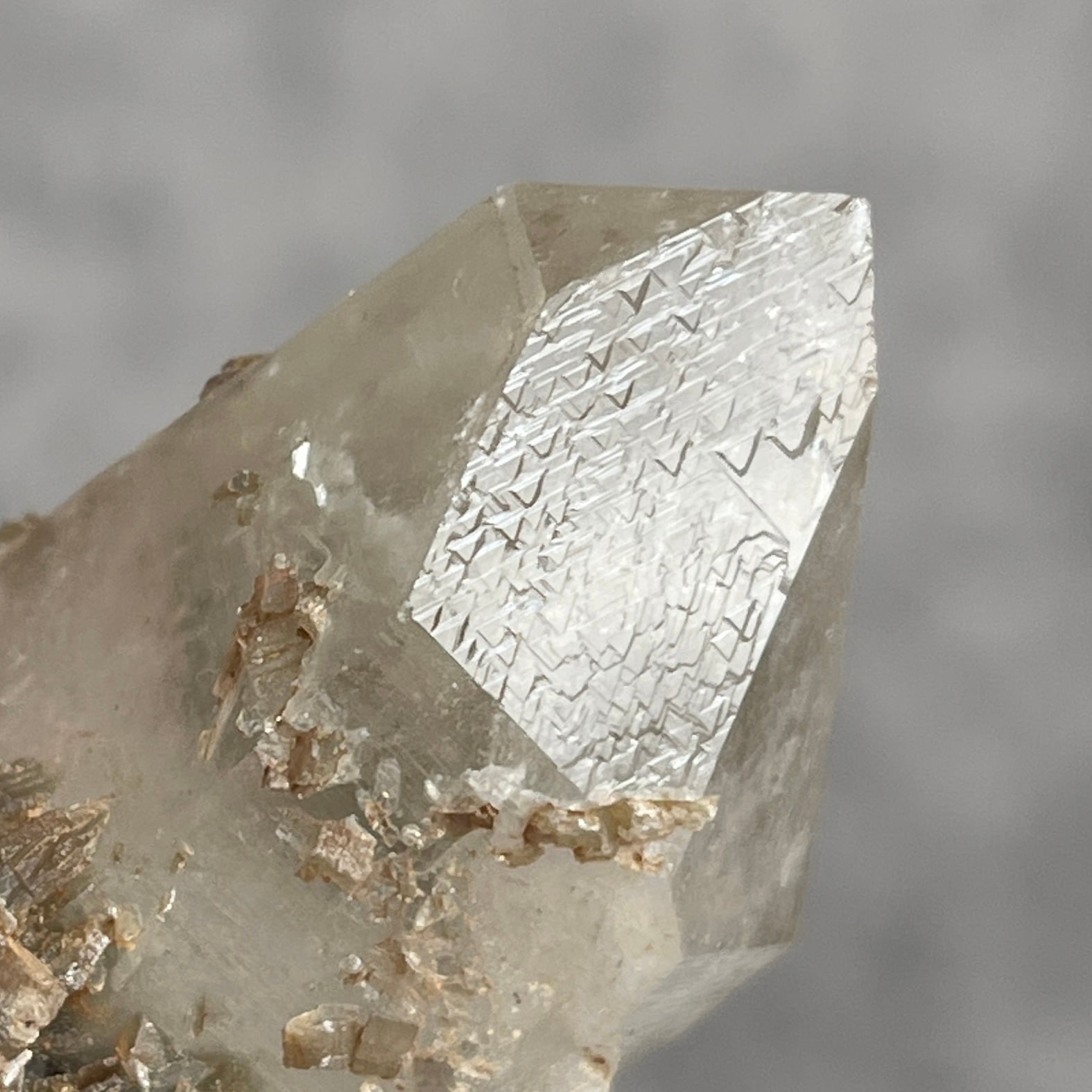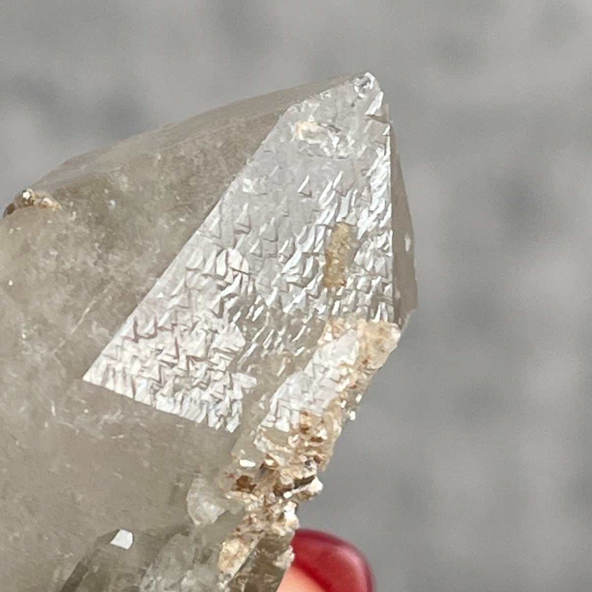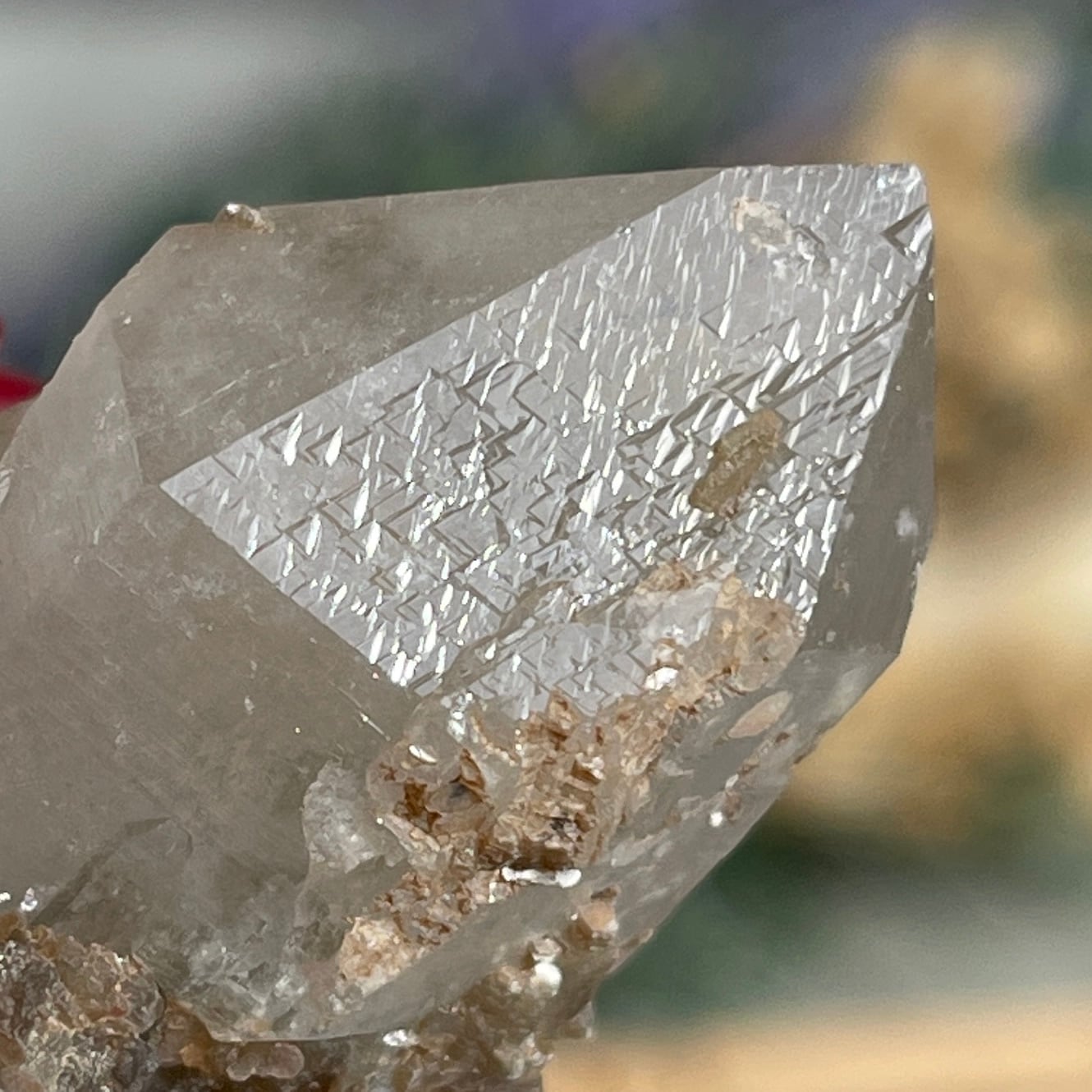 本品の最大の特徴は、錐面(先端の面)3面すべてに確認できる、正三角形状の成長構造。