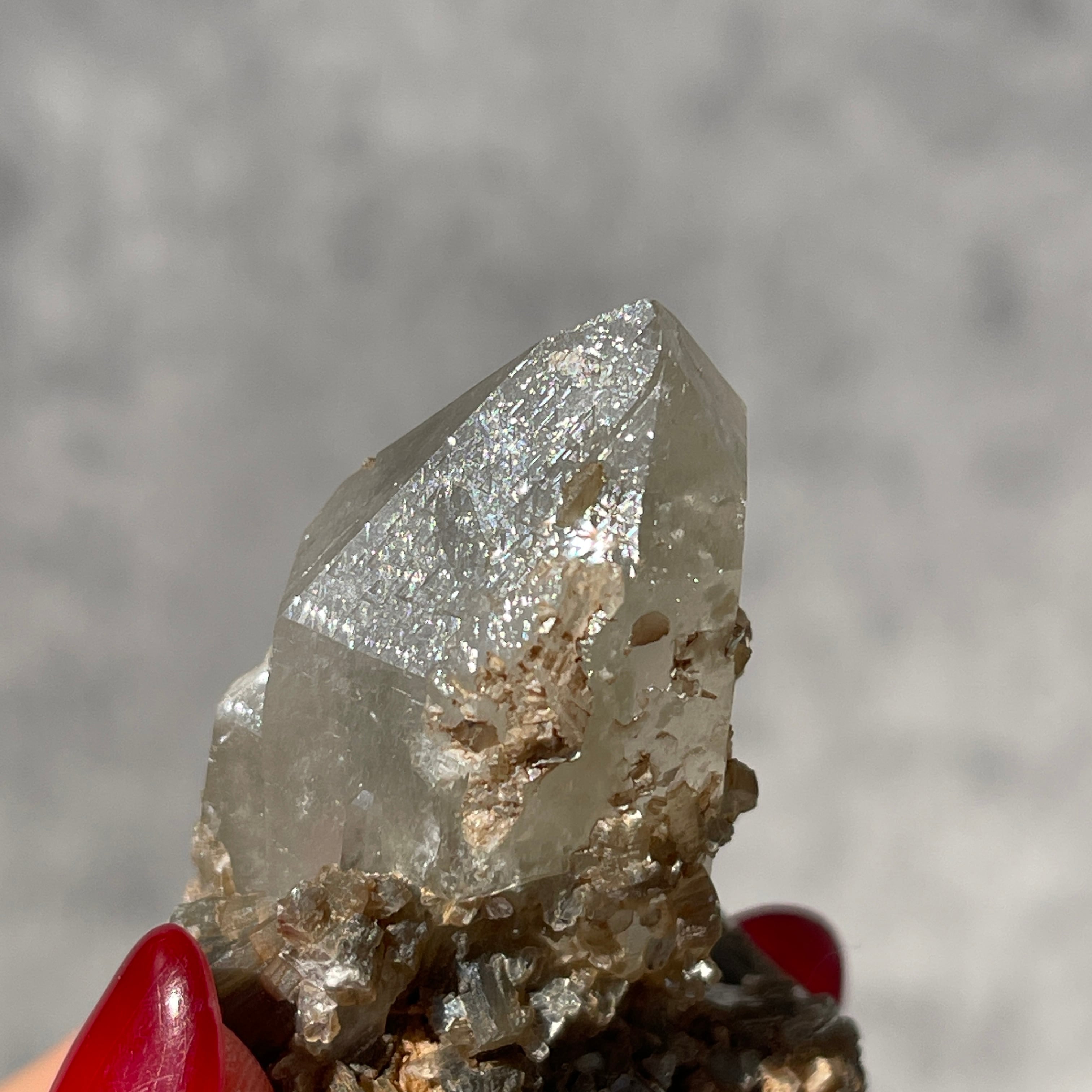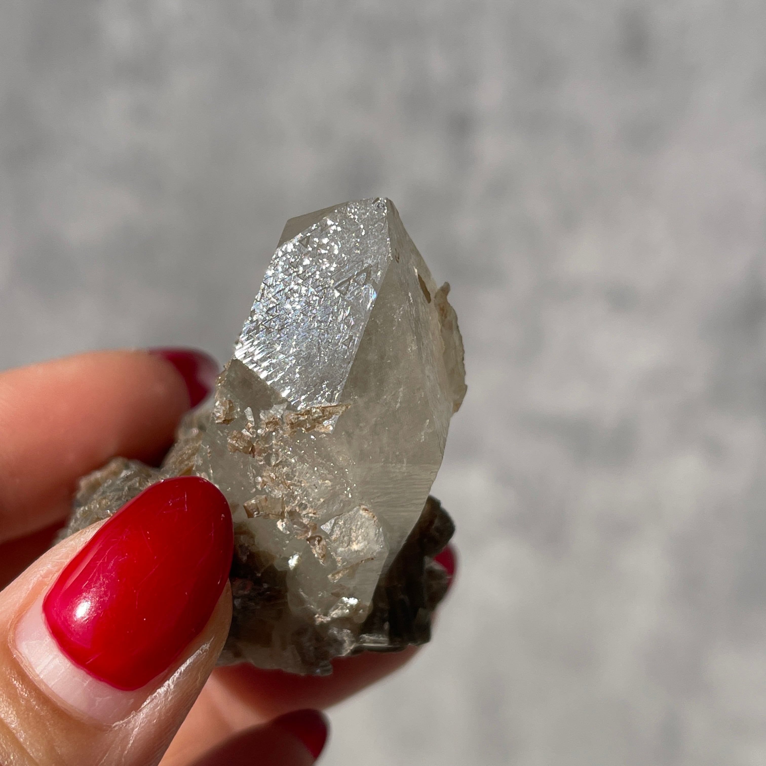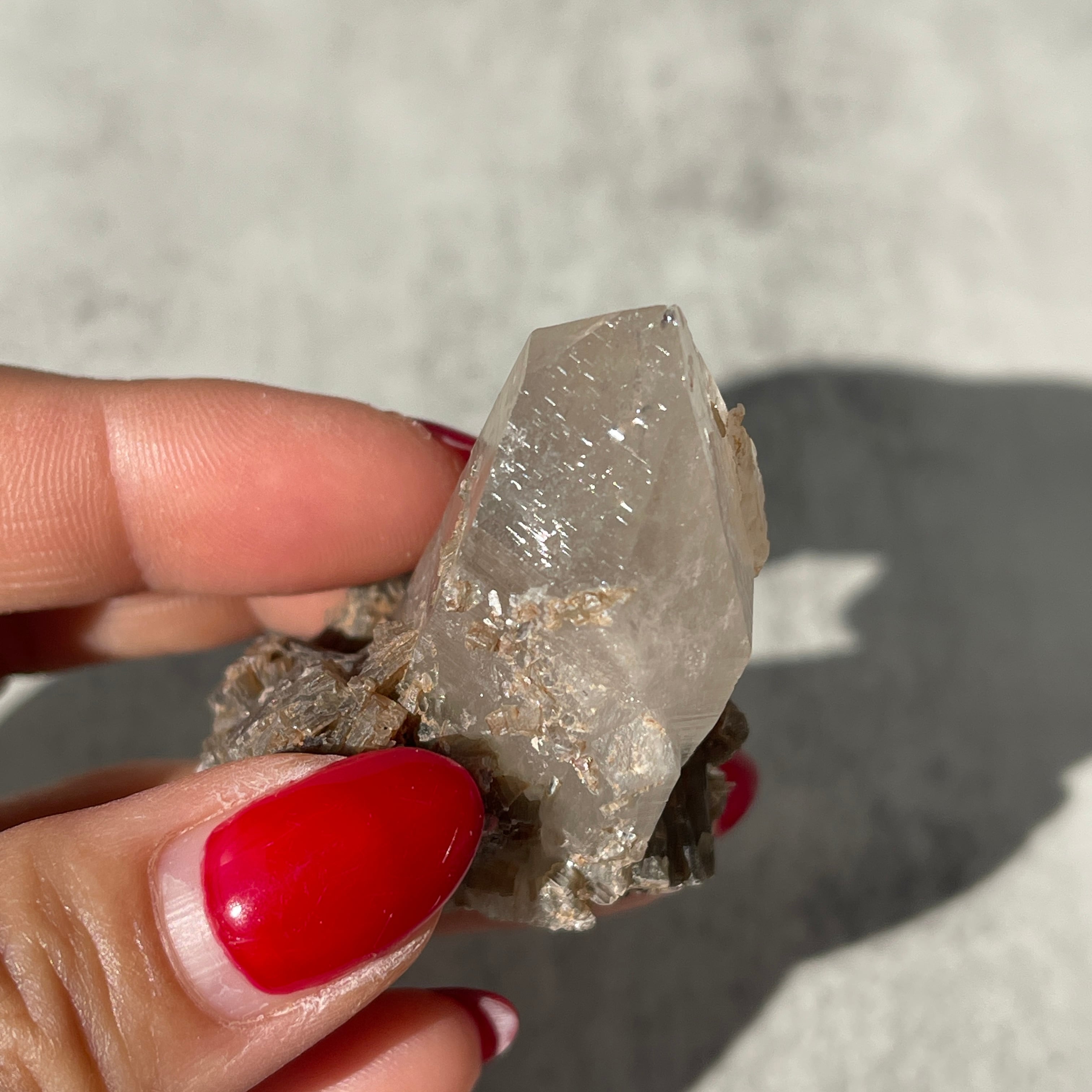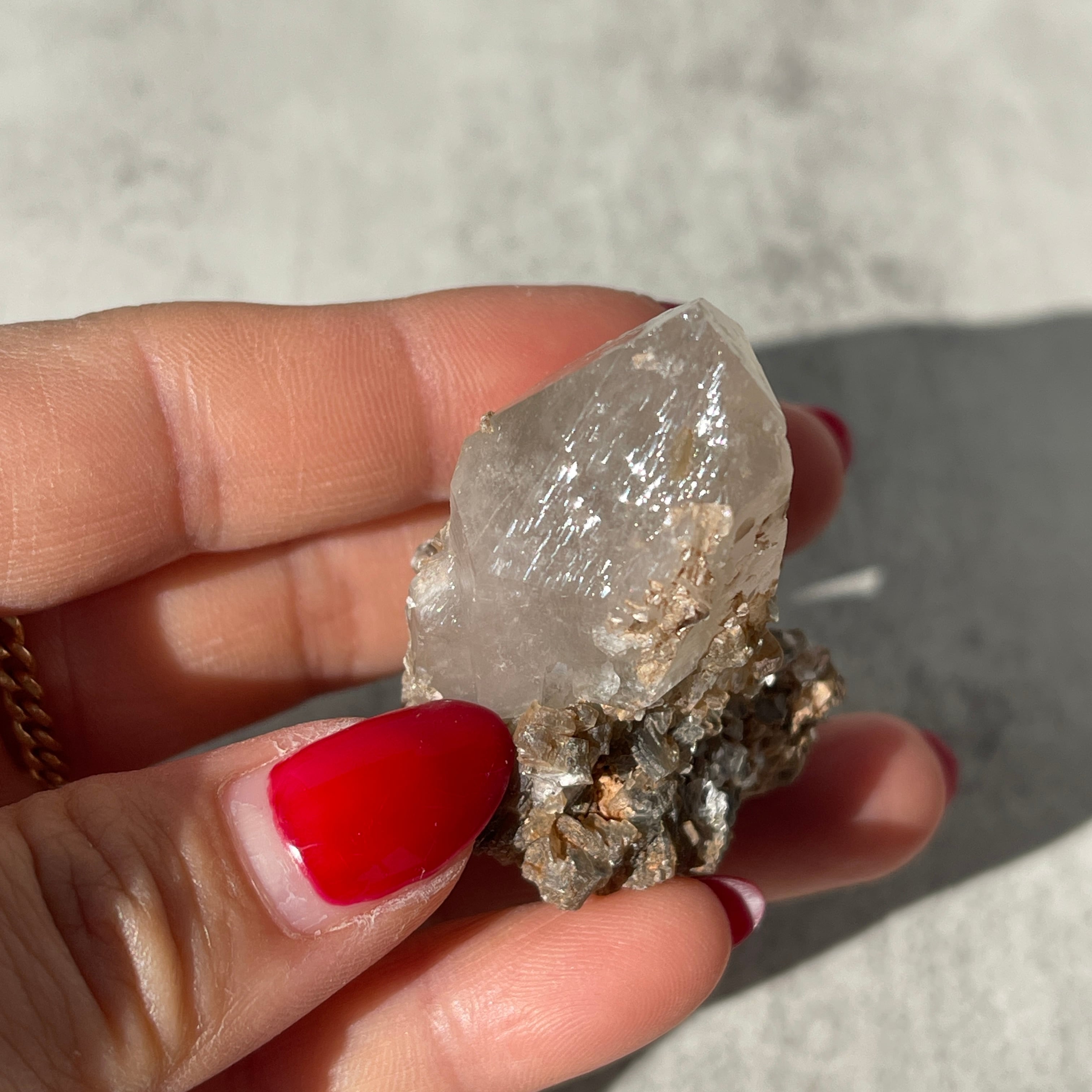 マダガスカル産のクォーツに、マイカが共生した一点物の原石です。