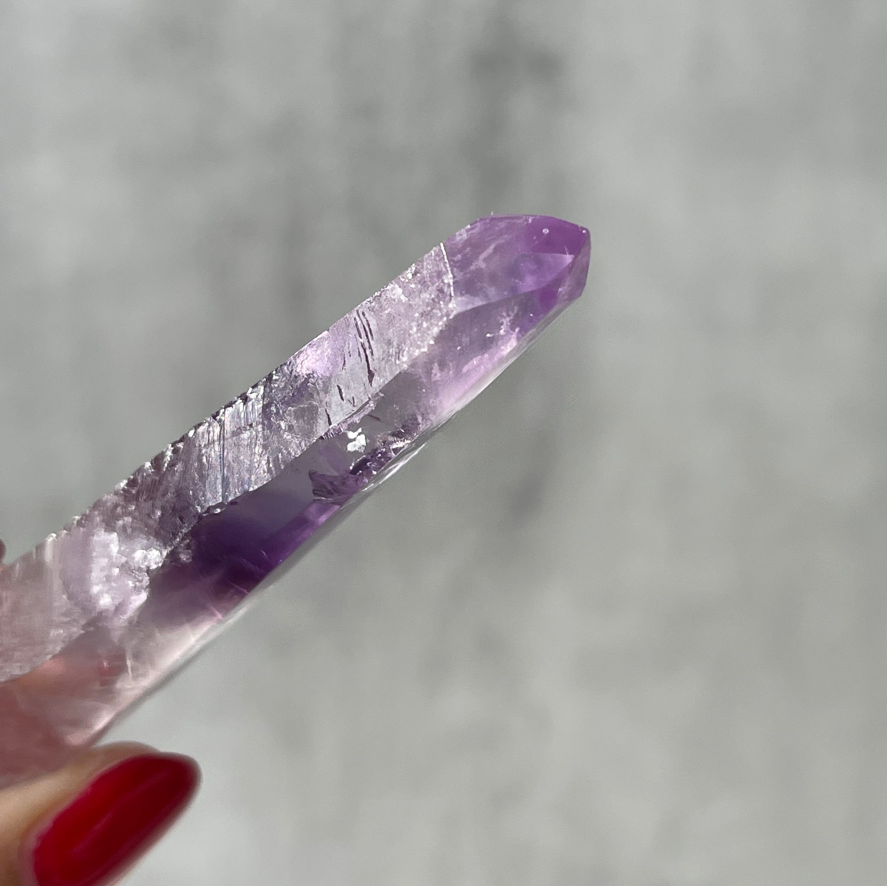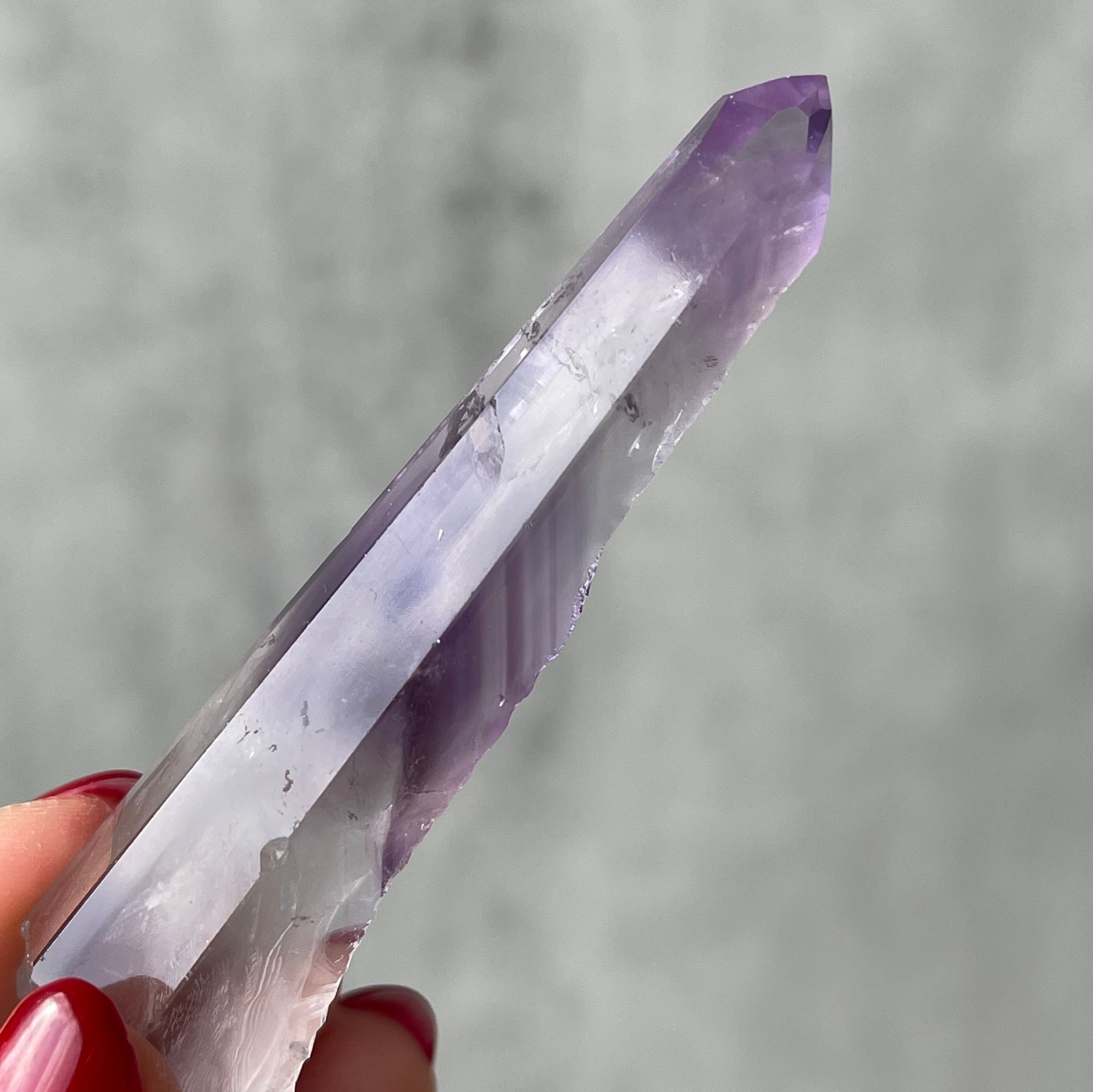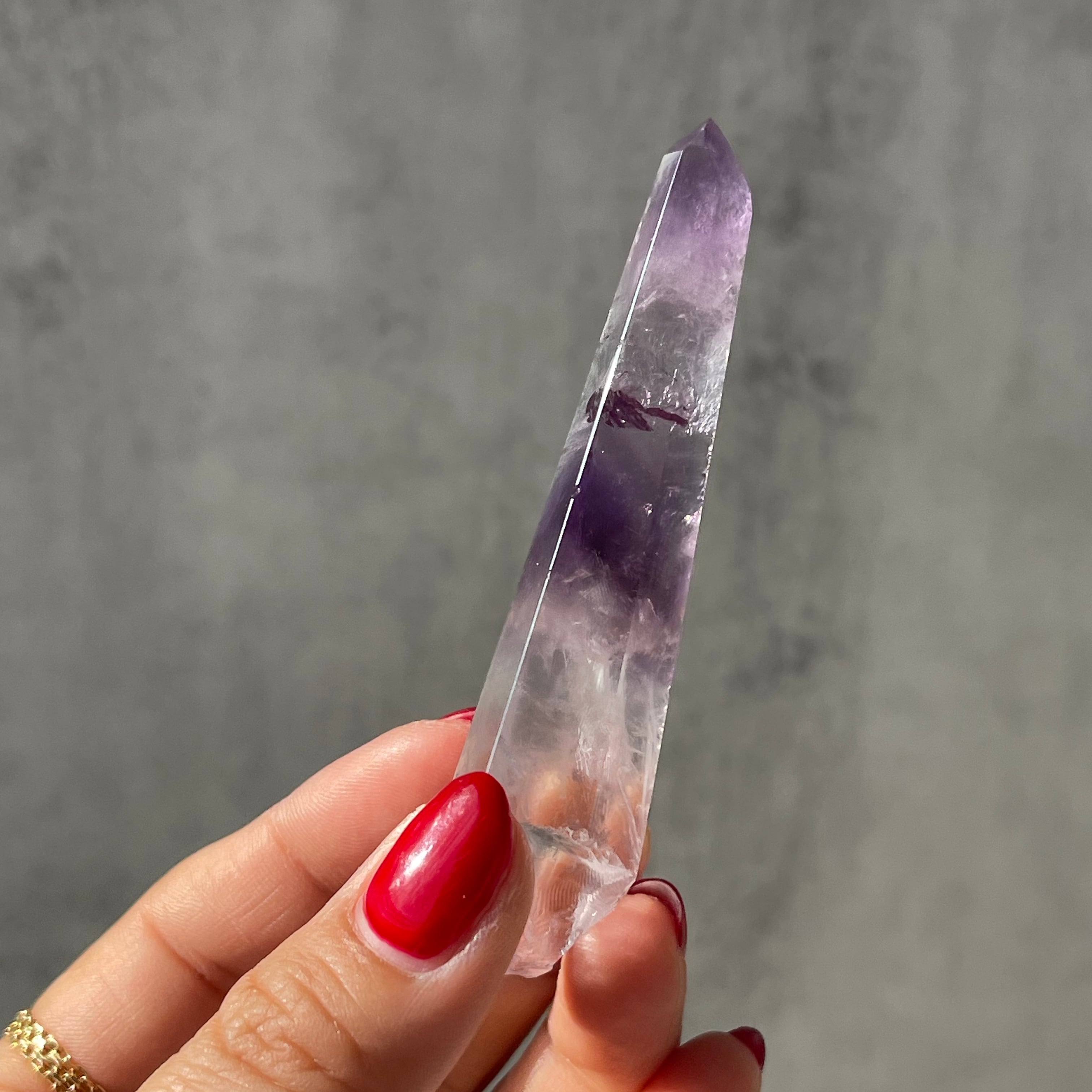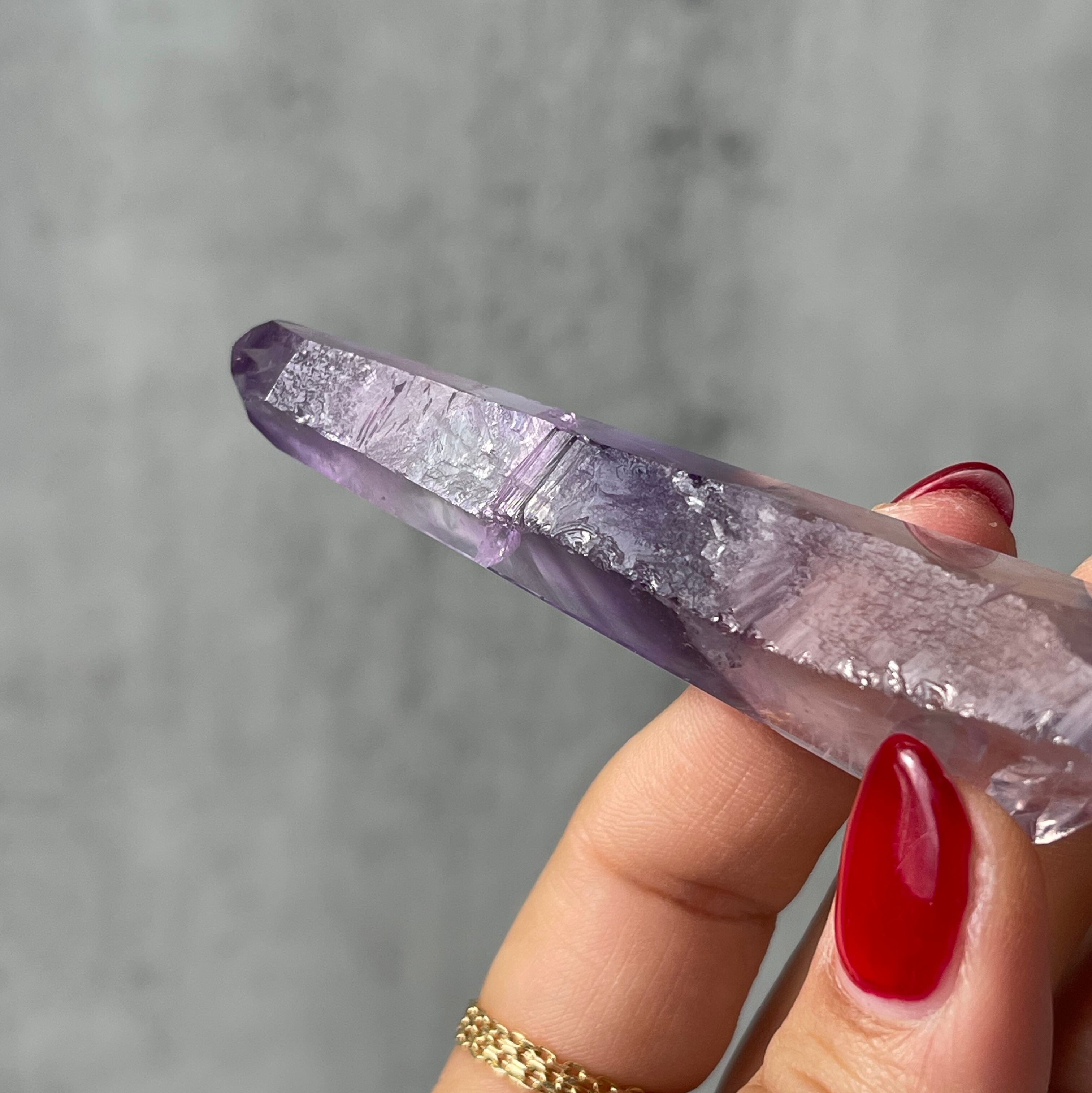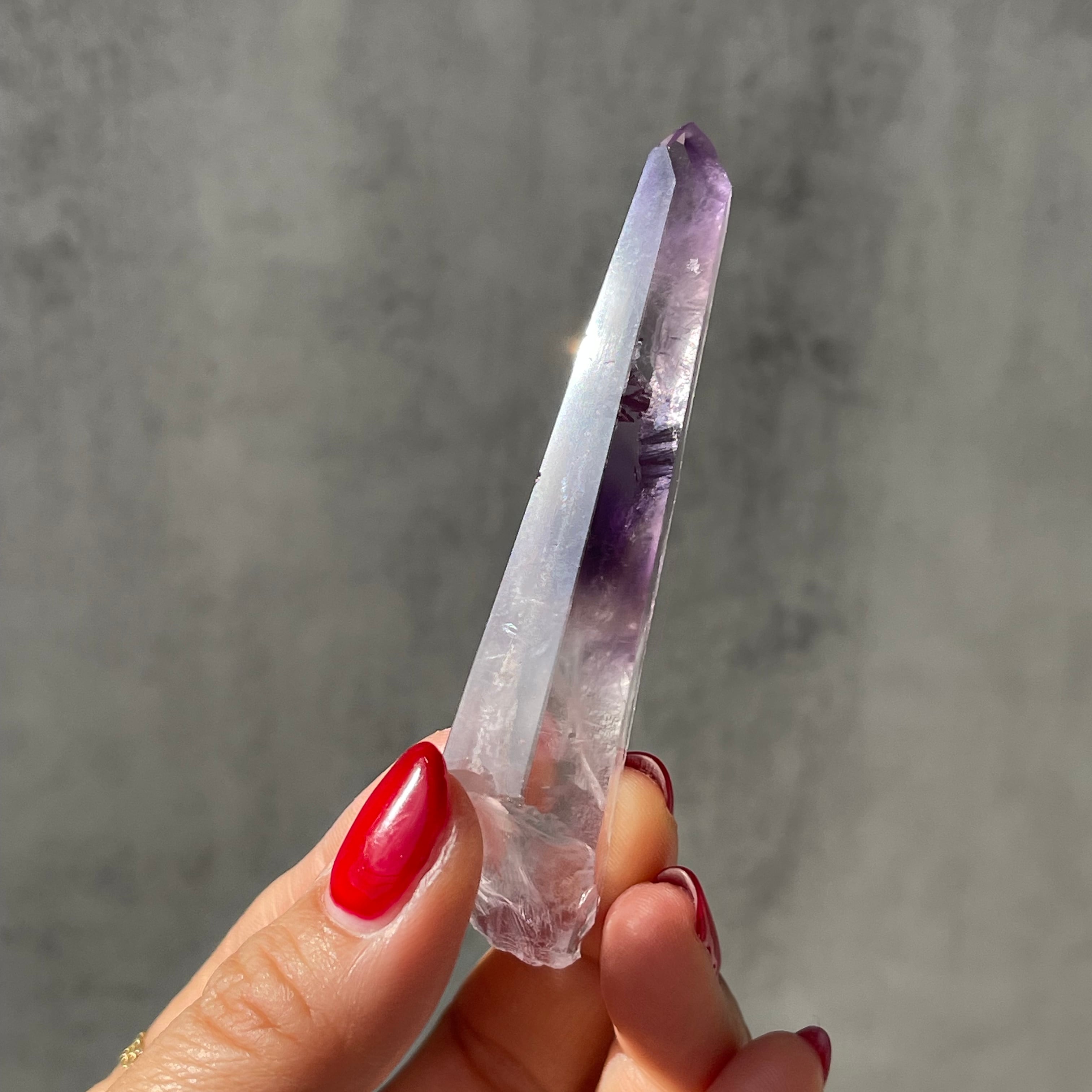 透明感のある水晶の内部に、紫色のファントムが層状に現れたポリッシュポイント。