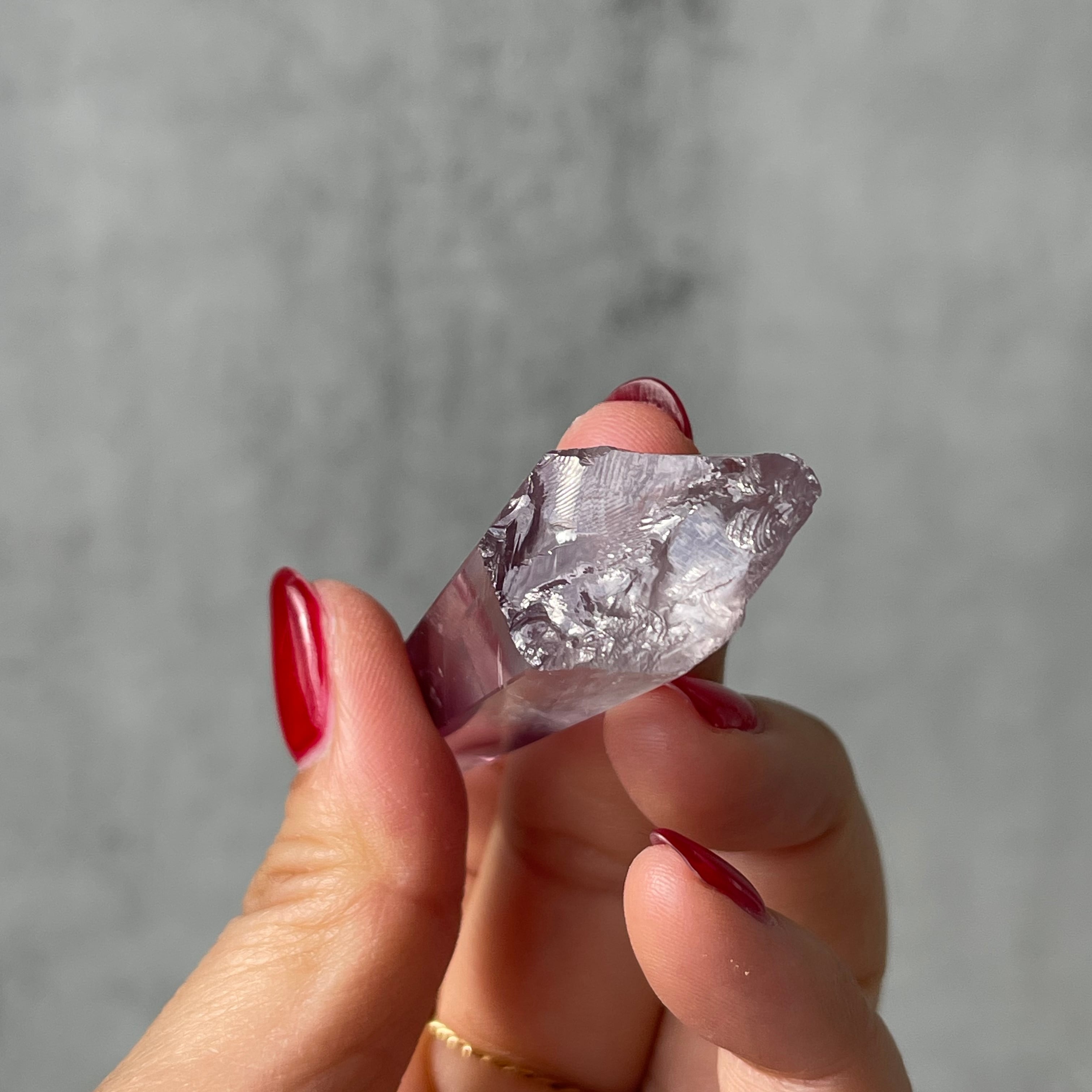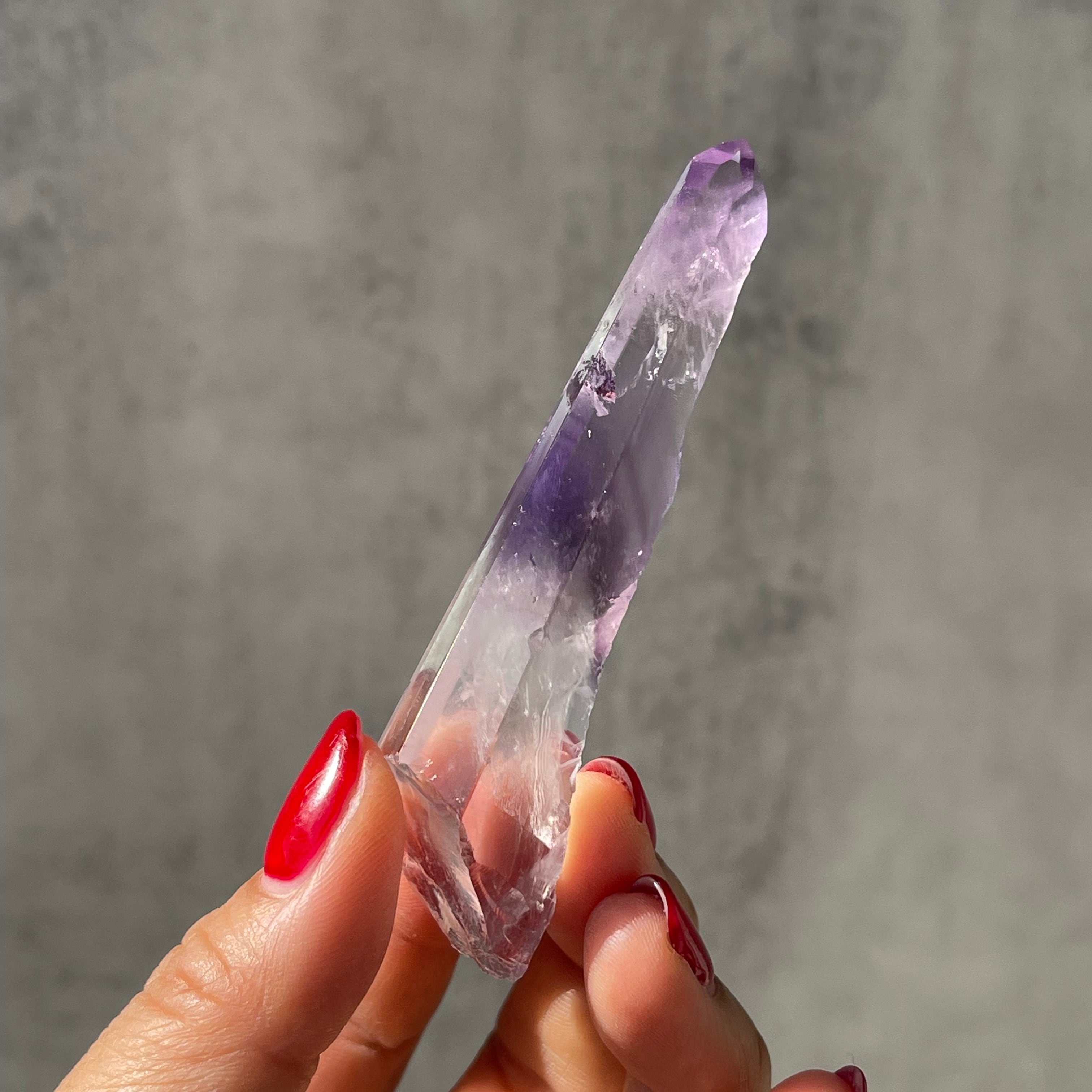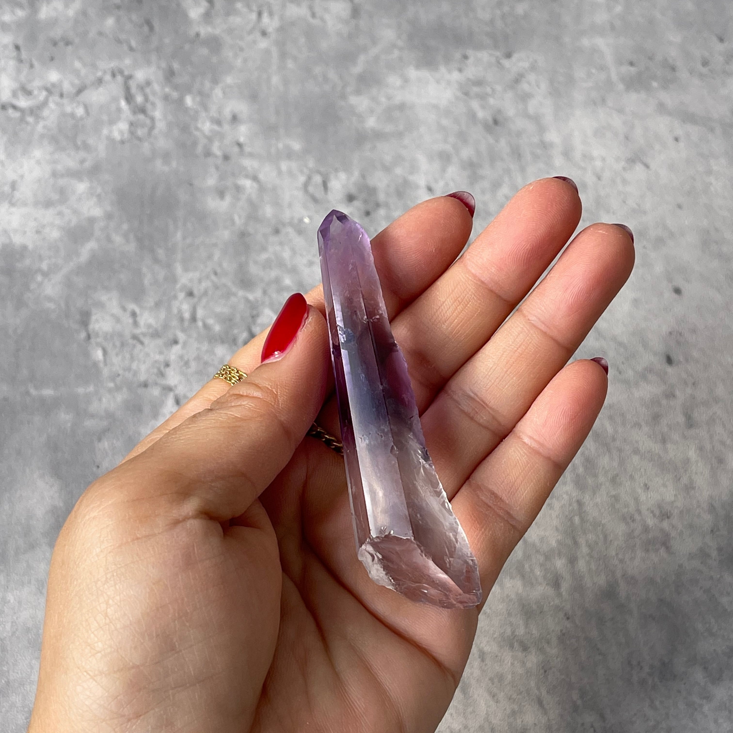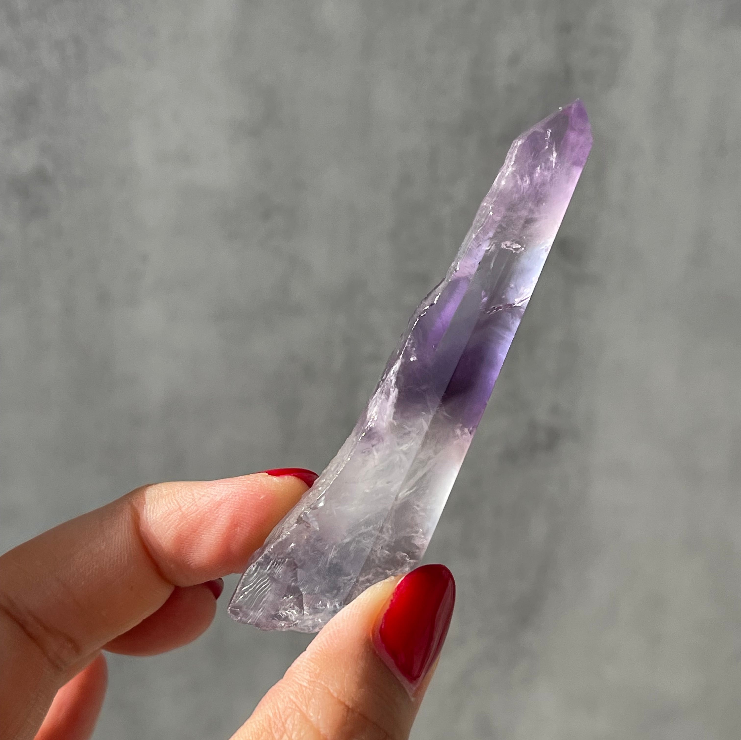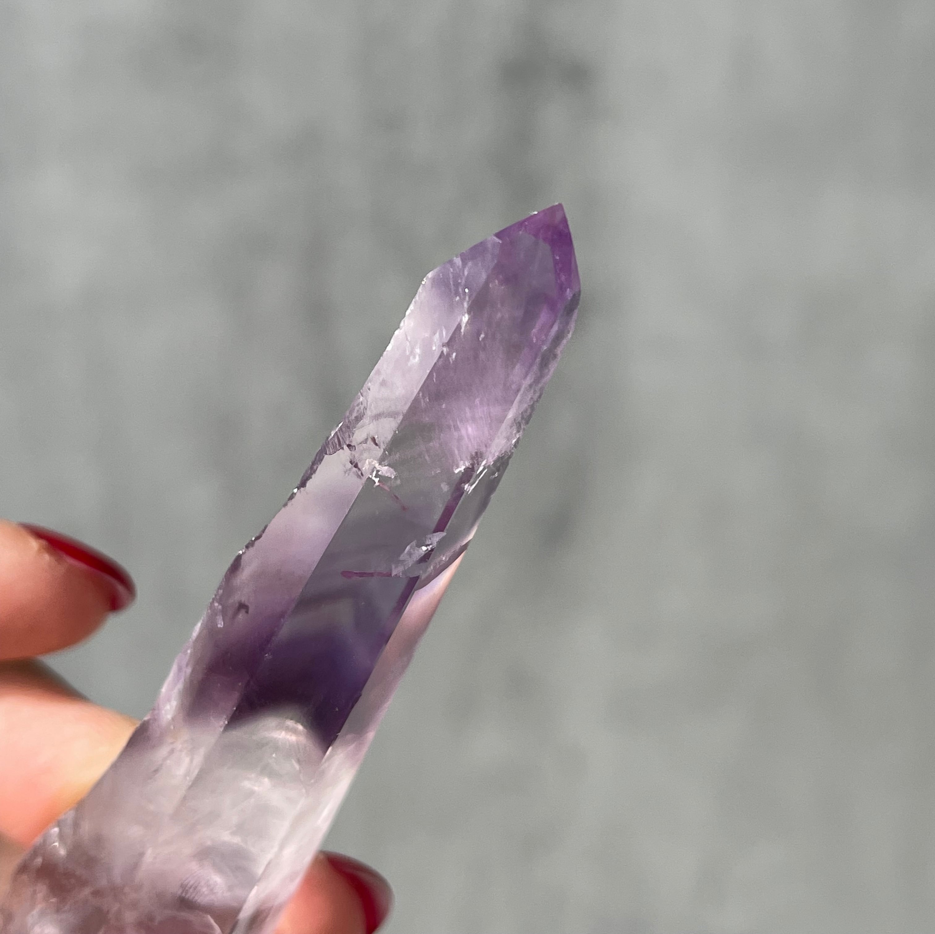 透明感のある水晶の内部に、紫色のファントムが層状に現れたポリッシュポイント。