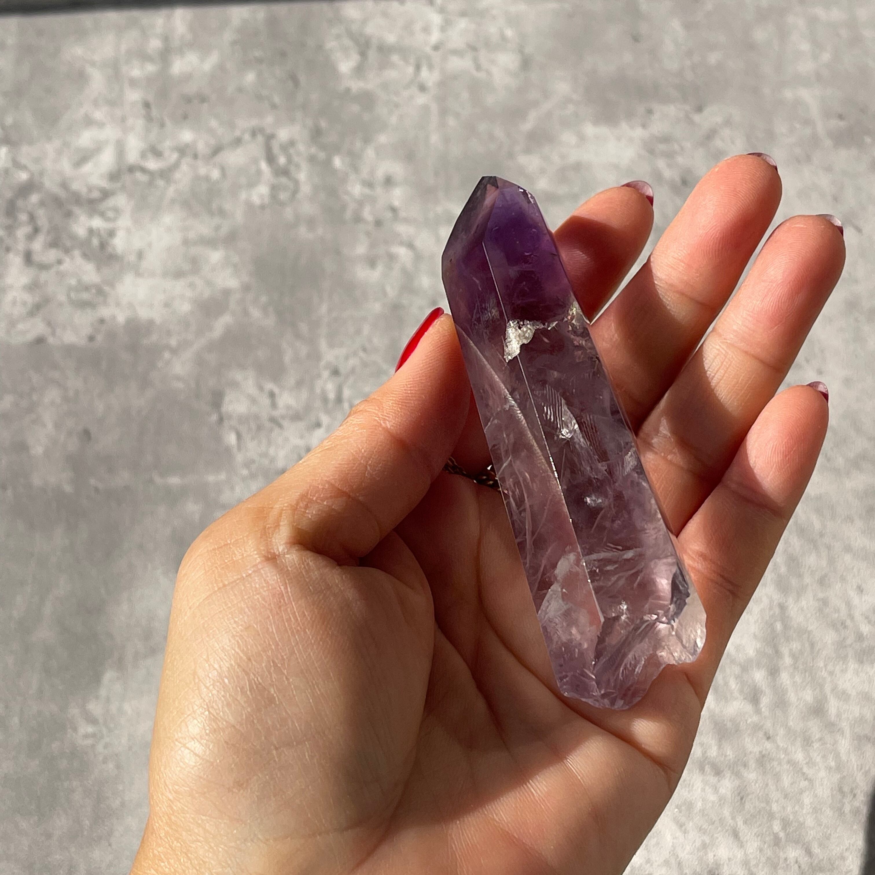 自然な結晶形を保ちつつ、全面を研磨することで内部の紫が際立っています。