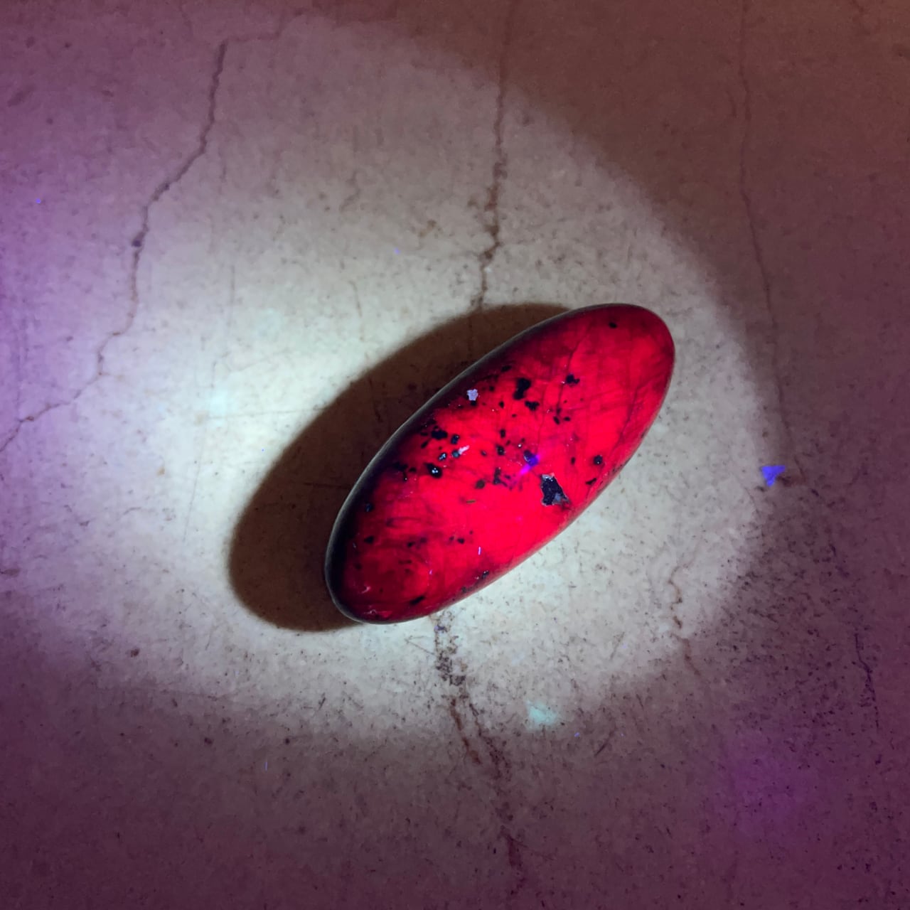 この石にブラックライトを当てると、美しい赤色の表情を覗かせます。