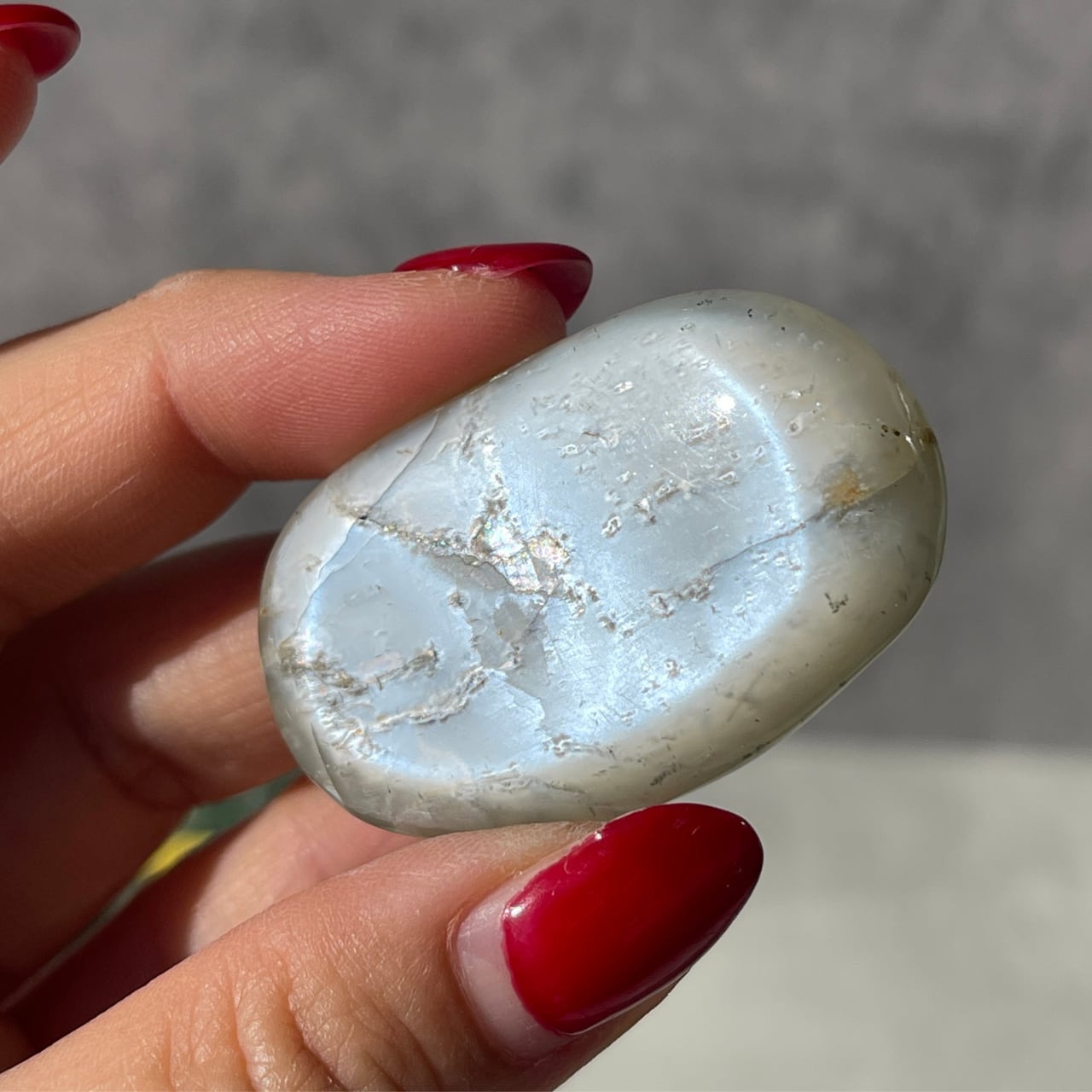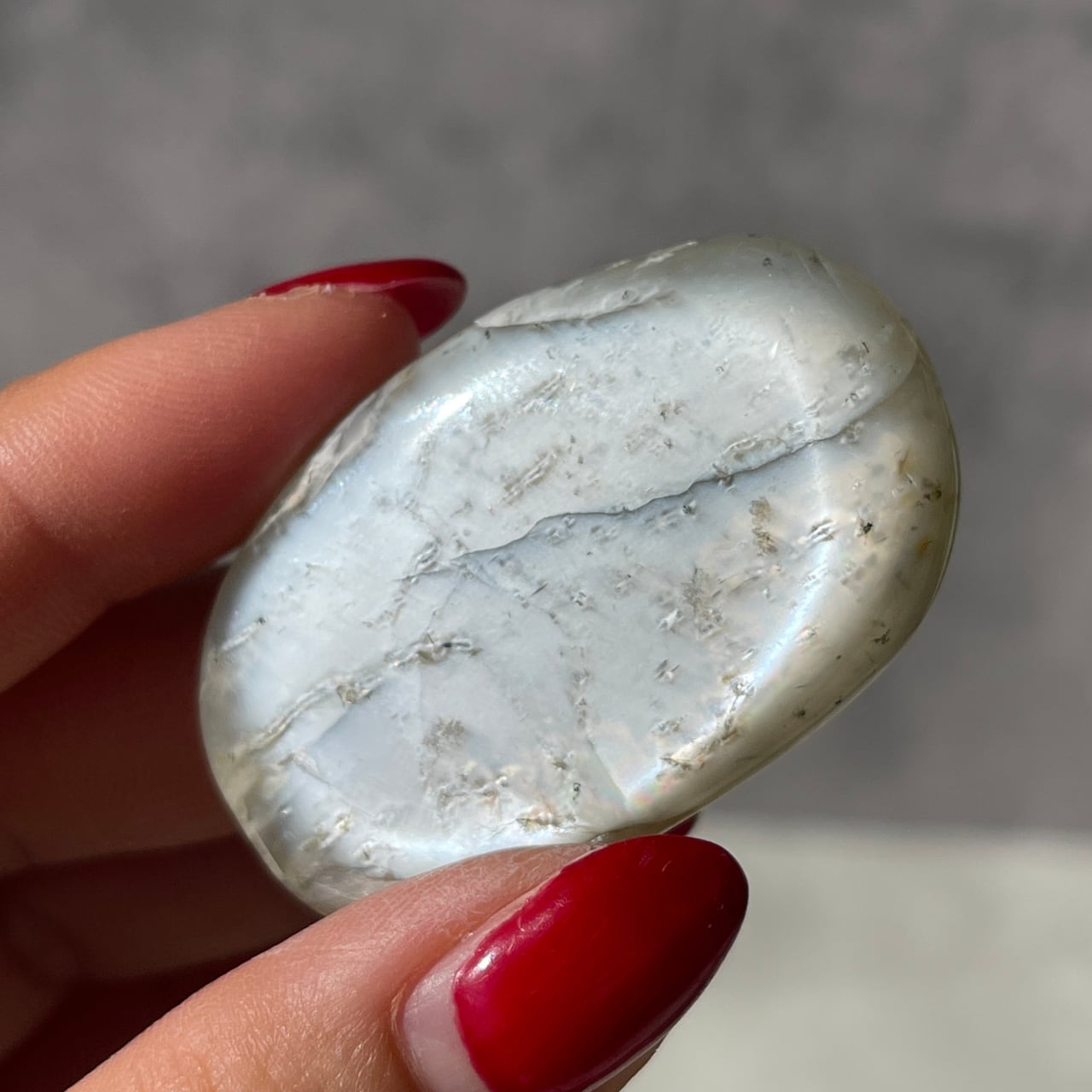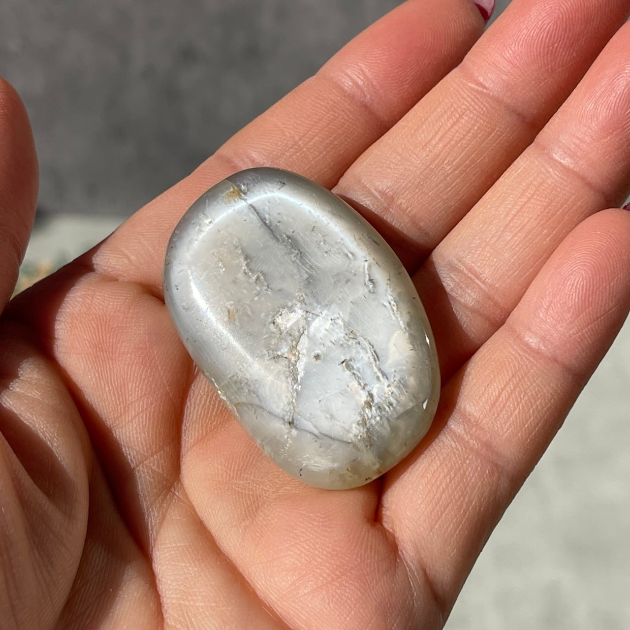 乳白色のベースに白く柔らかな光の帯が浮かび上がる、神秘的な美しさを持つインド産ホワイトムーンストーンの握り石。