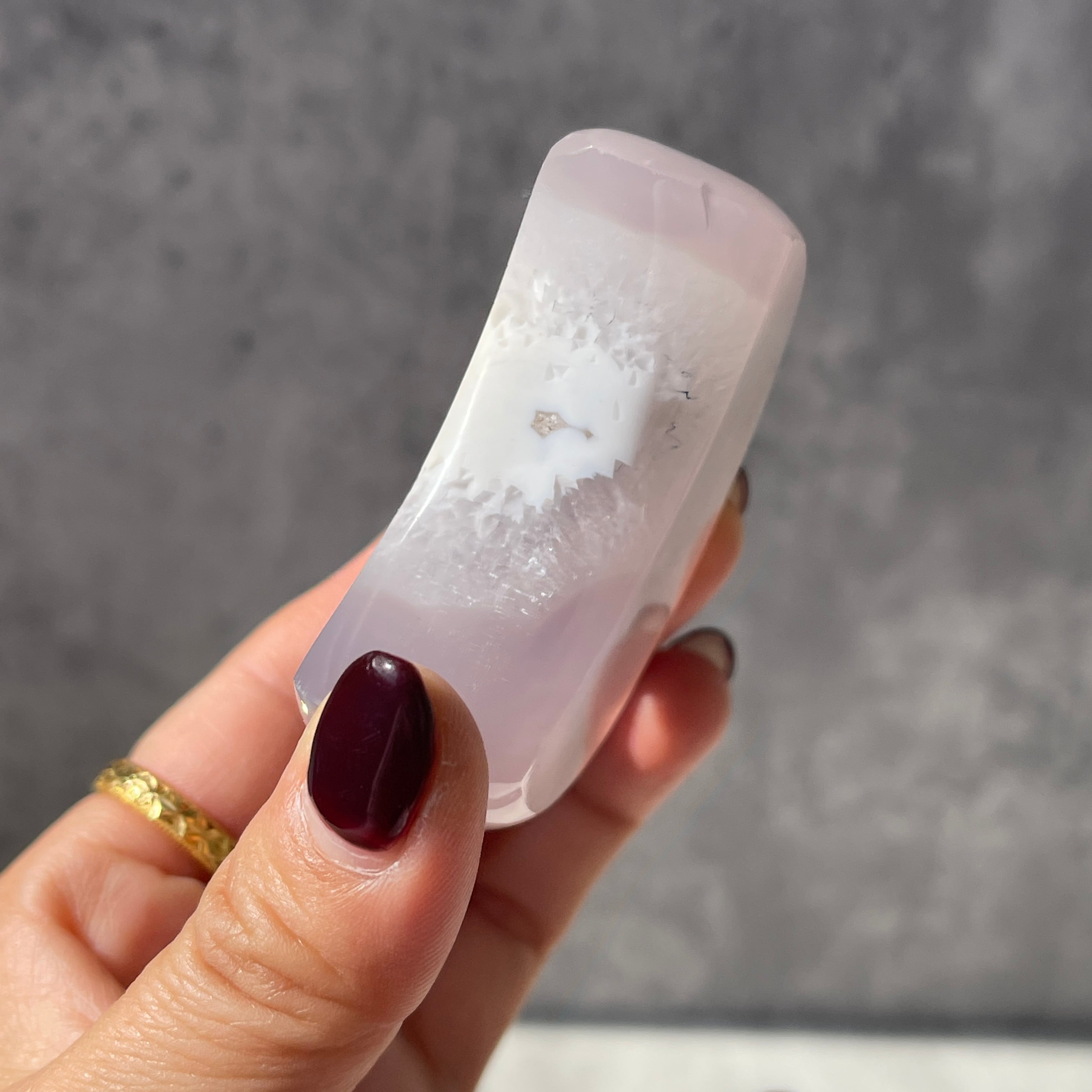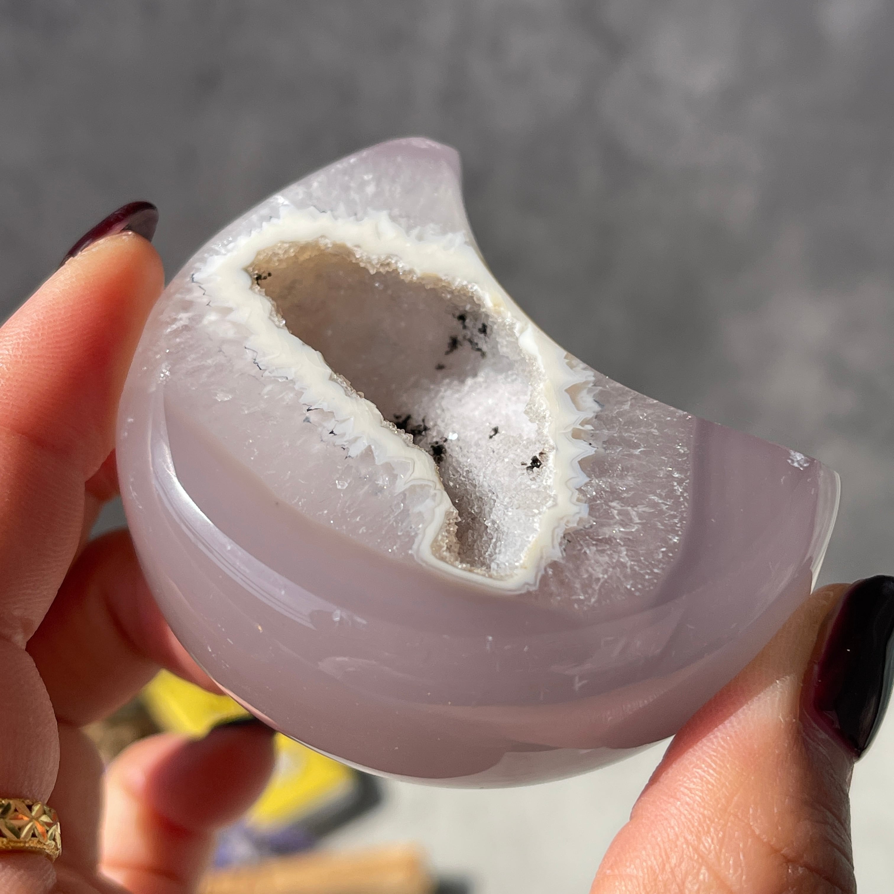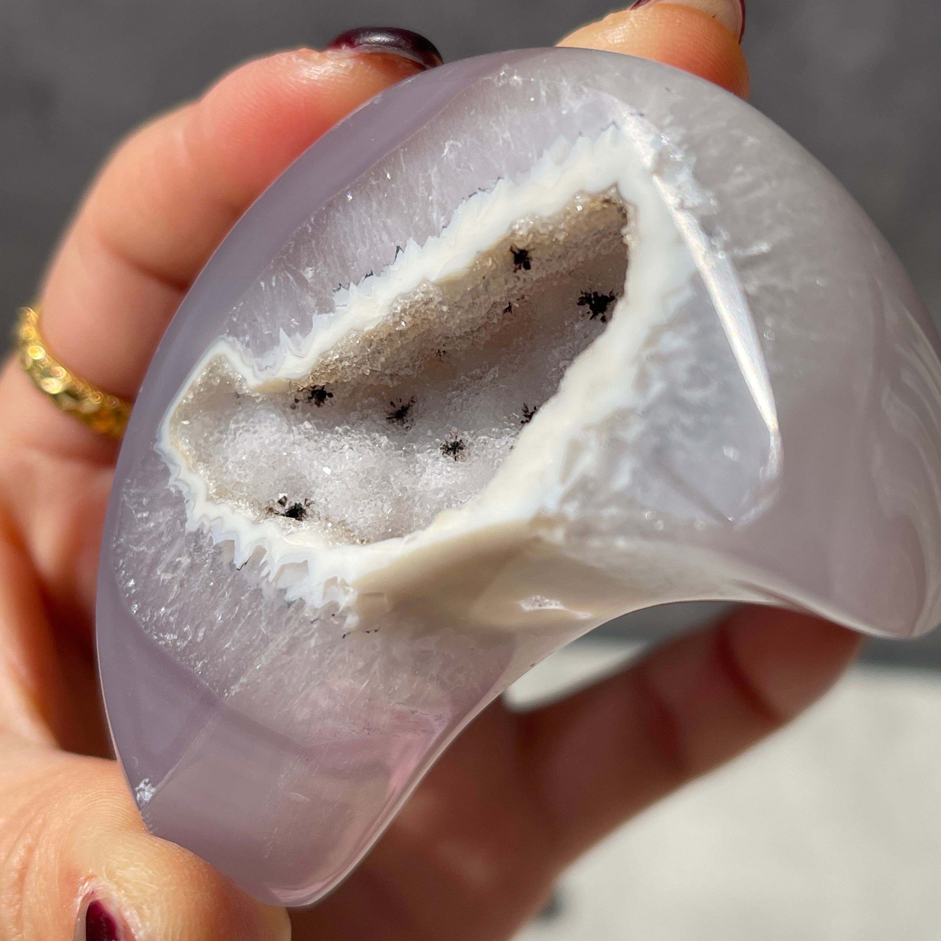 外側はなめらかに研磨され、内側には『ドゥルージー(細かな結晶が集まった空間)』が残されています。