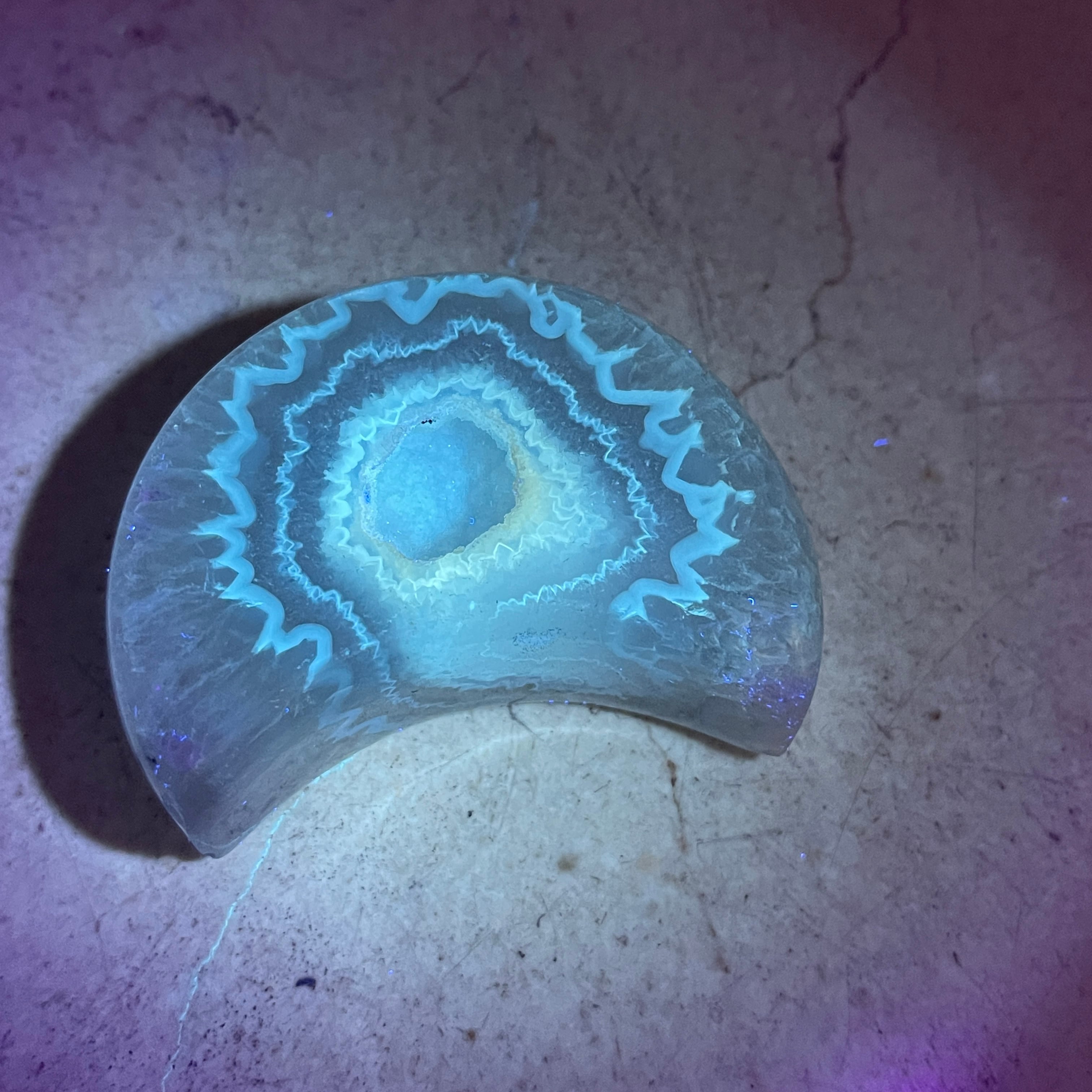 ブラックライト(UVライト)を当てると、アゲート特有の層がくっきりと発光し、通常光とはまったく異なる表情を楽しめる個体です。
