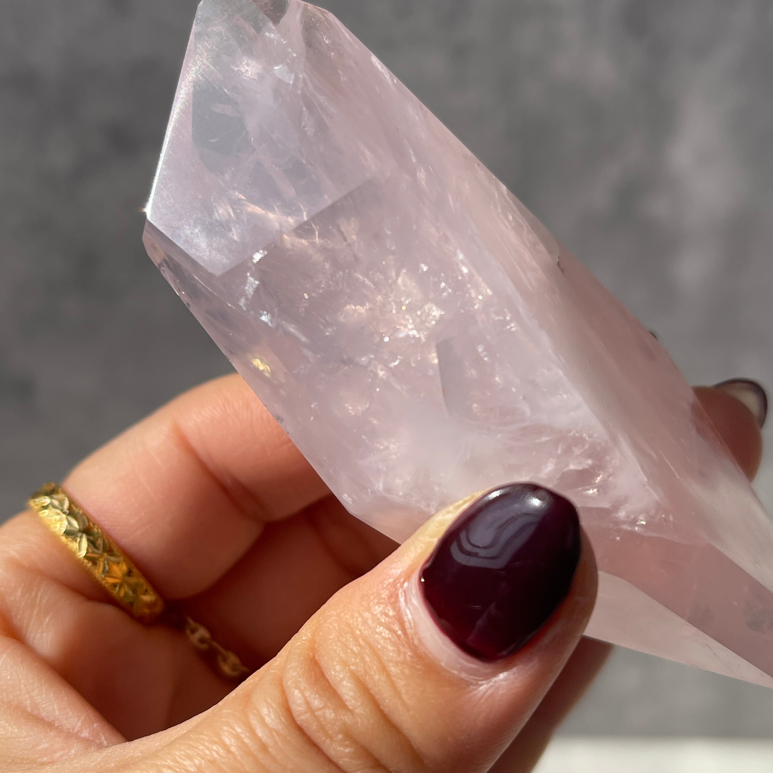 光に透かすと内部のクラックや成長跡が重なり合い、天然石ならではの奥行きを楽しめます。
