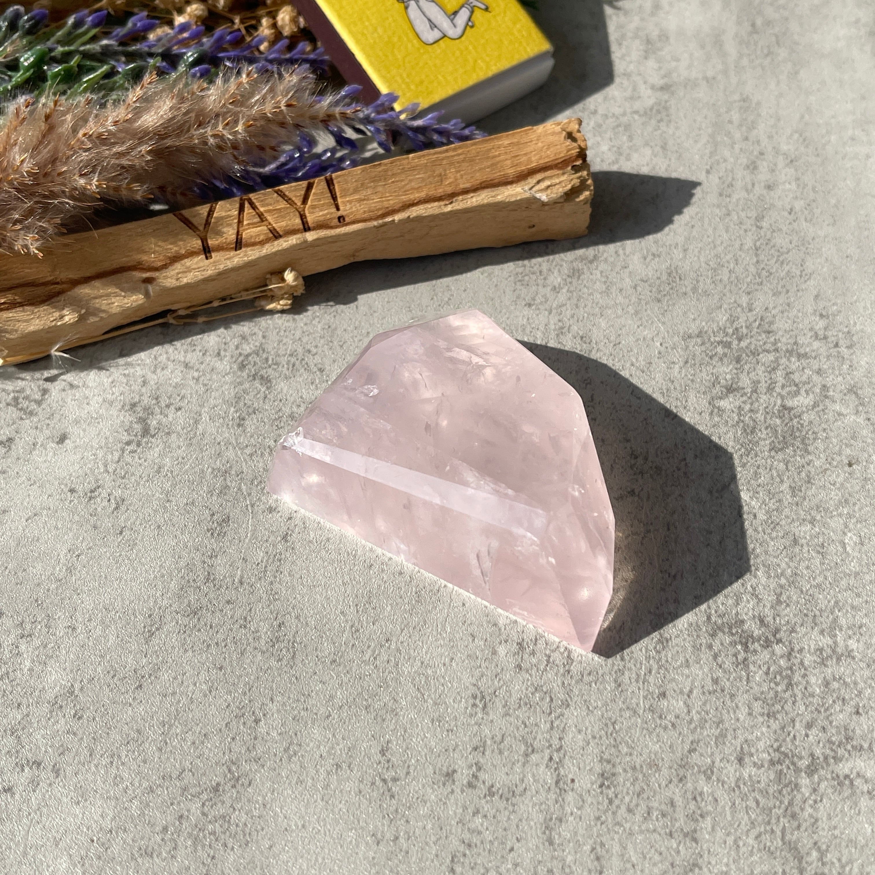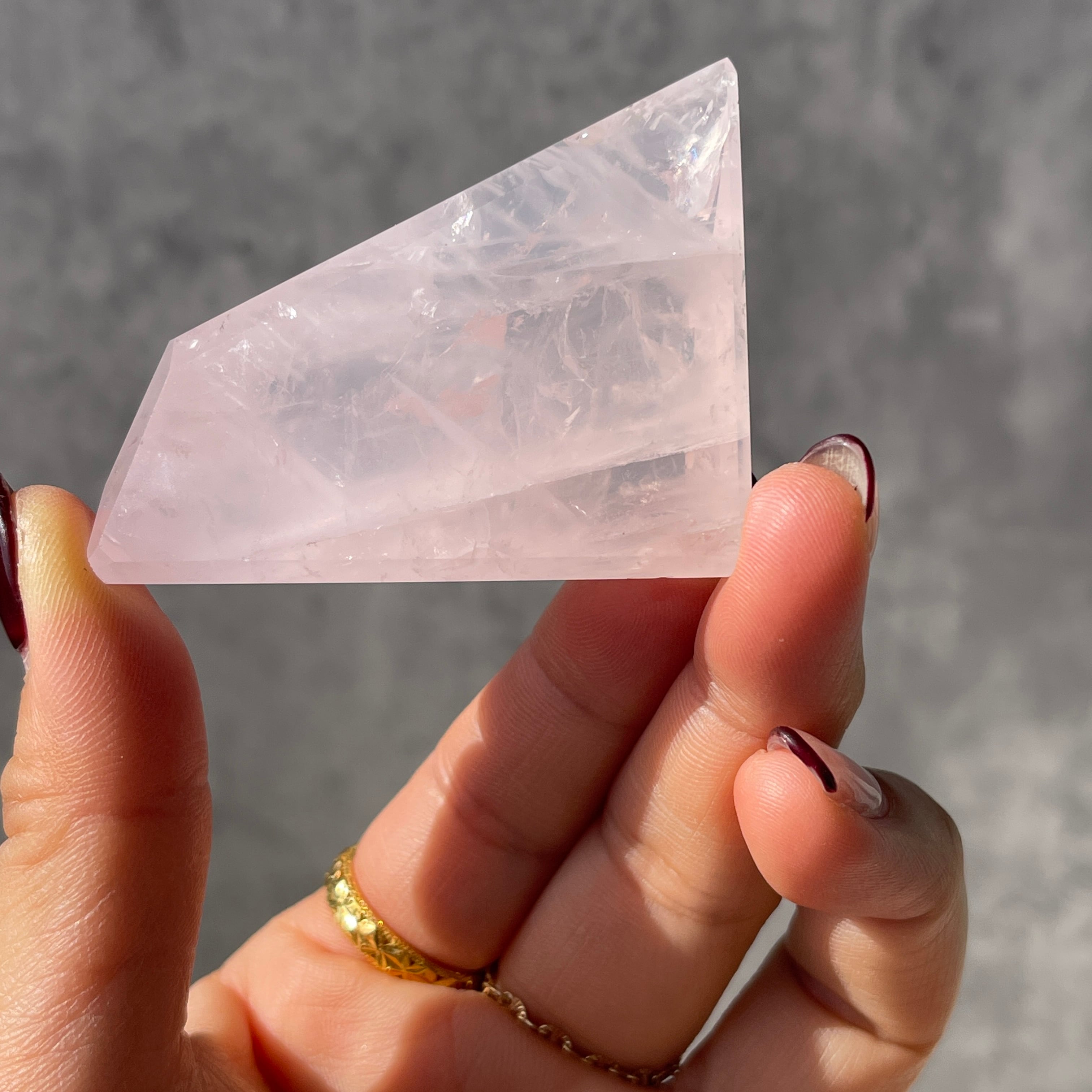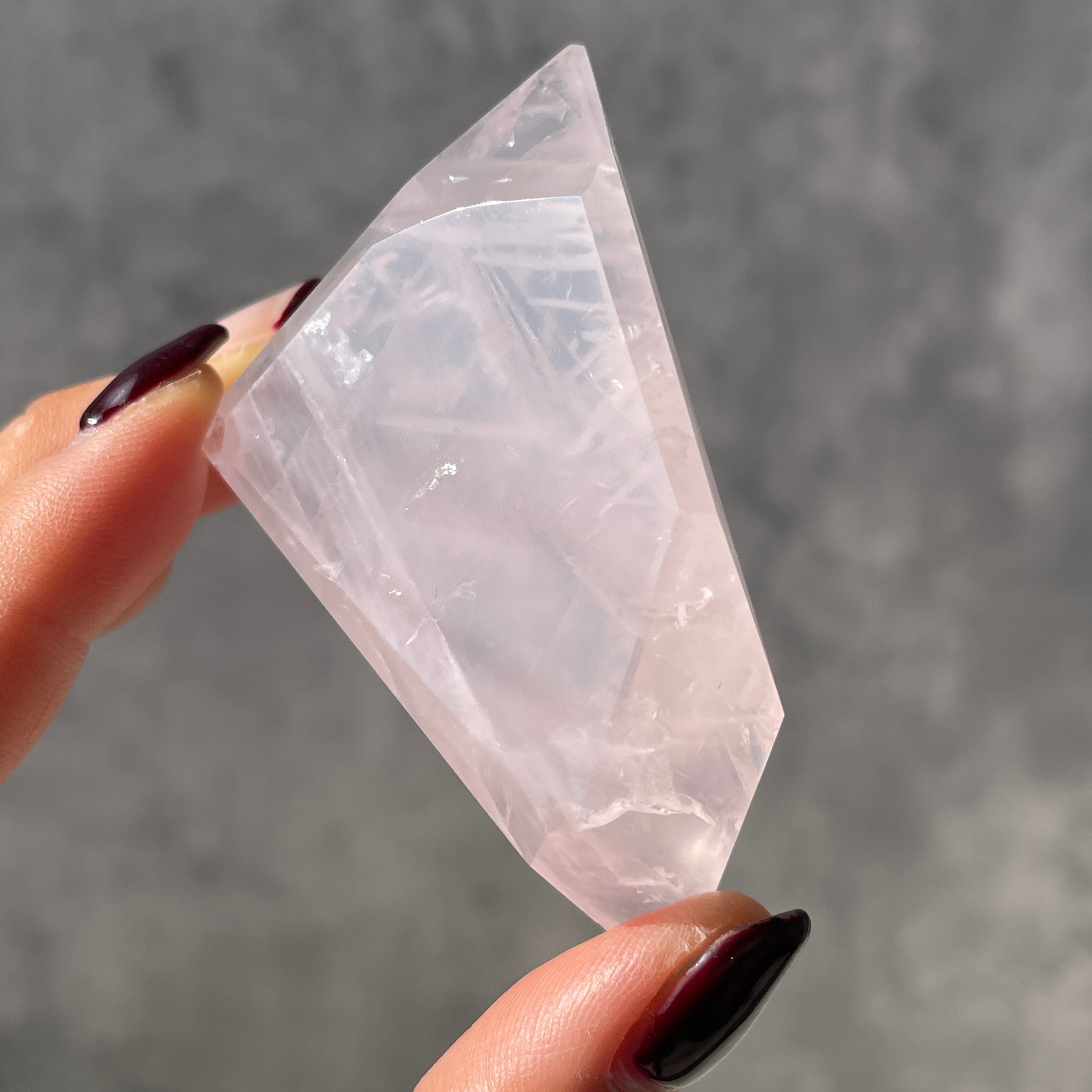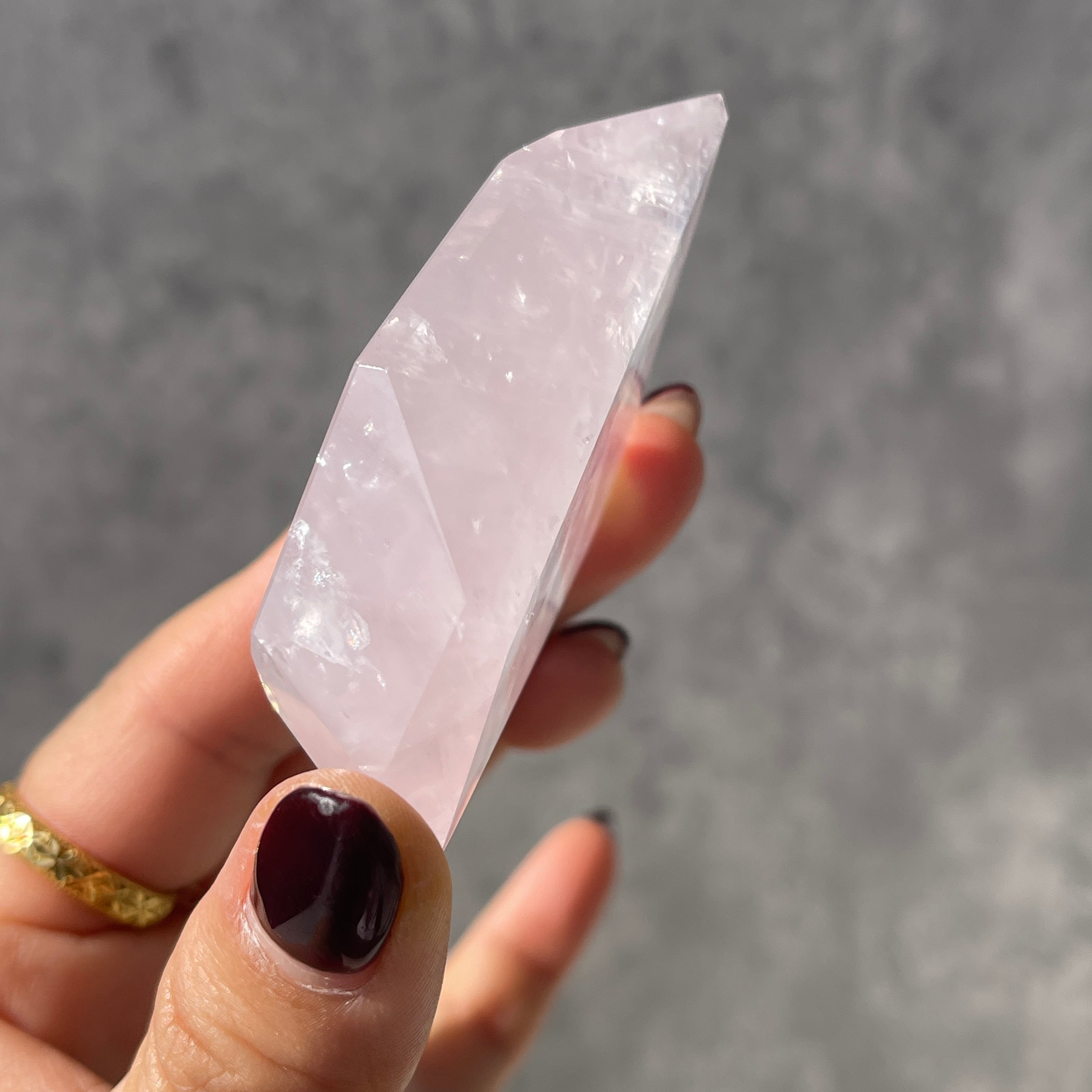 ブラジル・バイーア州産のローズクォーツを、シャープなフォルムのポリッシュポイントに仕上げた一点ものです。