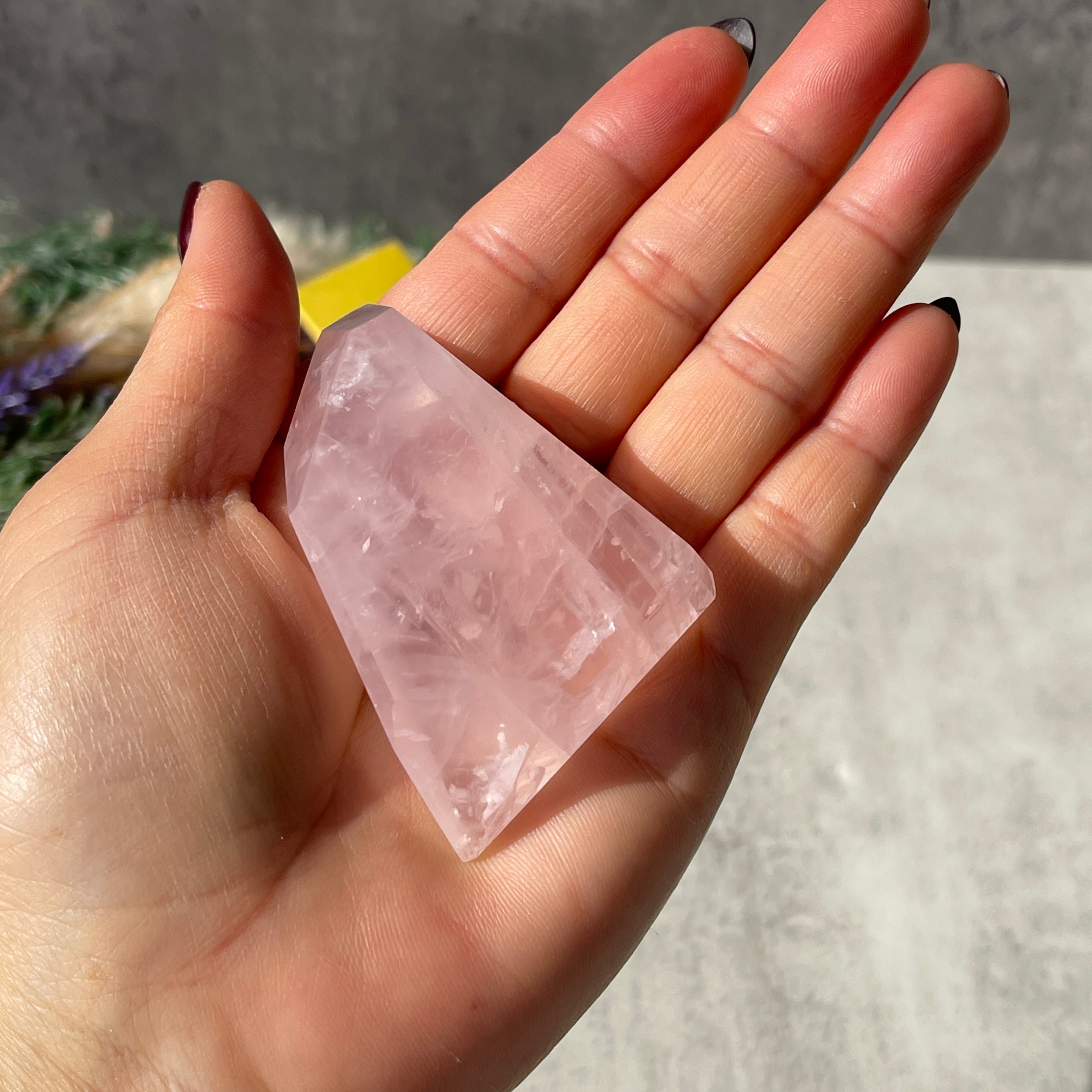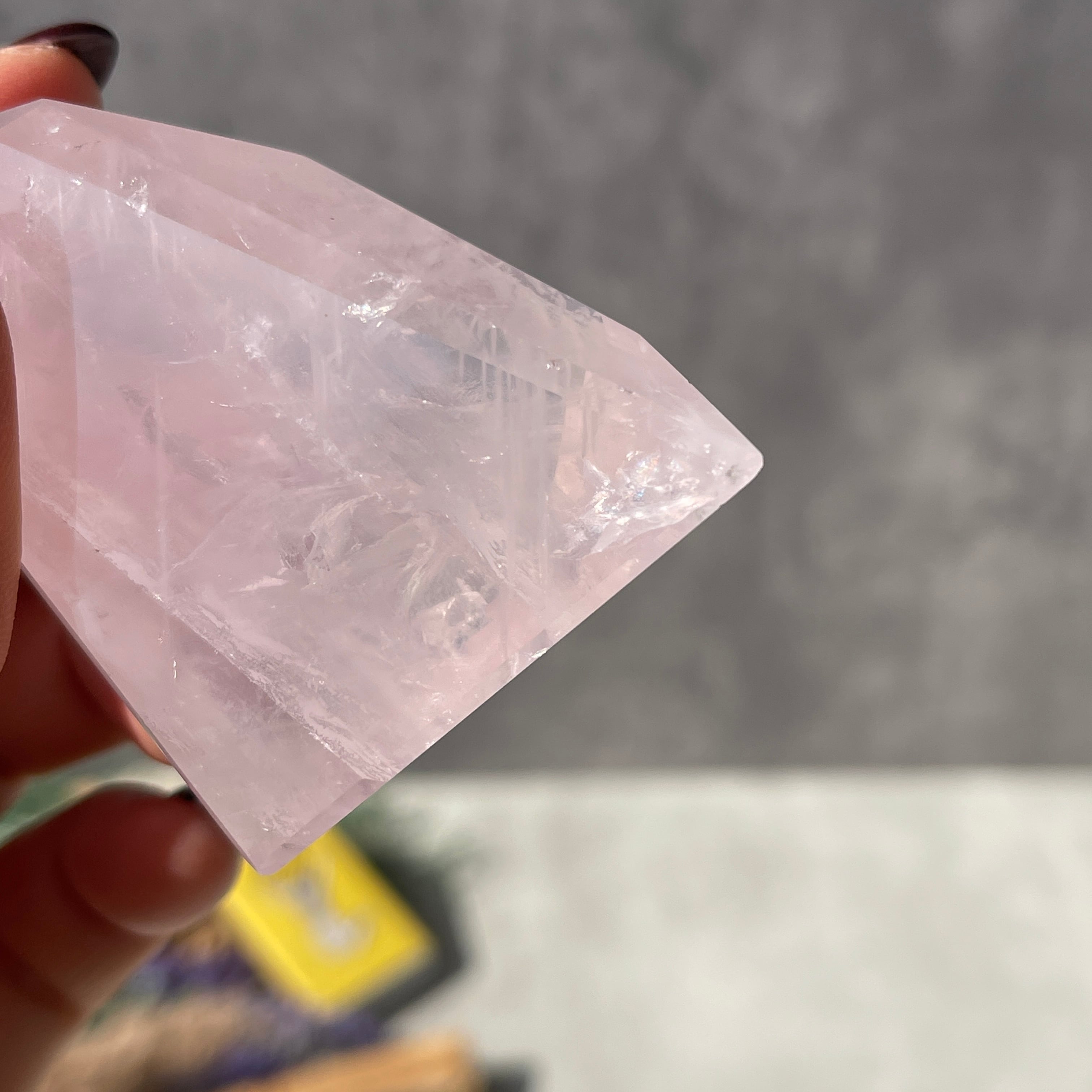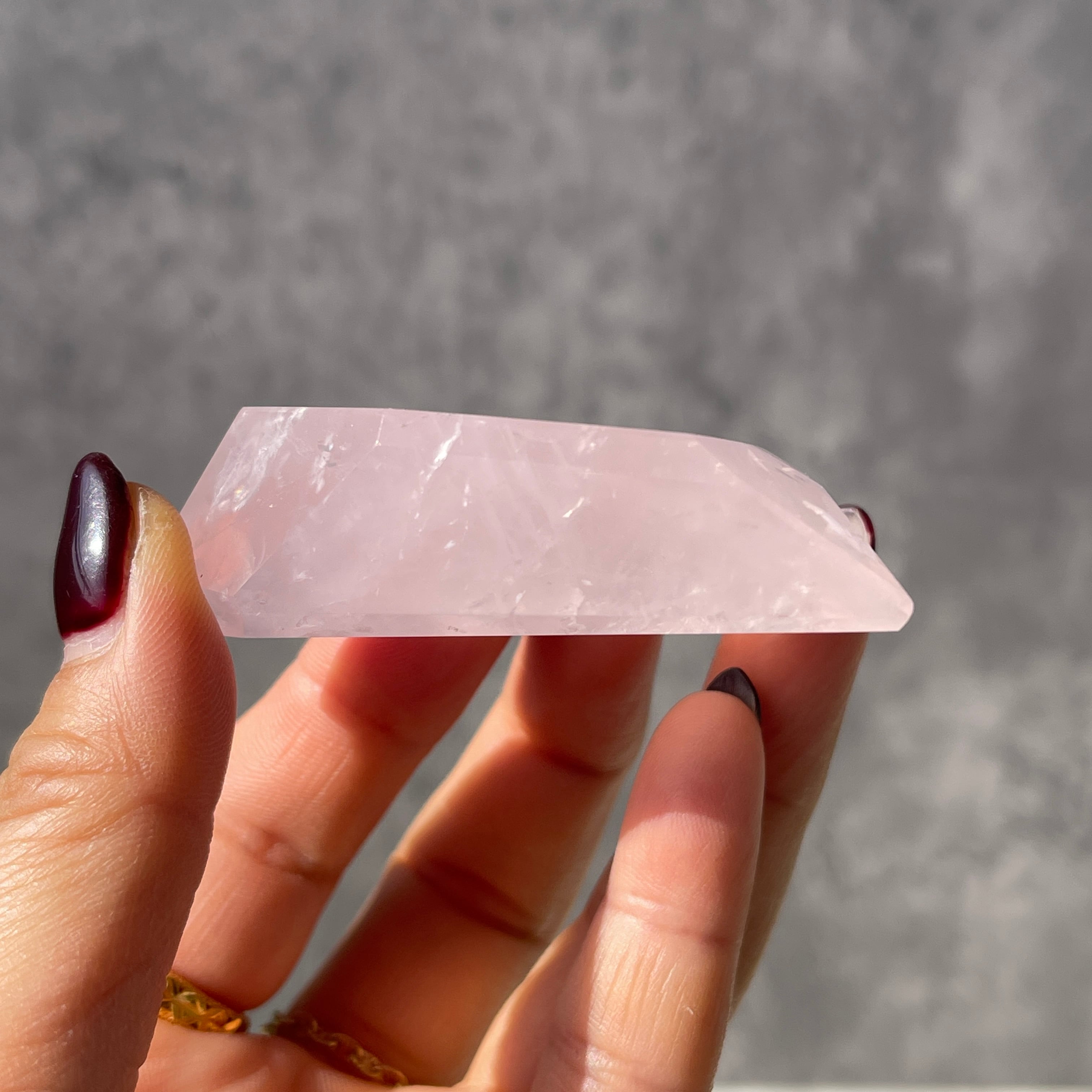 ミルキーになりやすいローズクォーツの中では、比較的透明感があり、内部のクラックや結晶構造がはっきりと見えるタイプ。