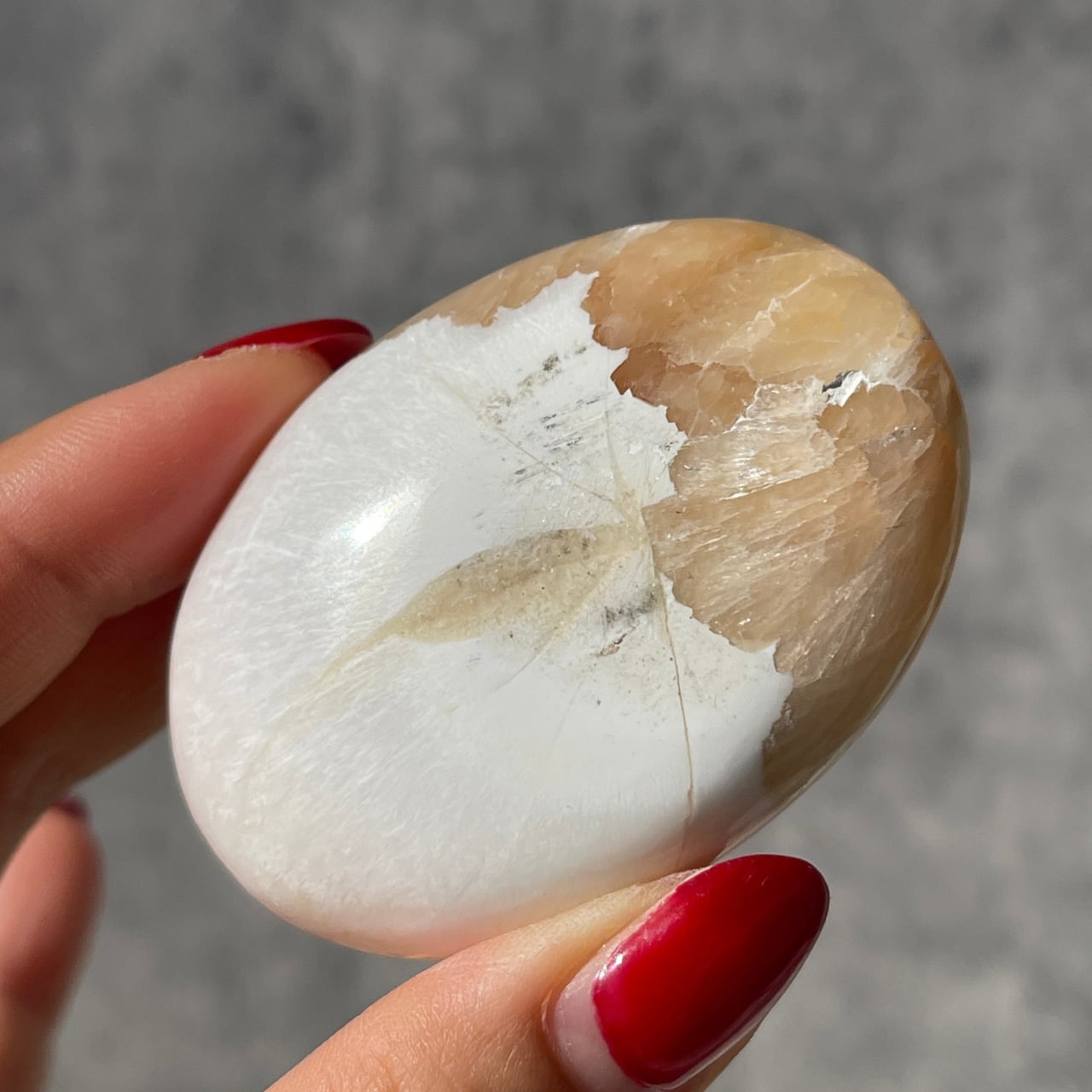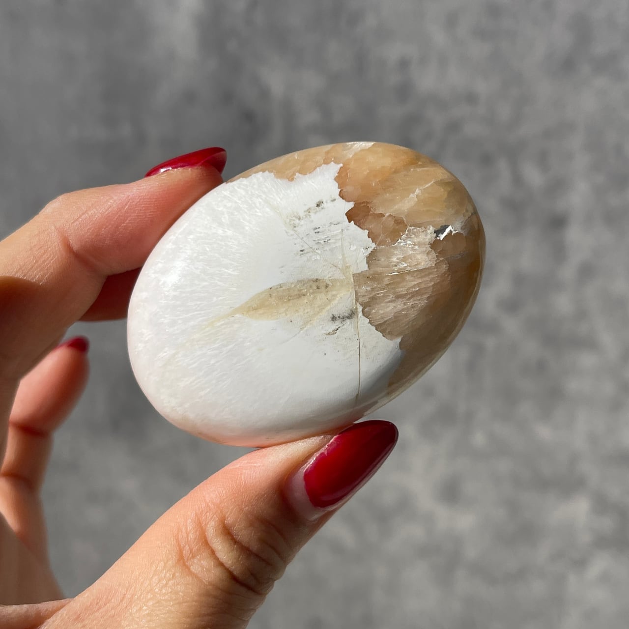 ミルクティーのような優しいブラウンカラーと清らかさや温もりを感じさせる乳白色の色合いが絡み合った混合石、インド産スティルバイトとスコレサイトのパームストーン。