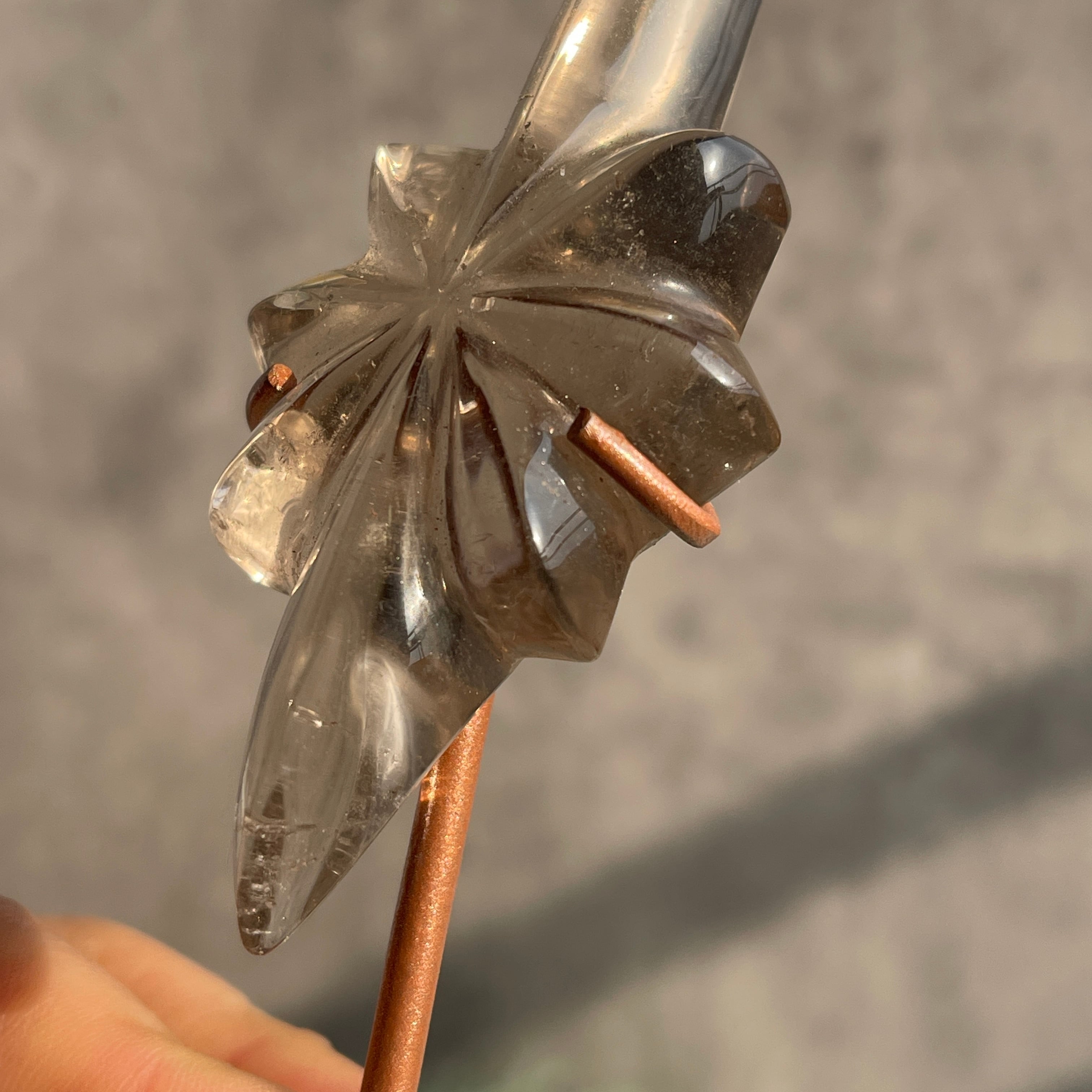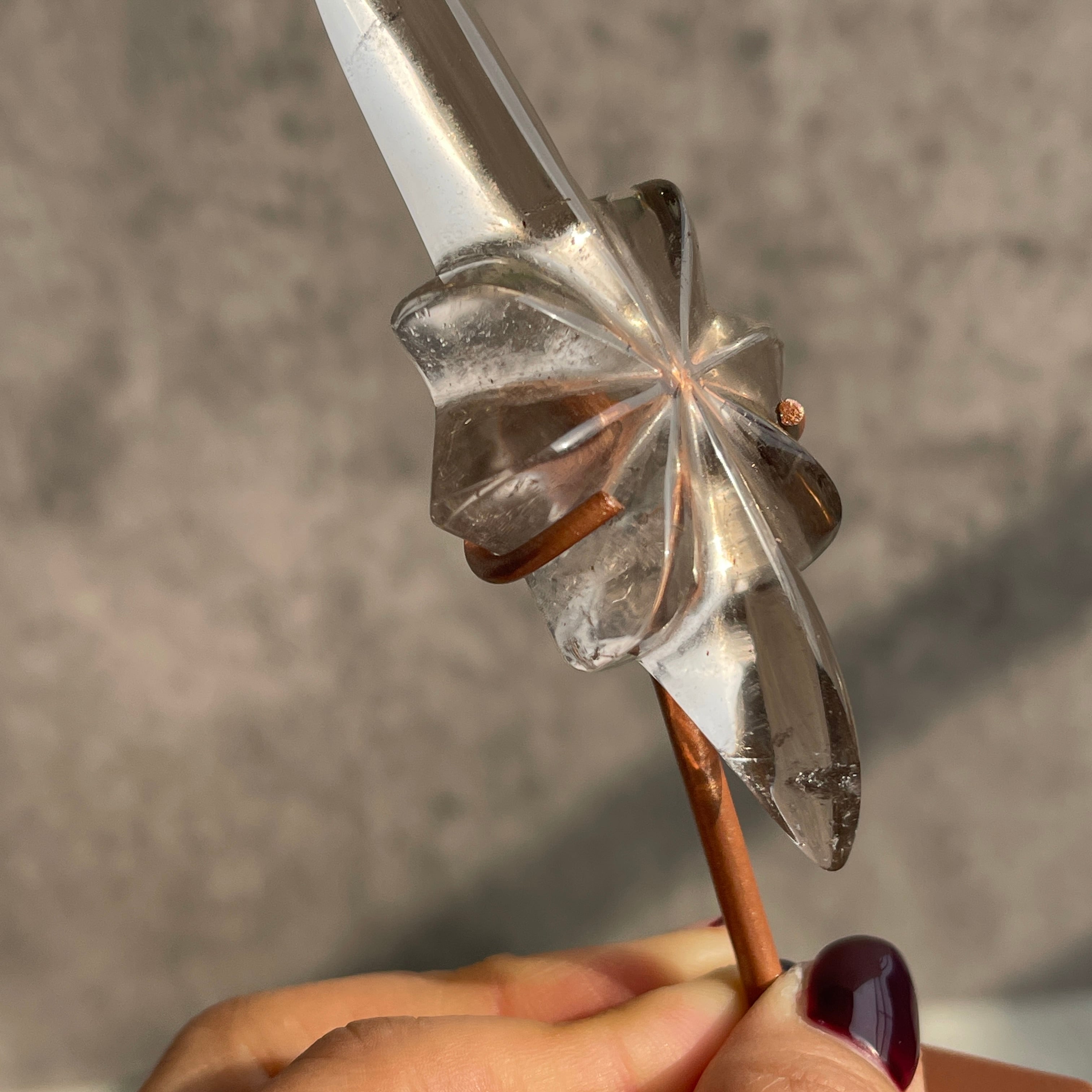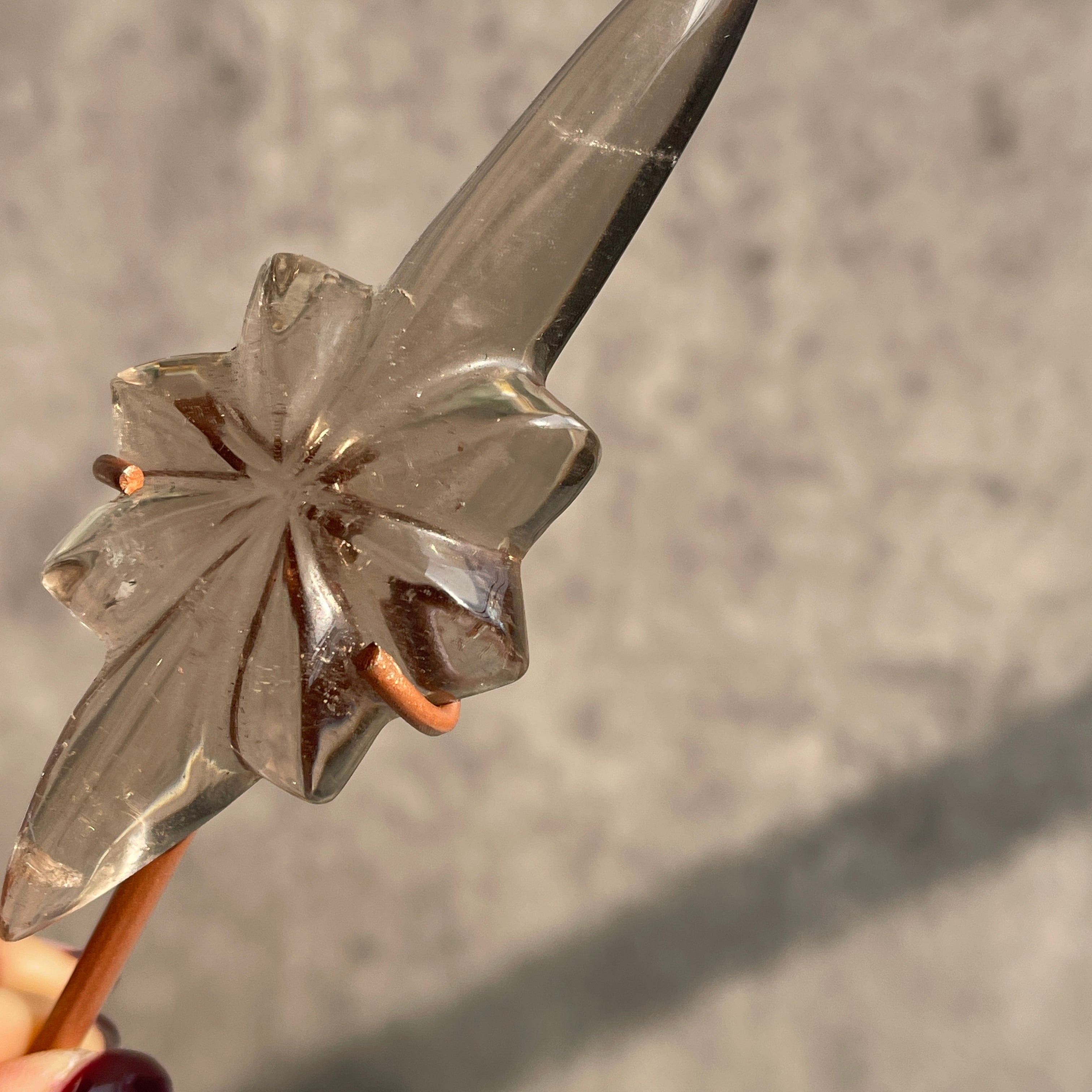 透明感を残したスモーキーカラーのクォーツを、中央から放射状に広がる立体的な造形に仕上げ、