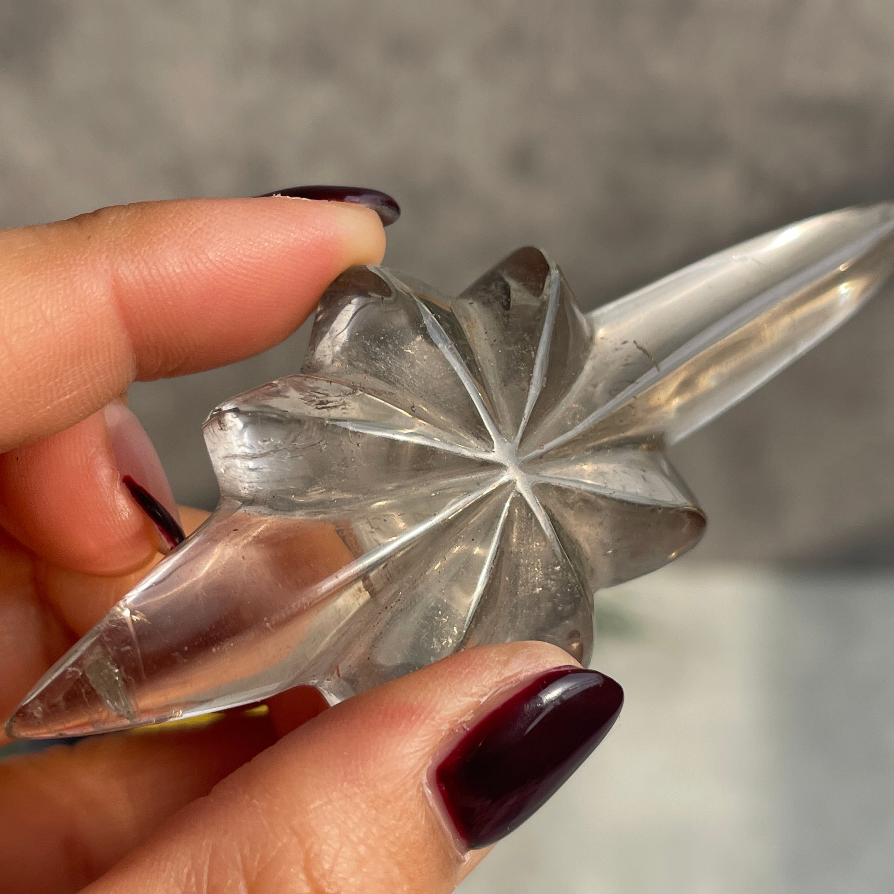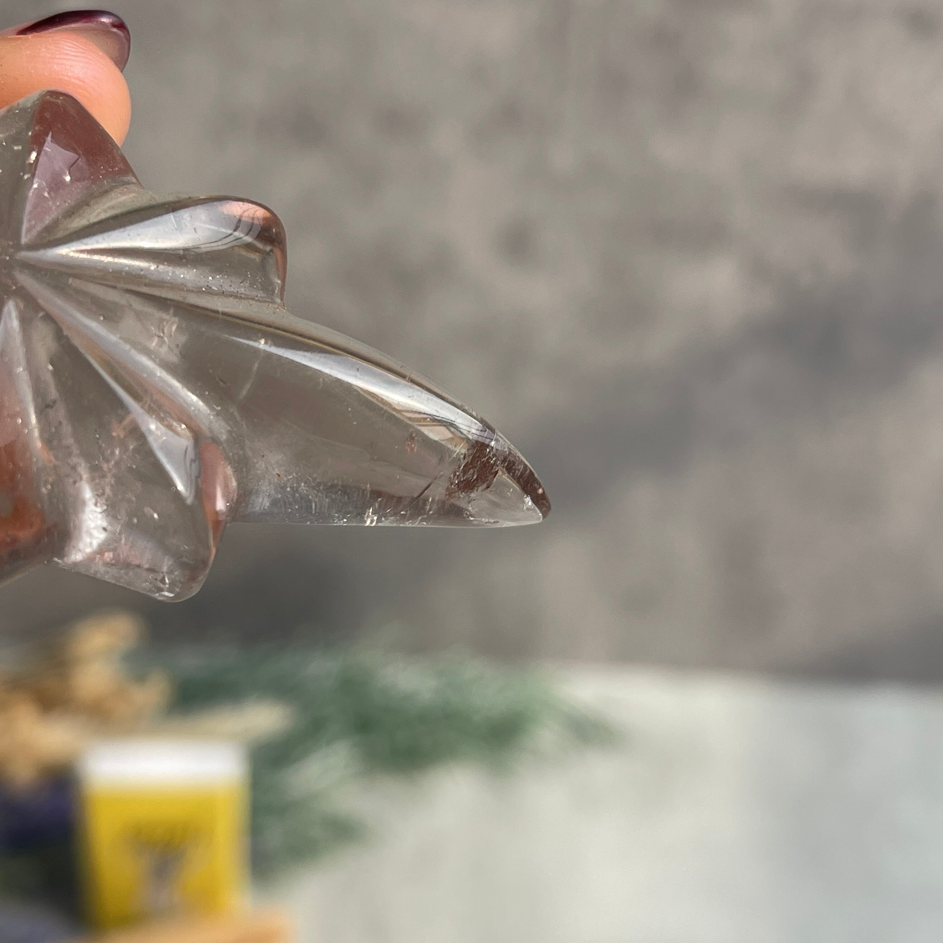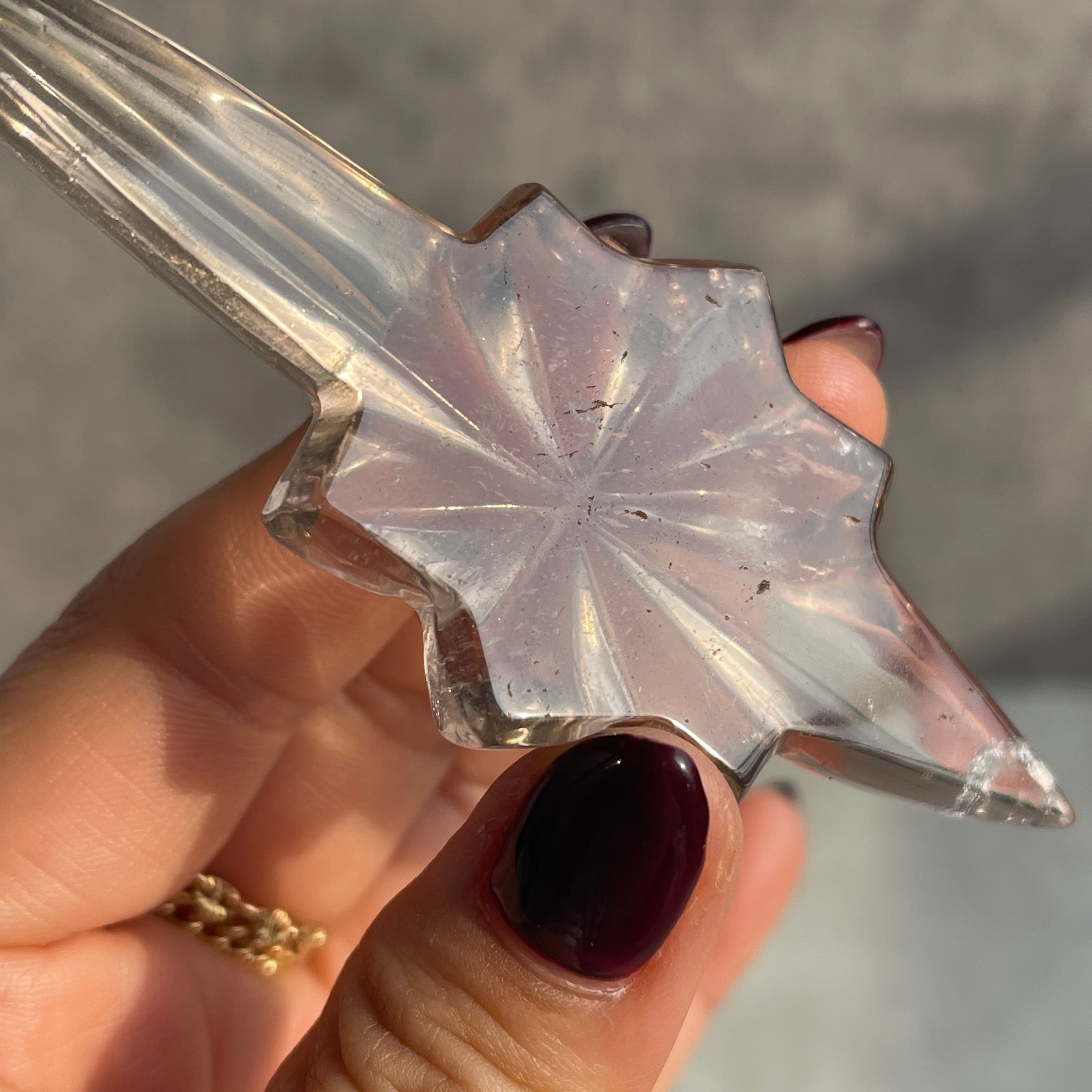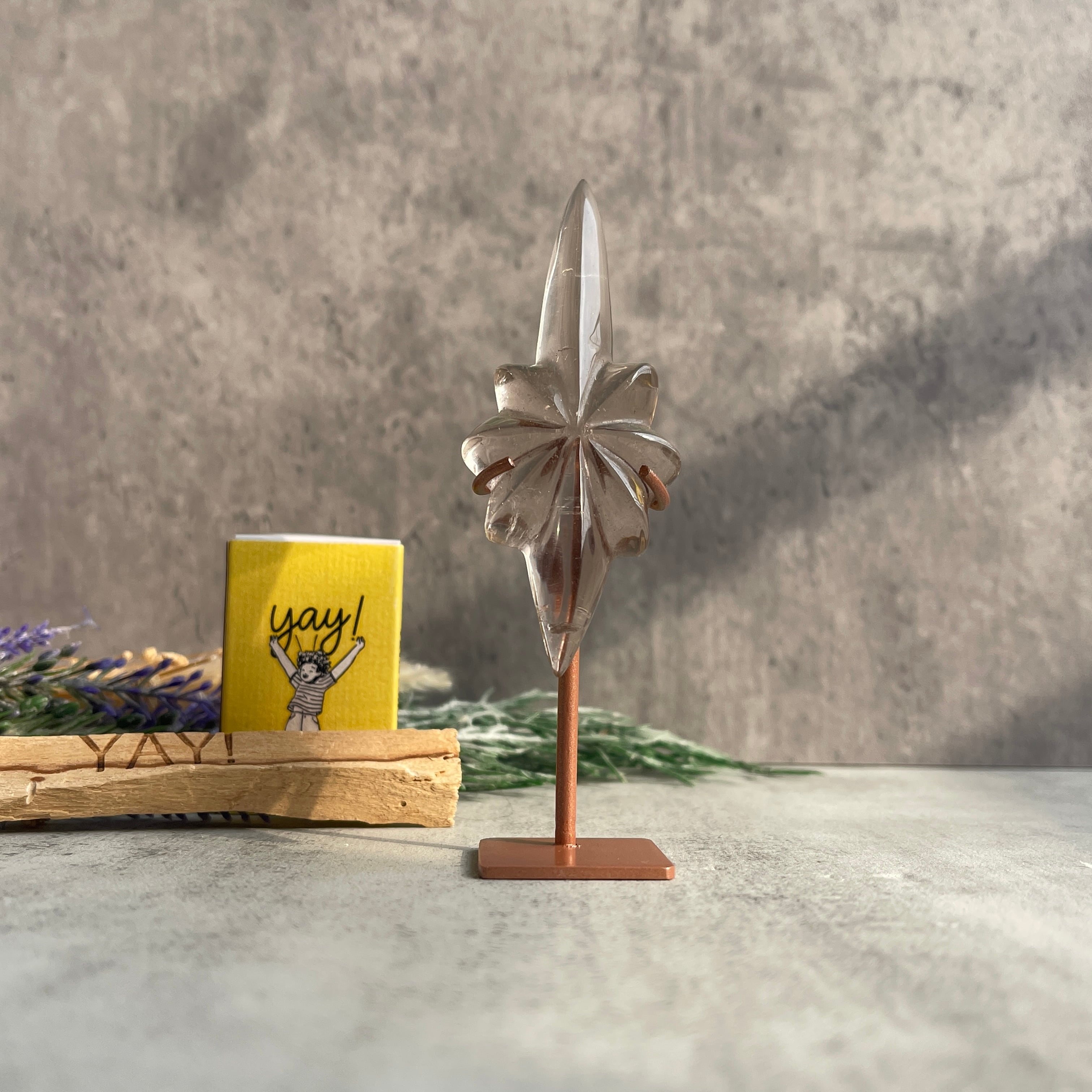 透明感を残したスモーキーカラーのクォーツを、中央から放射状に広がる立体的な造形に仕上げ、