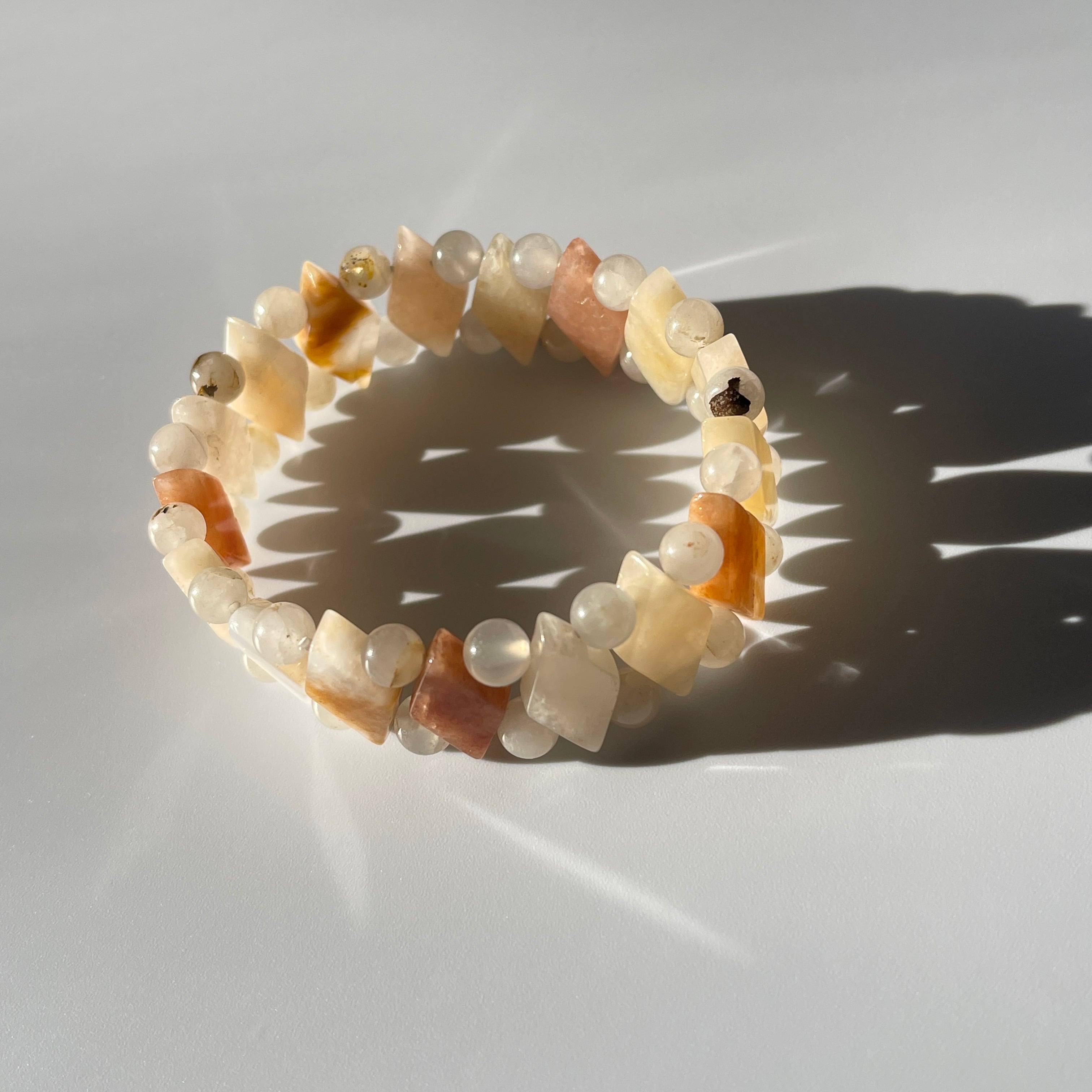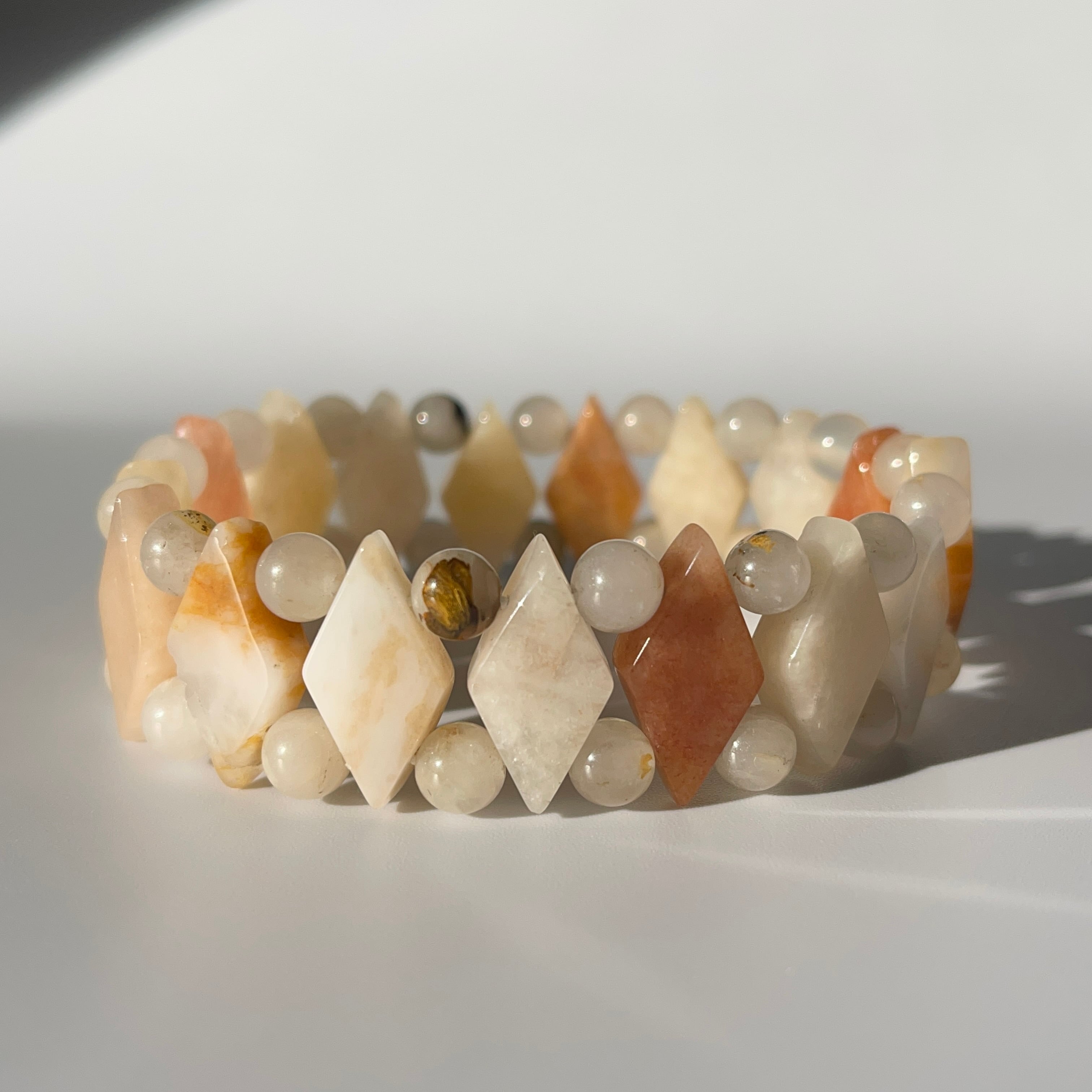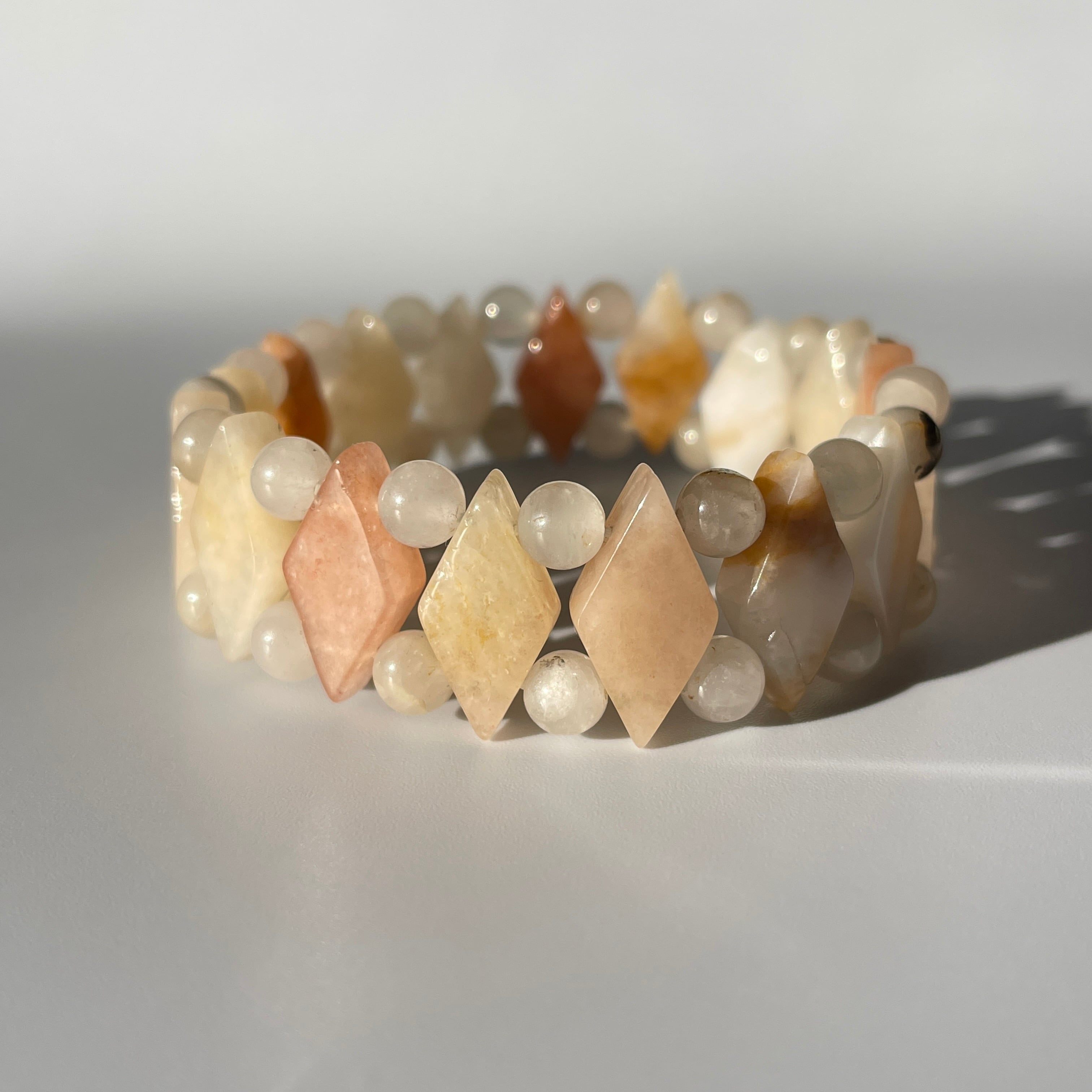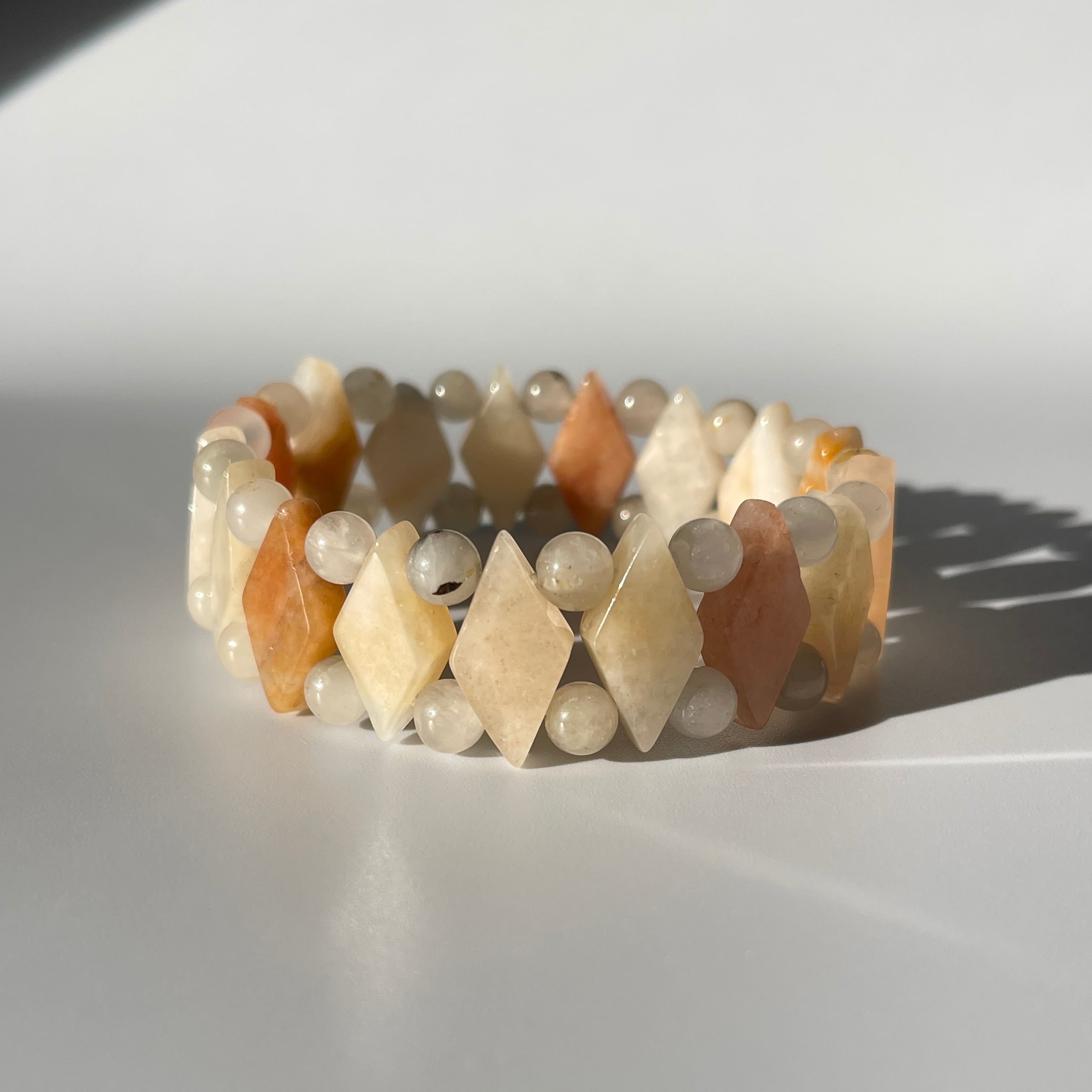 ゴールドシルクジェイドを使用した、菱形カットとラウンドビーズを組み合わせたデザインブレスレットです。