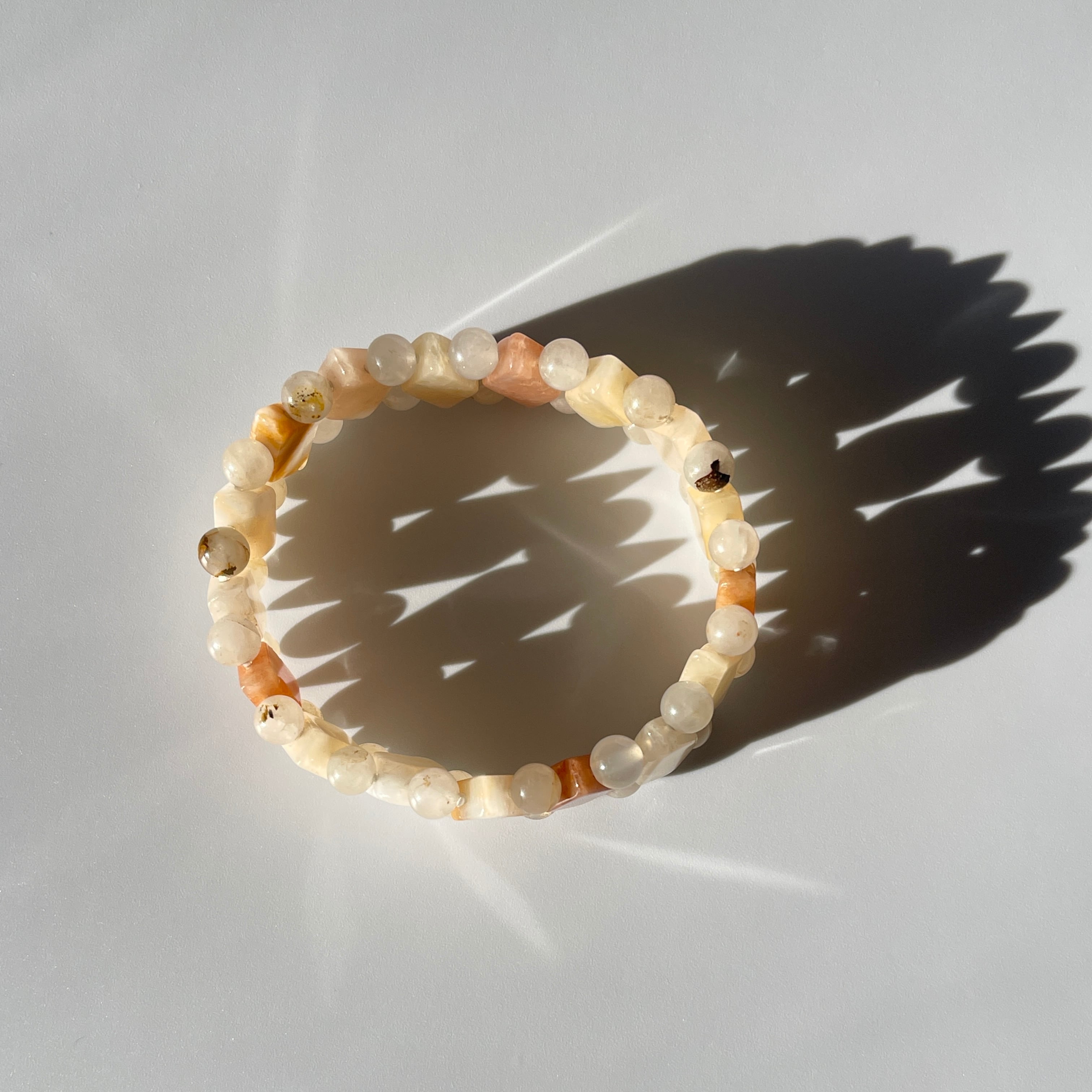やわらかなアイボリー〜ベージュ、淡いオレンジやブラウンを含んだナチュラルな色合いで、光の当たり方によって石の表情が穏やかに変わります。