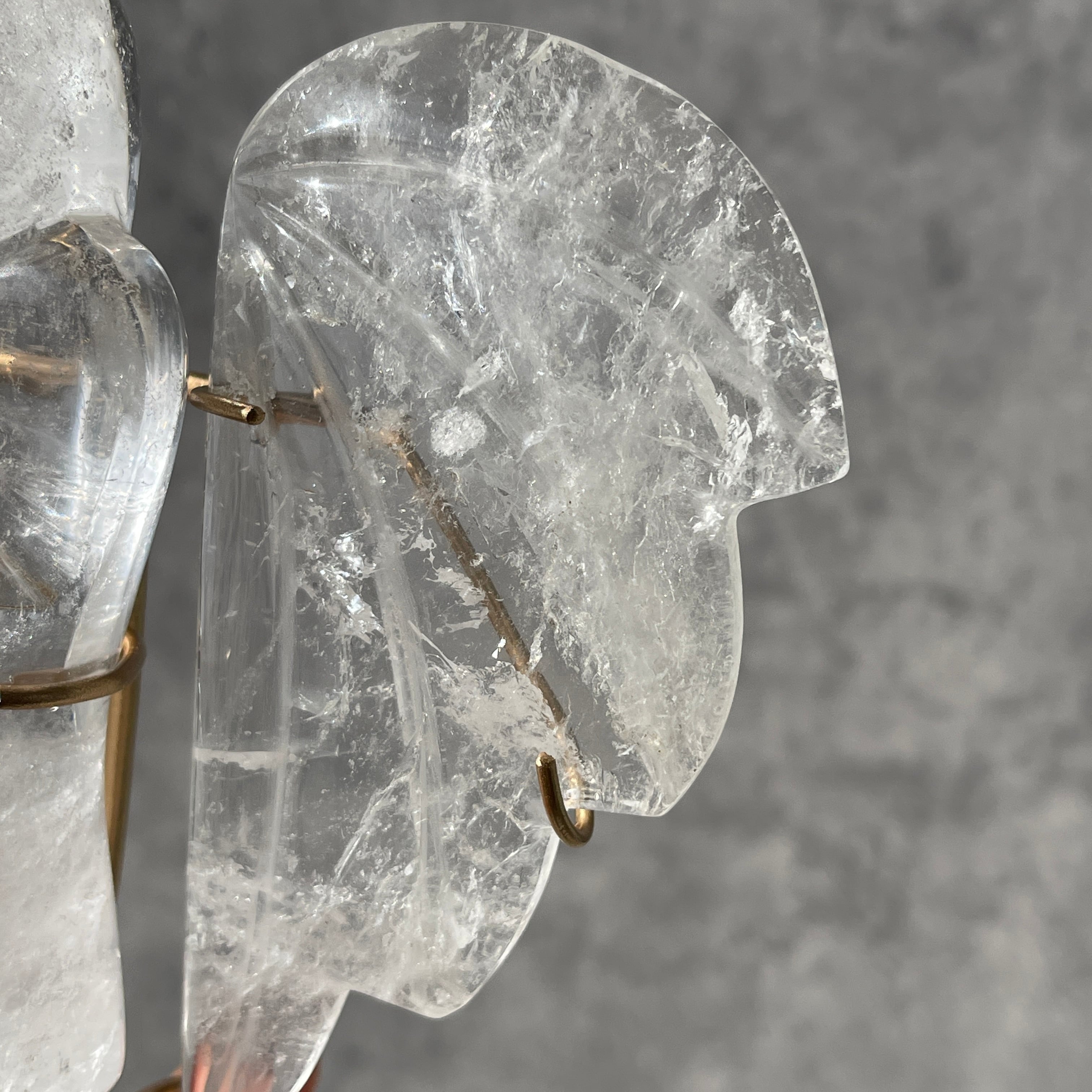 透明感のある水晶に、内部のクラックや内包物が光を受けて表情を変え、静かで奥行きのある佇まいを感じさせる一体。