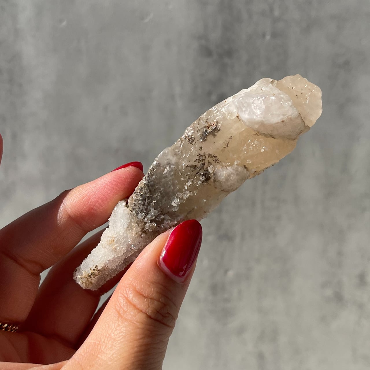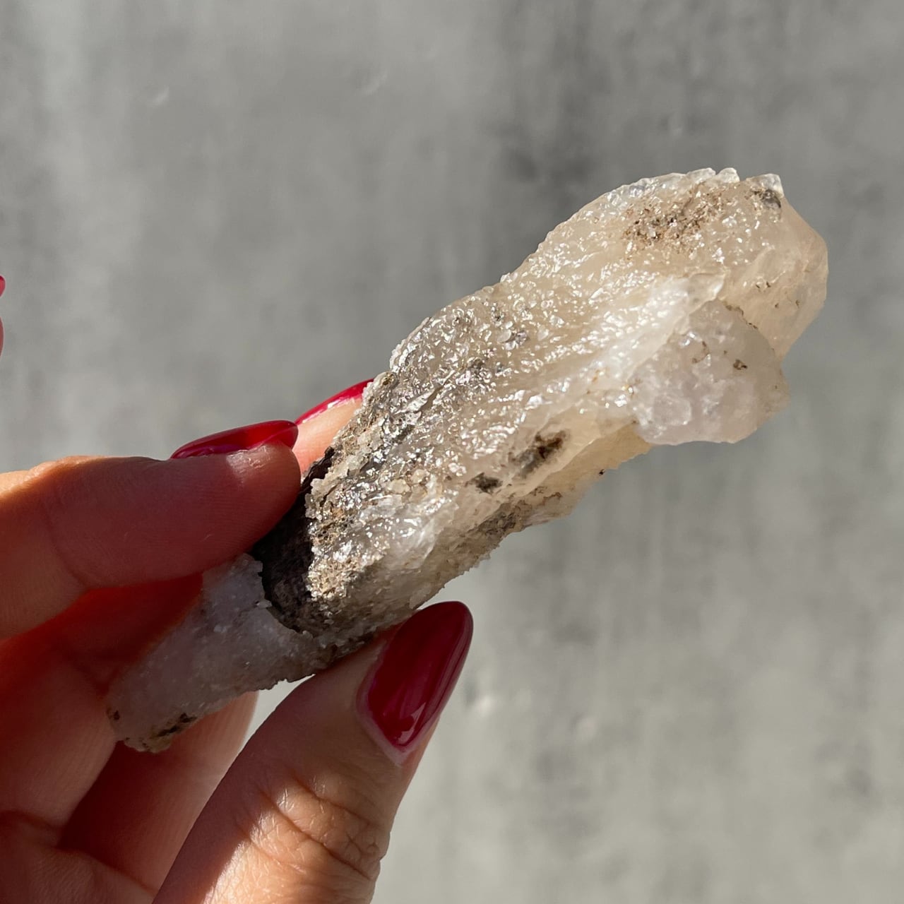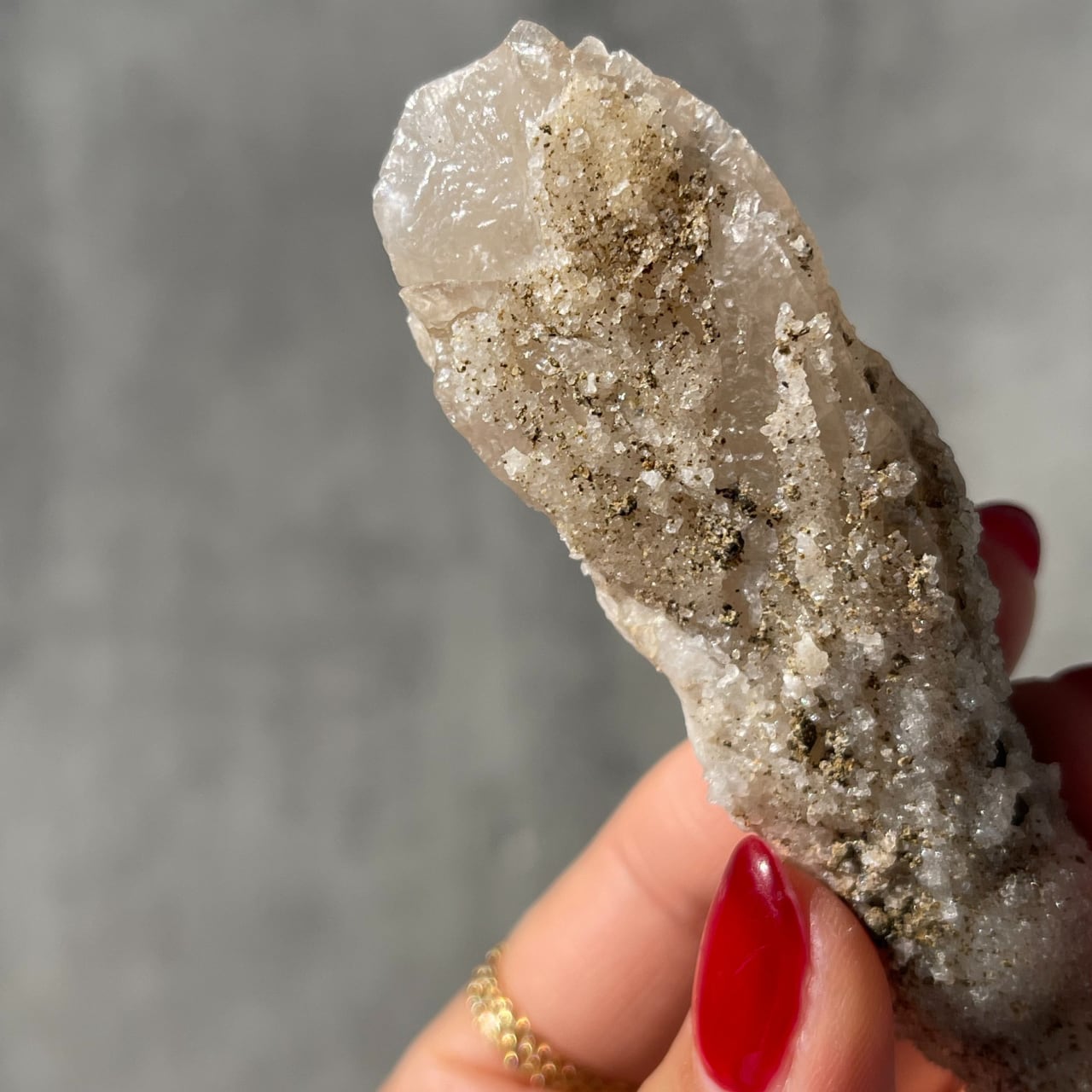 表面に無数の小さな結晶が群がったドゥルージークォーツとカルサイトが共生した、レソト大国(レストゥ)アルバーツ山産のストーン、天然石。