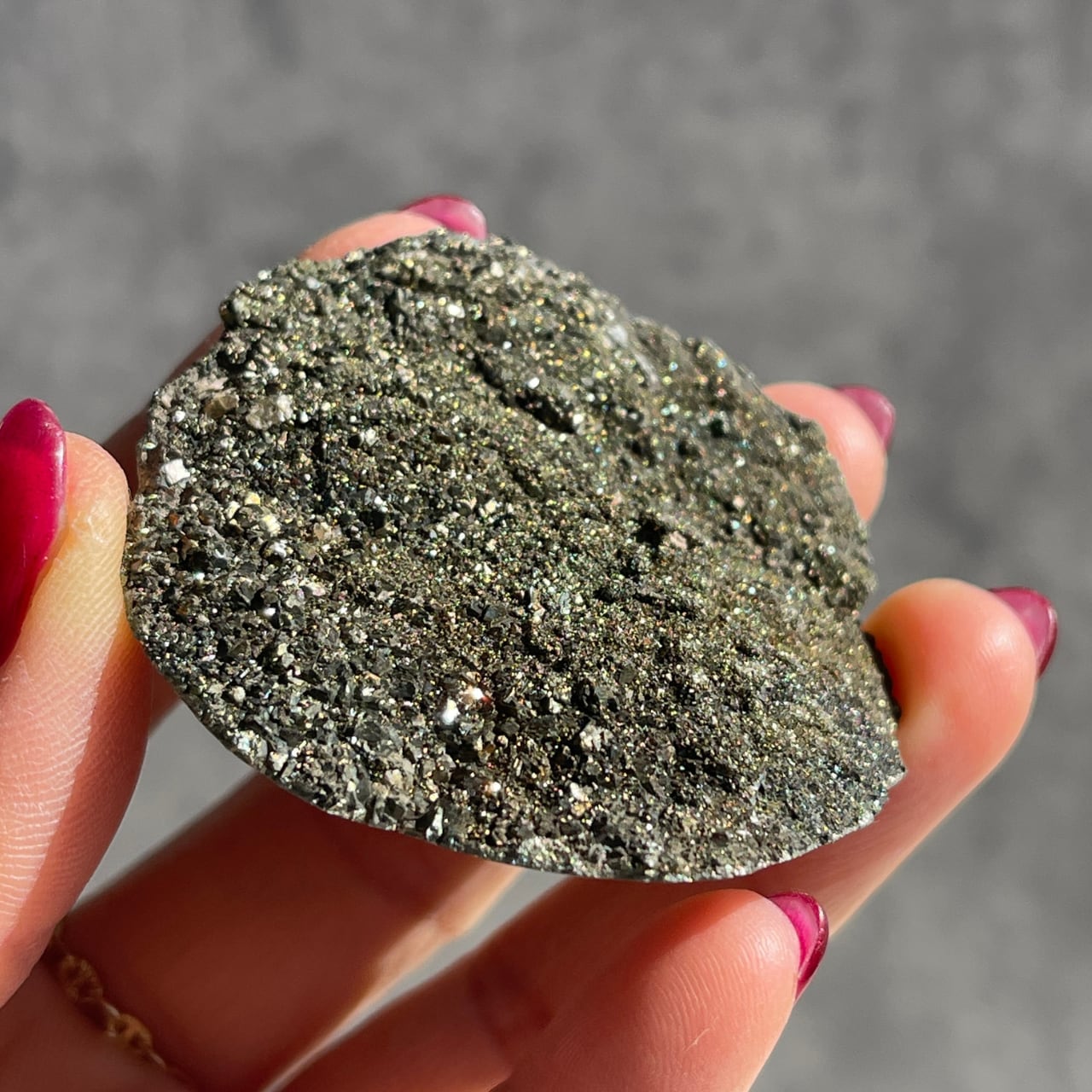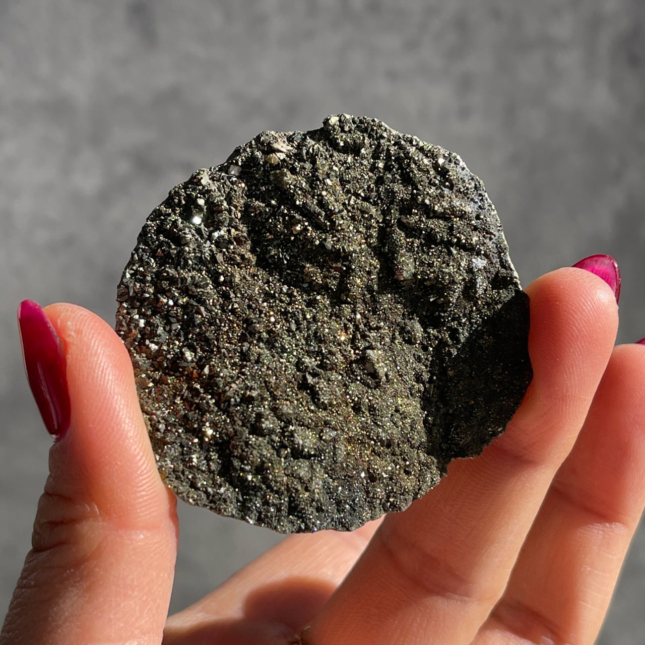 一見、ダークな見た目のパイライトは、黄鉄鋼の金属のようなメタリックな輝きが特徴です。