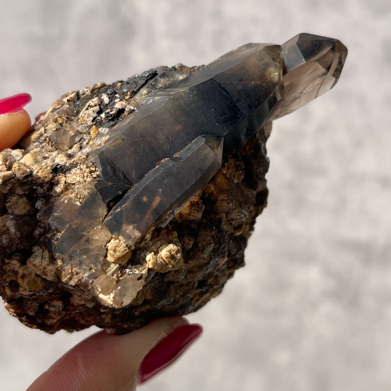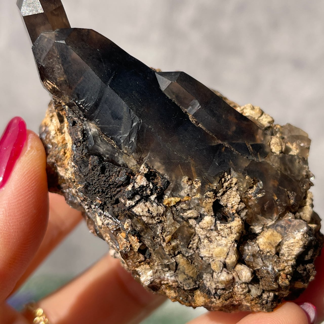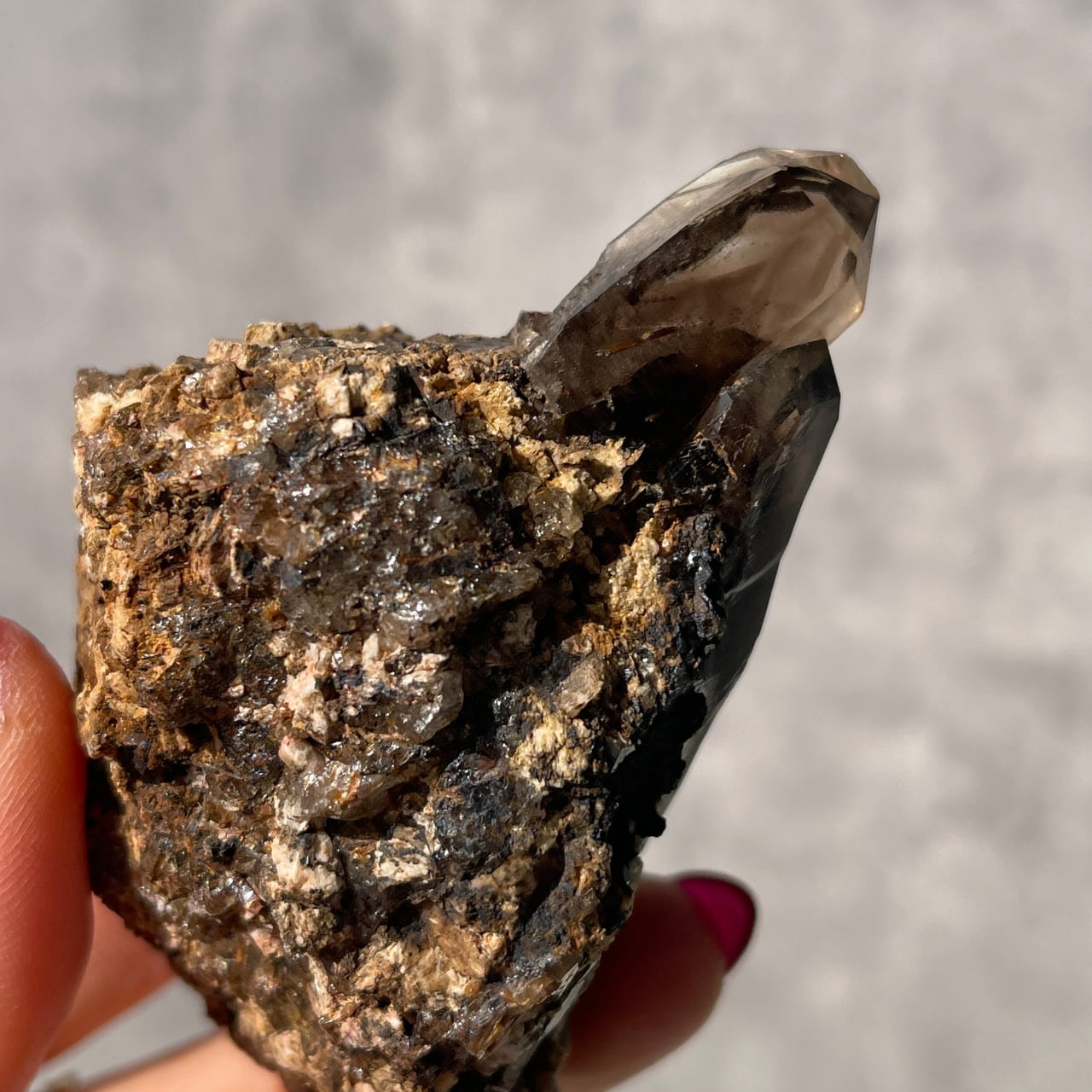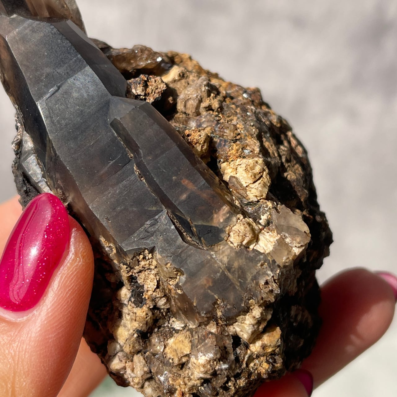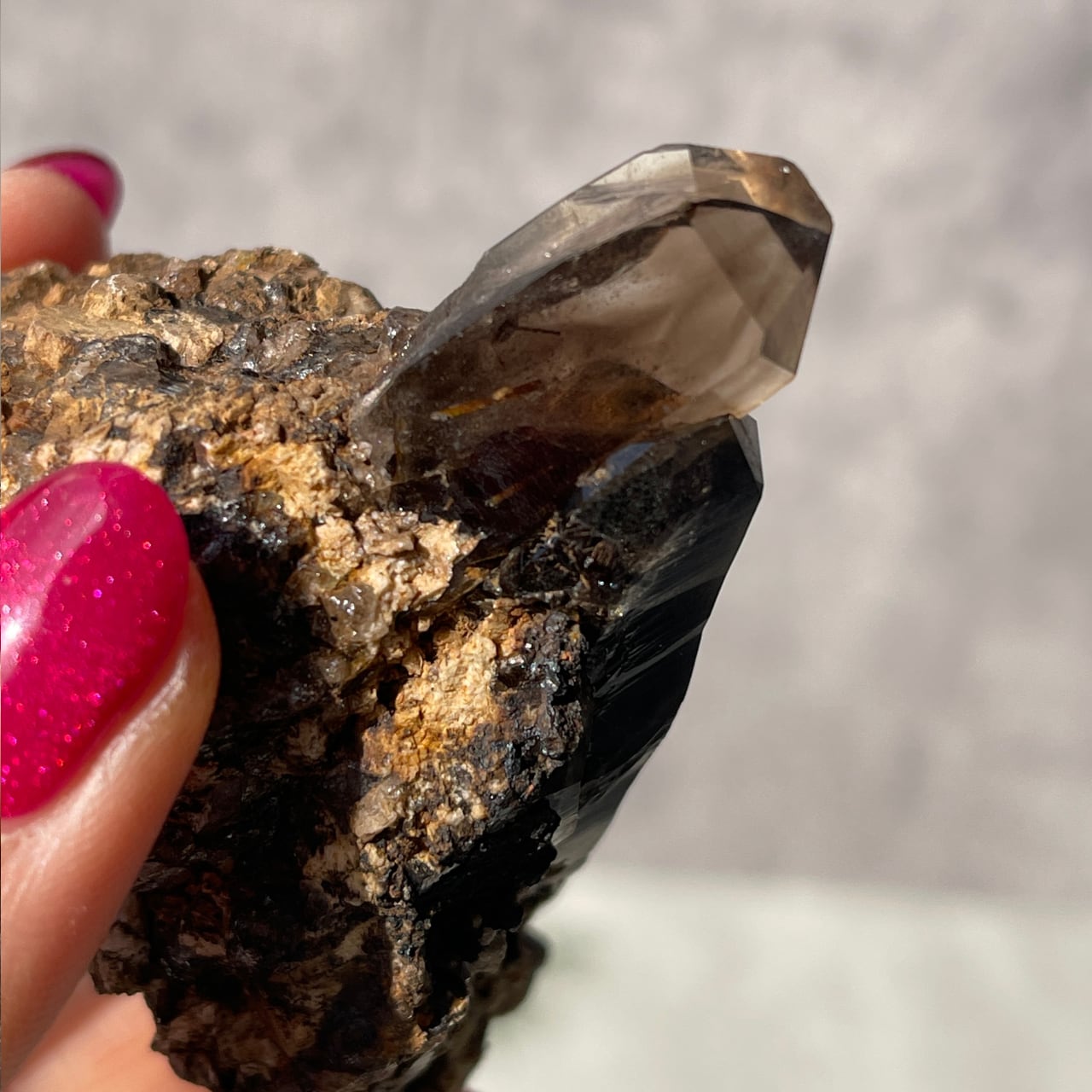 1つの石に、透明度抜群の黒っぽいクォーツとゴツゴツした岩のような見た目の不透明なクォーツと、2つの姿を見ることができます。