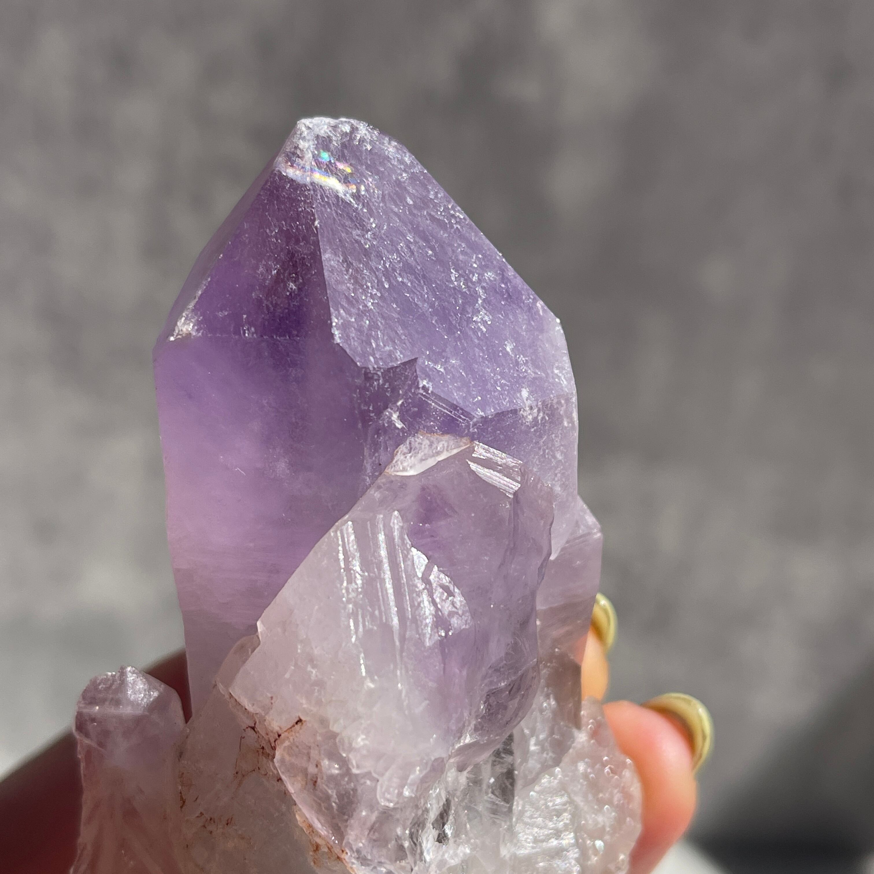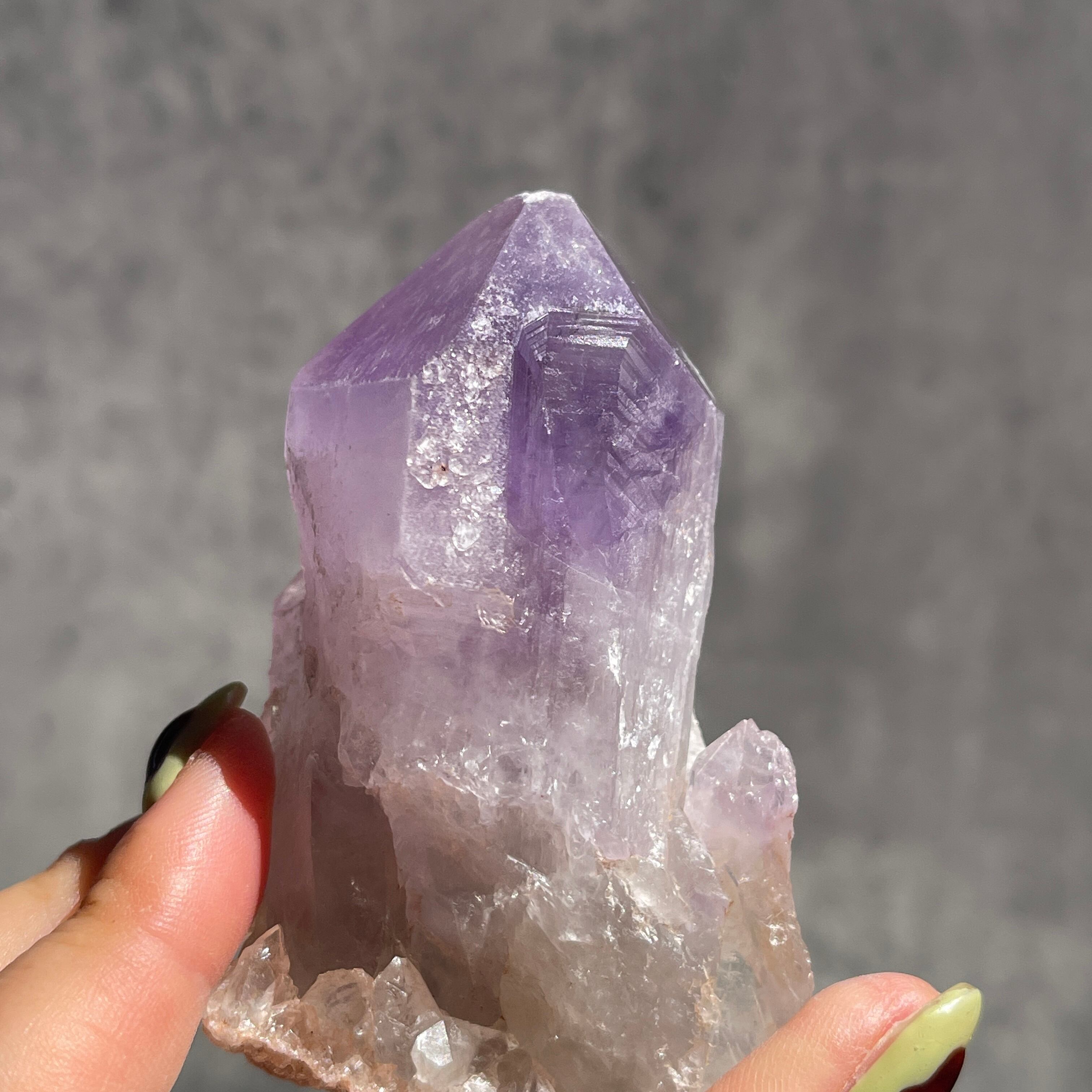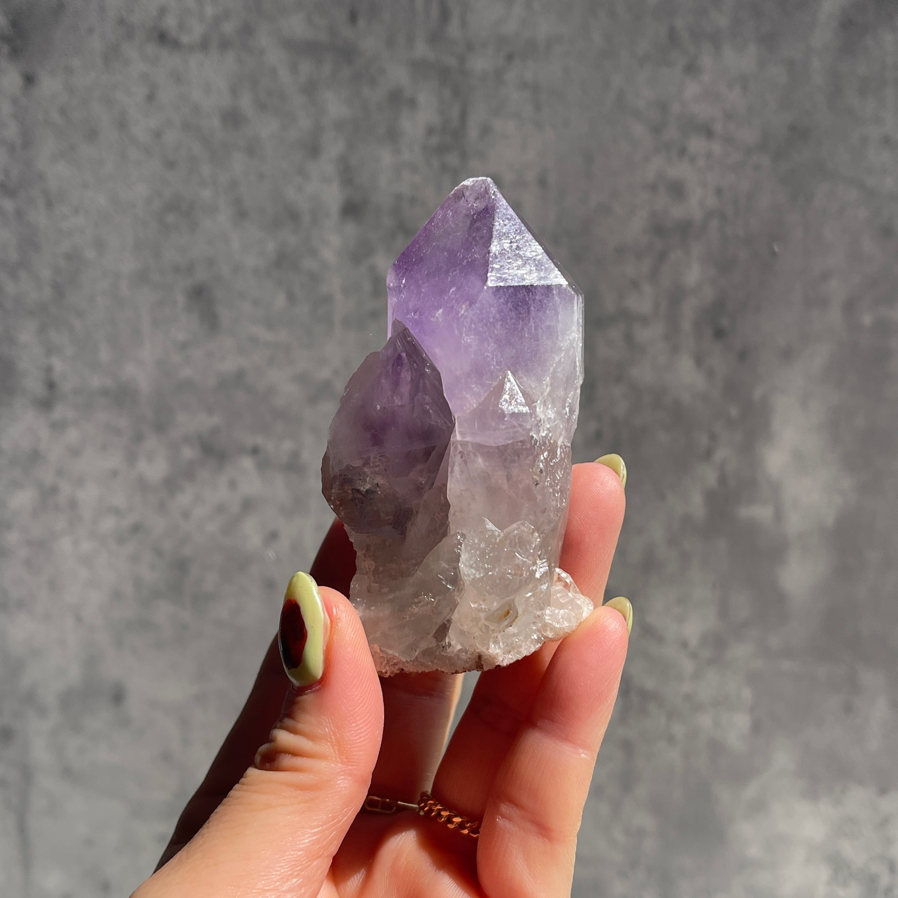先端に向かって深まる濃い紫と、根元のクリアなクォーツへと続く自然なグラデーションが美しい一石です。