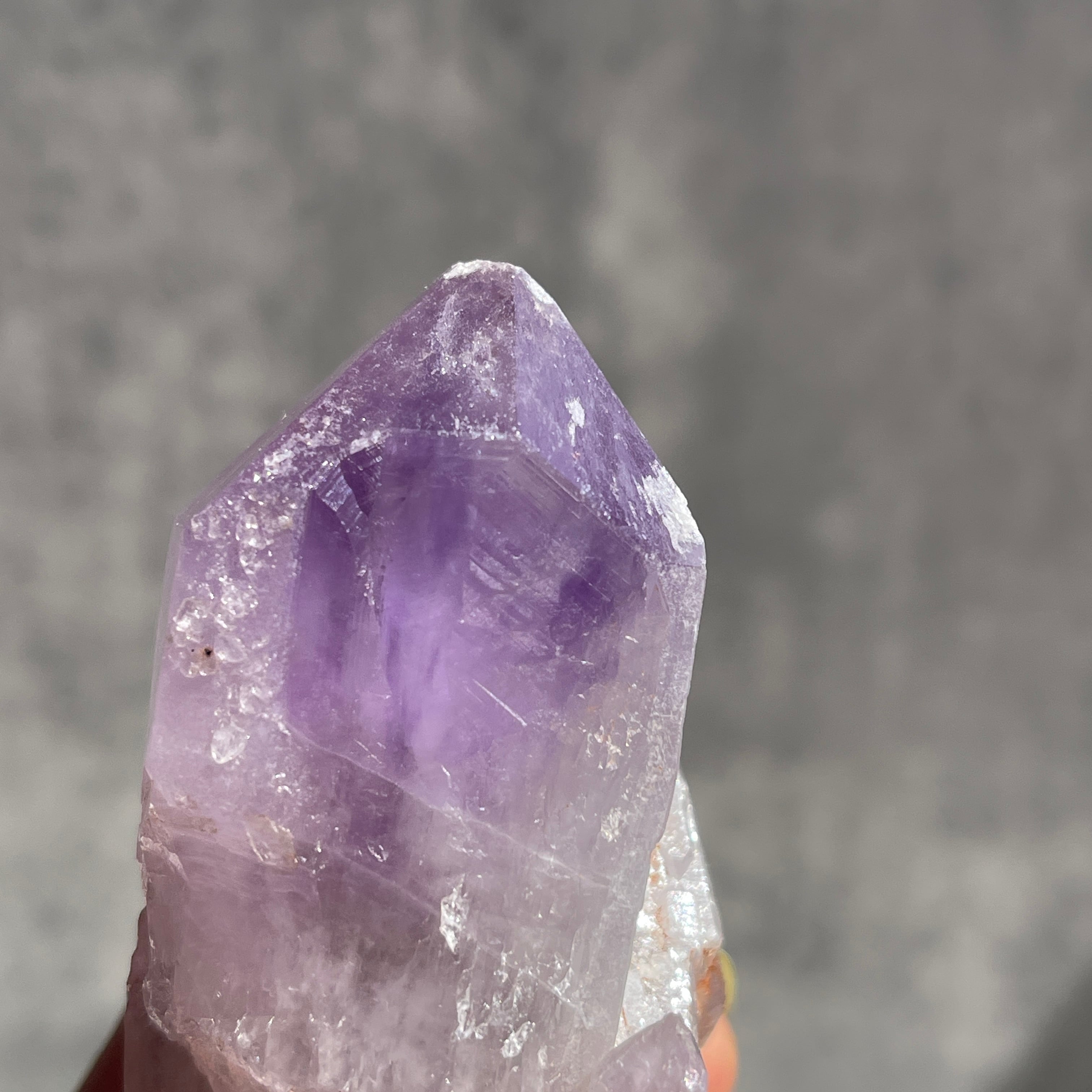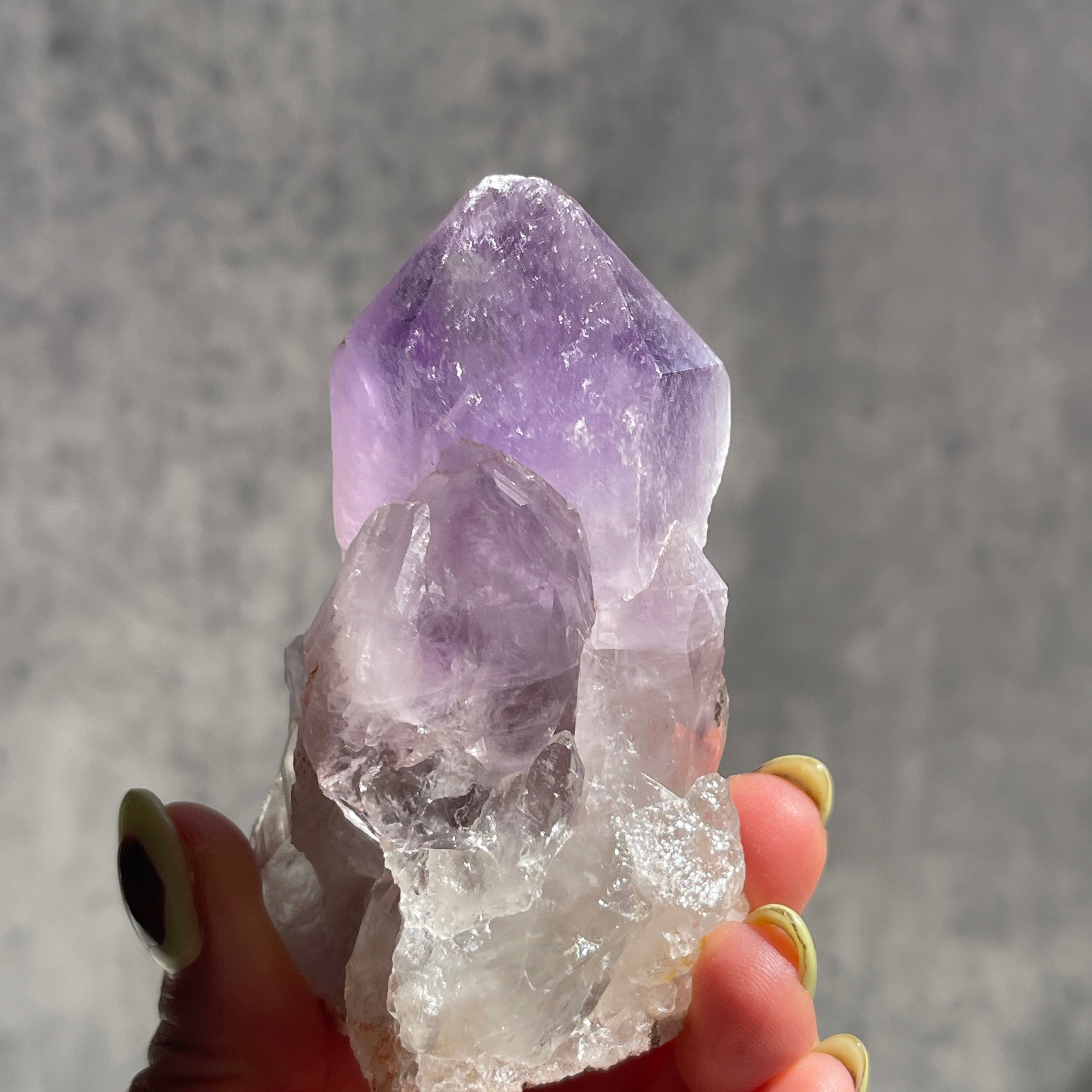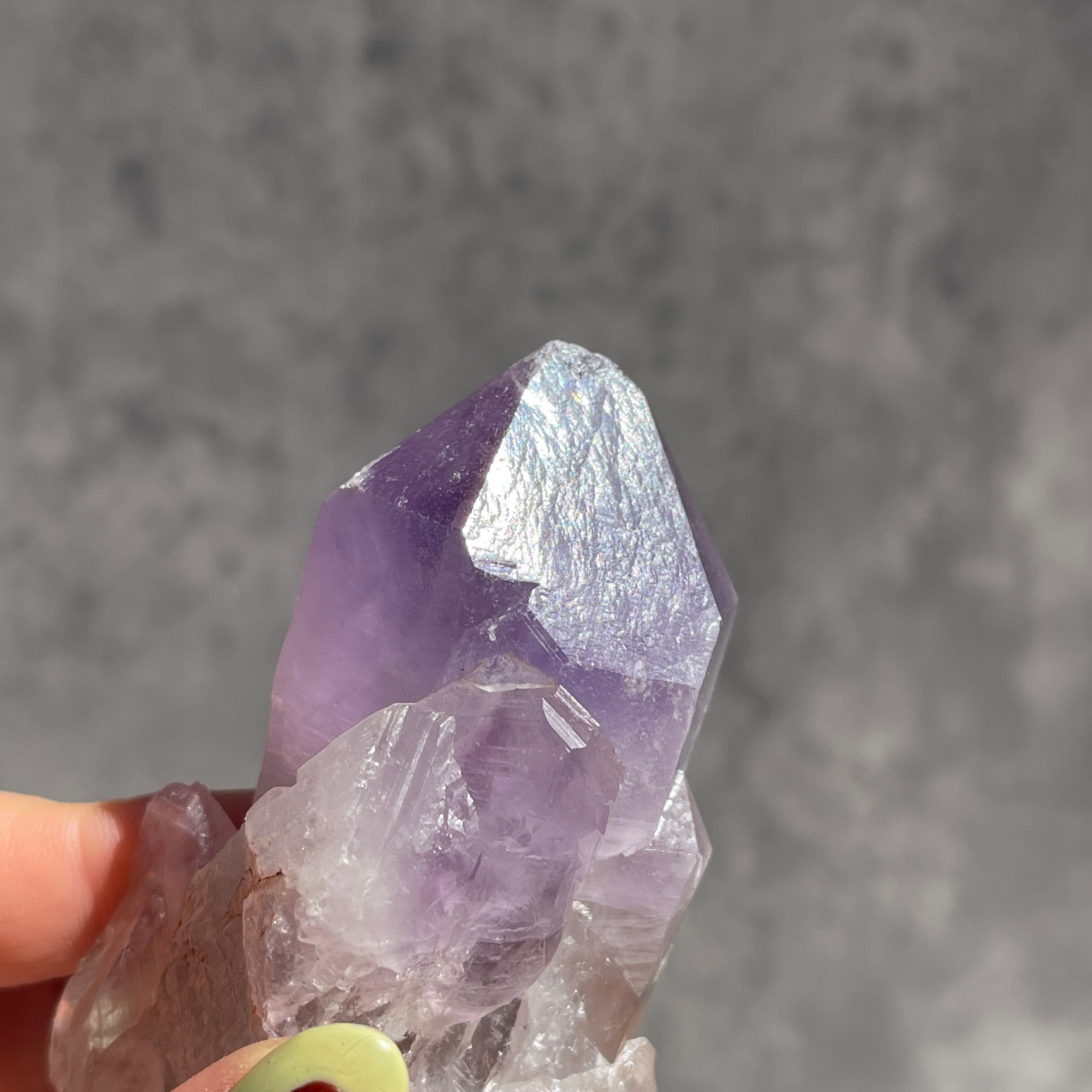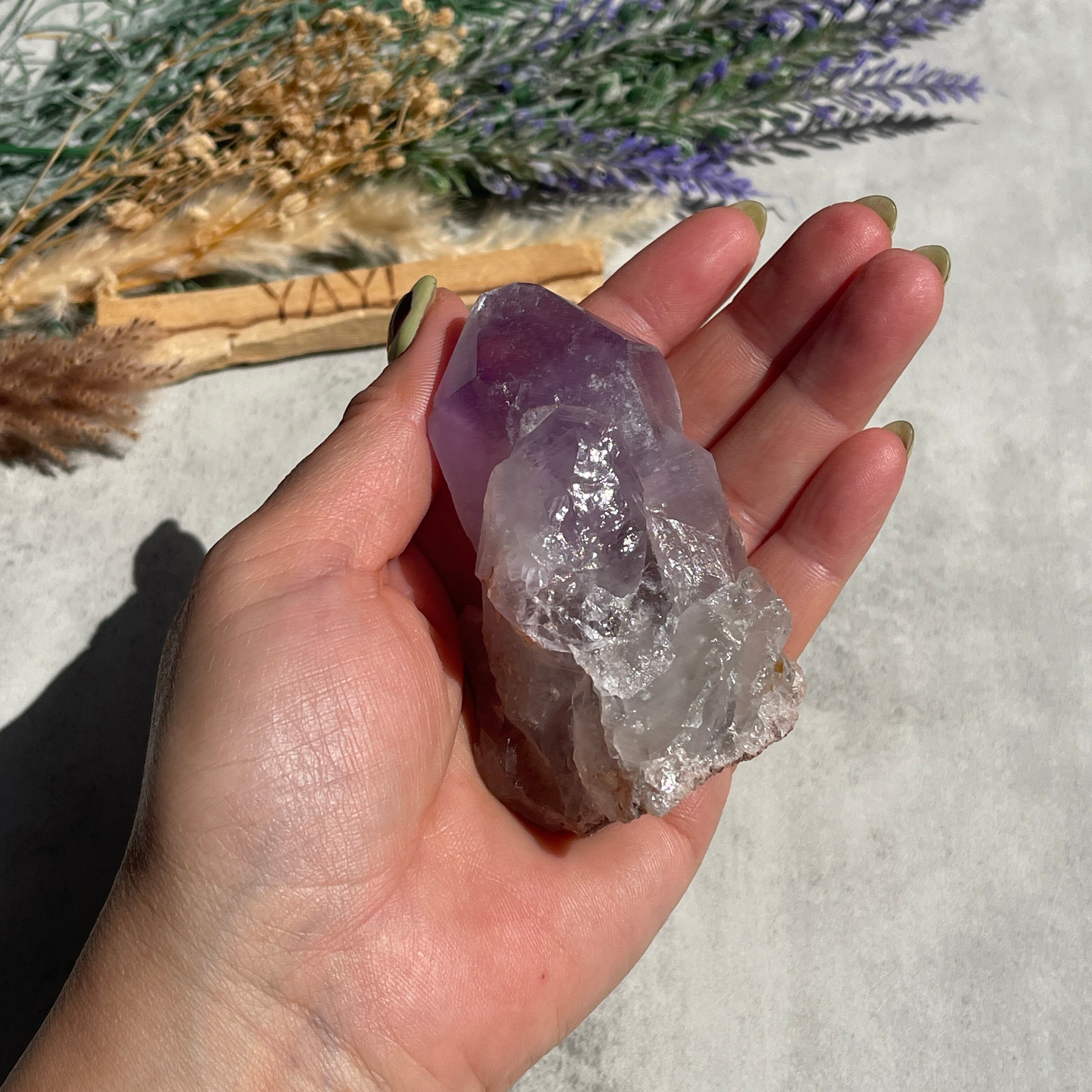 先端に向かって深まる濃い紫と、根元のクリアなクォーツへと続く自然なグラデーションが美しい一石です。