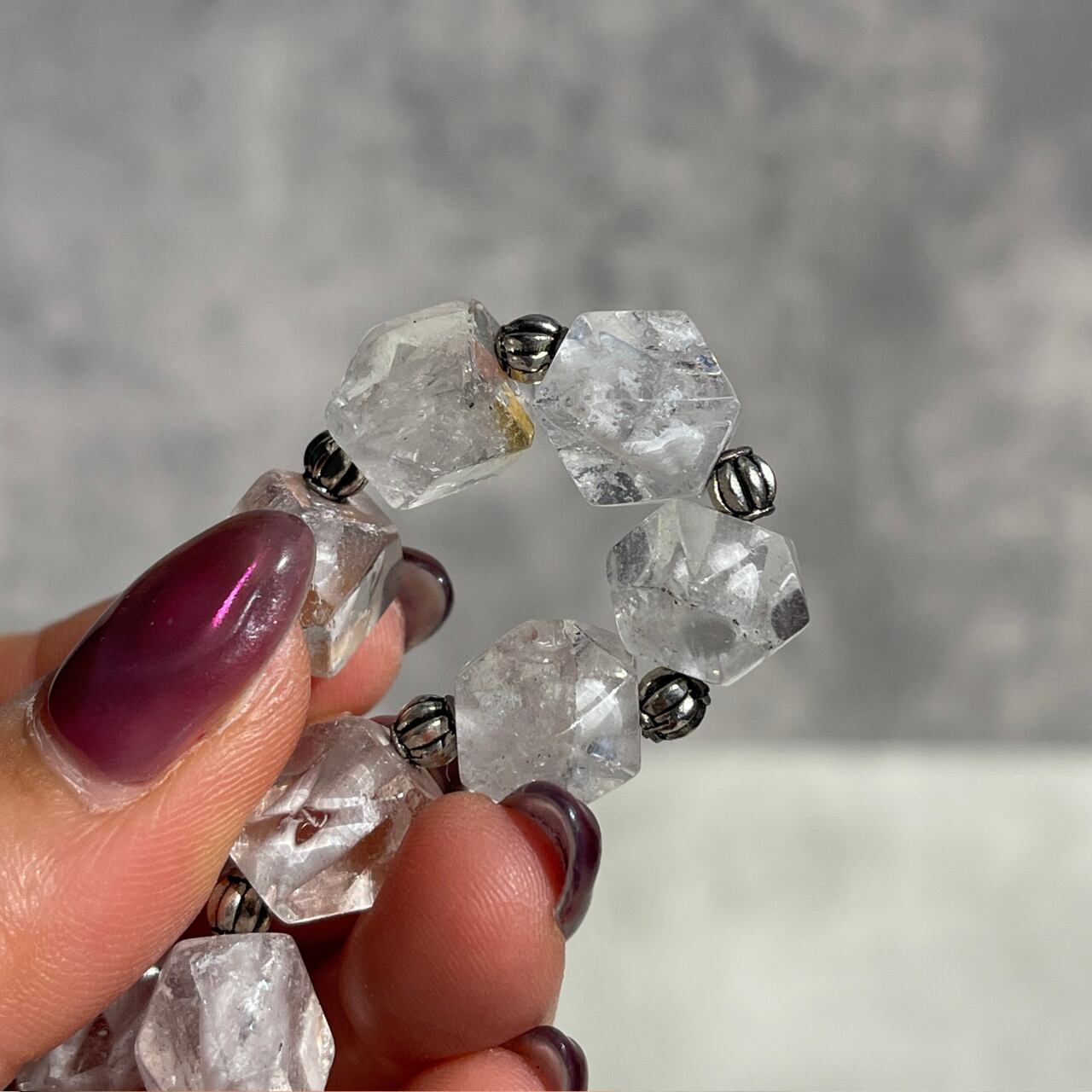 透明度抜群な水晶にシルバーカラーのビーズがシックなアクセントを添える、素敵なブレスレットです。