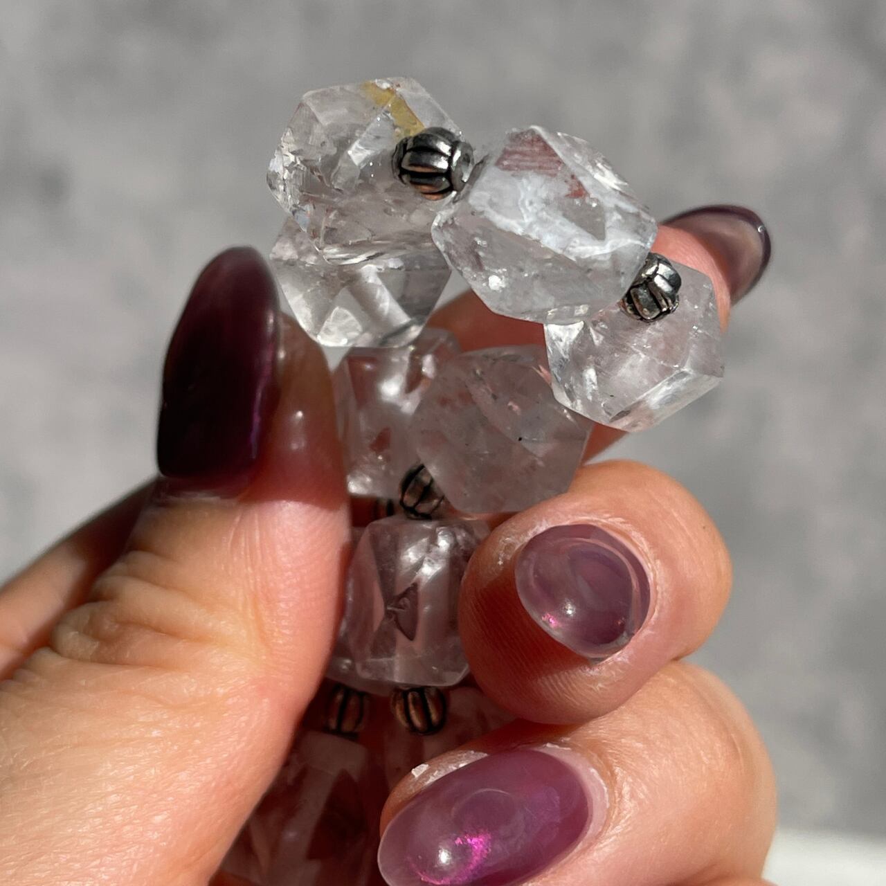 一粒一粒にファセットカットが施されており、シンプルなクリアカラーながら、光を受けることでさりげない輝きが生まれます。