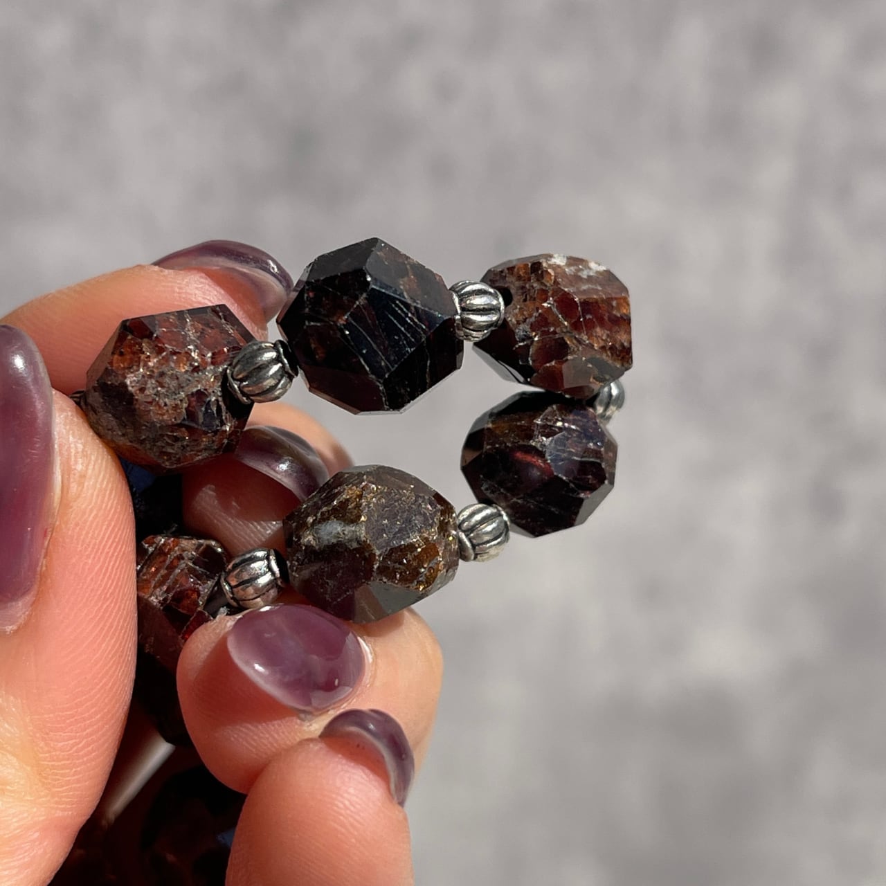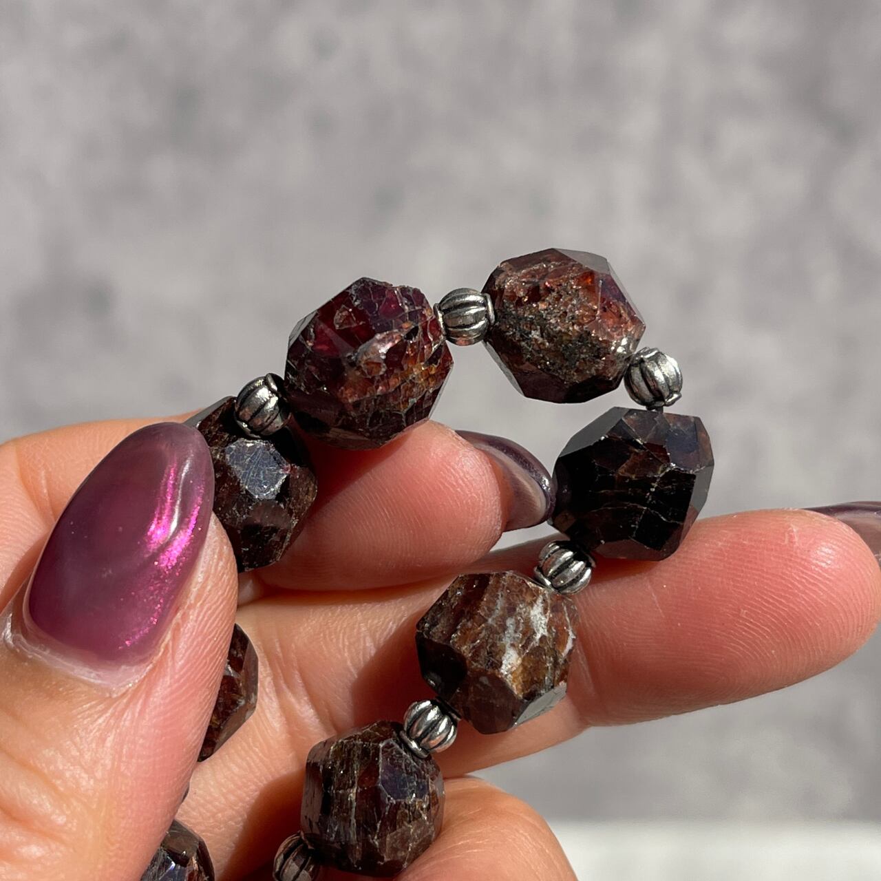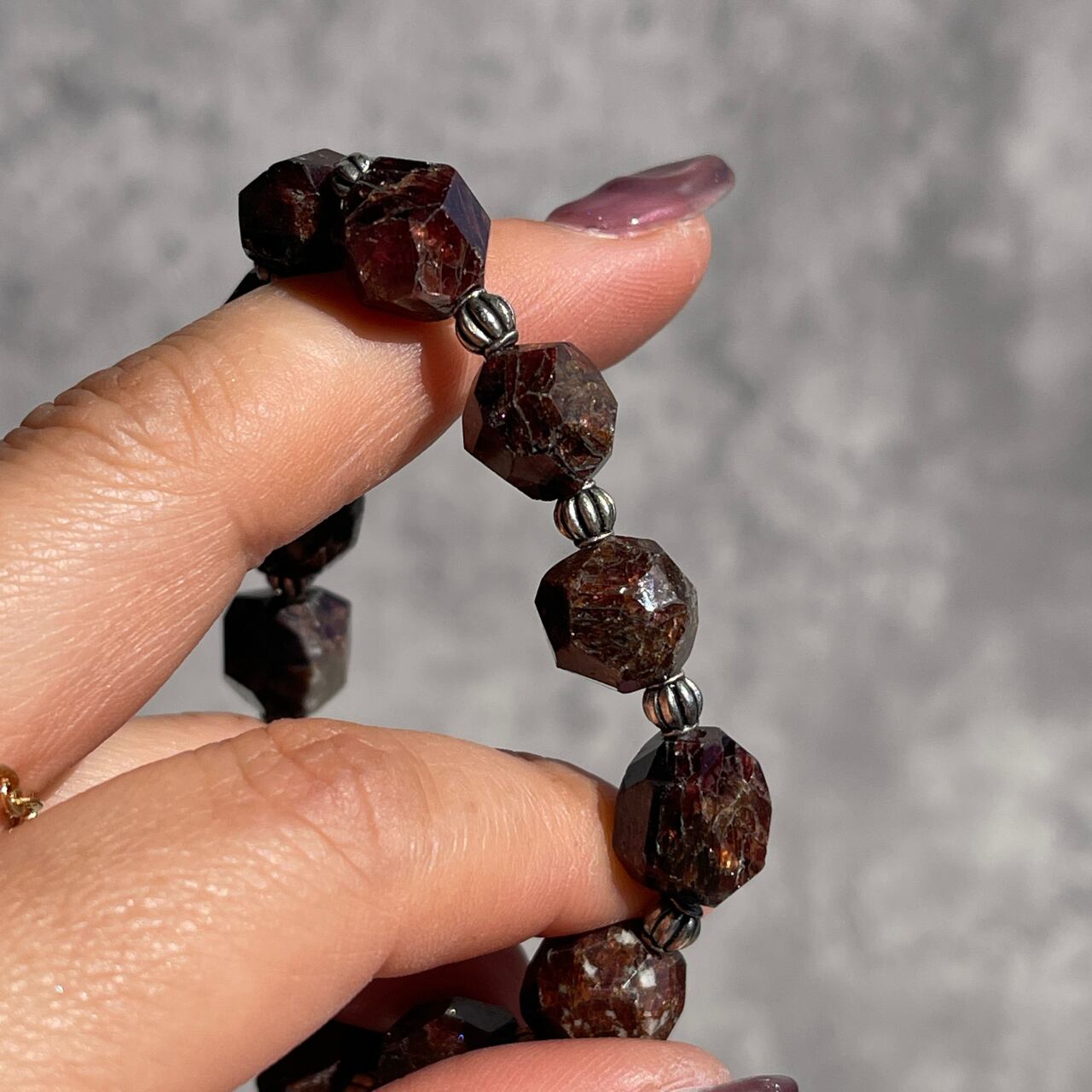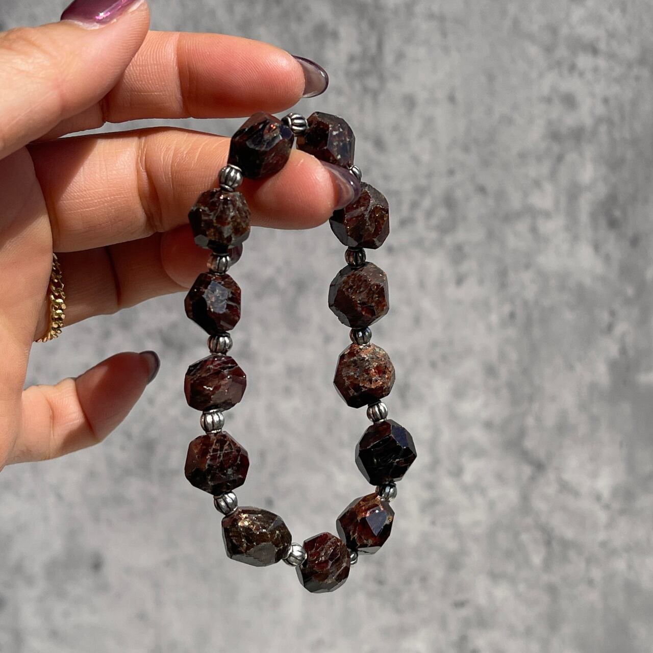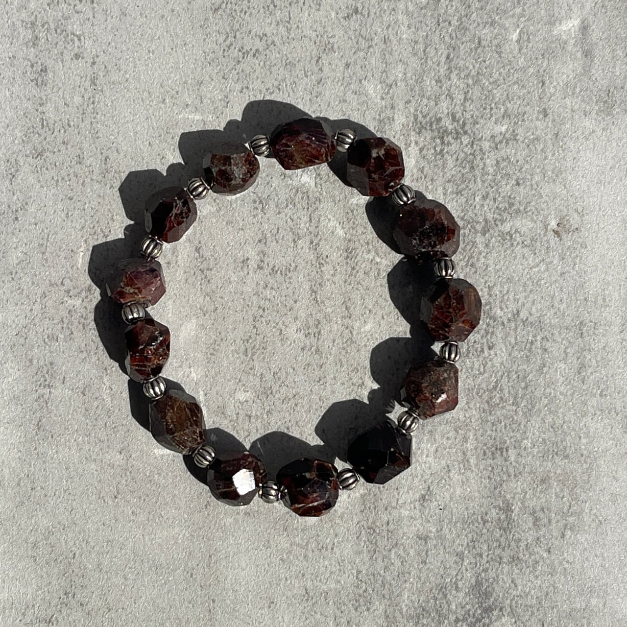 1月の誕生石としても人気のある赤い石、ガーネットにシルバーカラーのビーズがシックなアクセントを添える、素敵なブレスレットです。