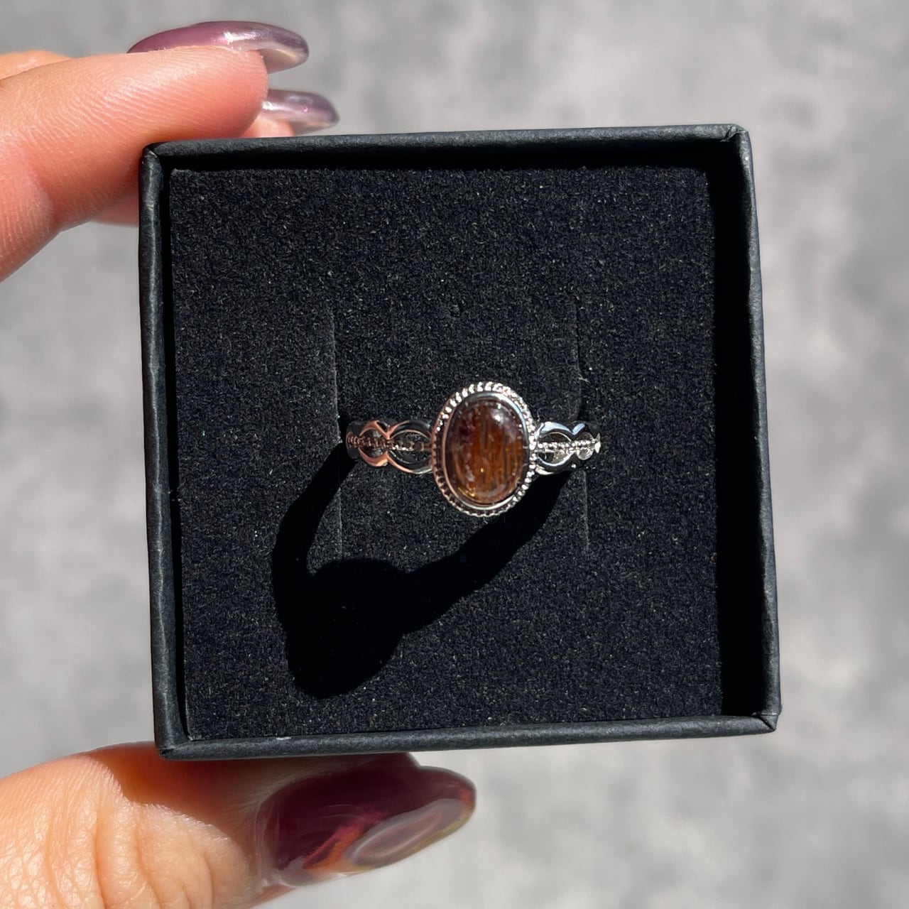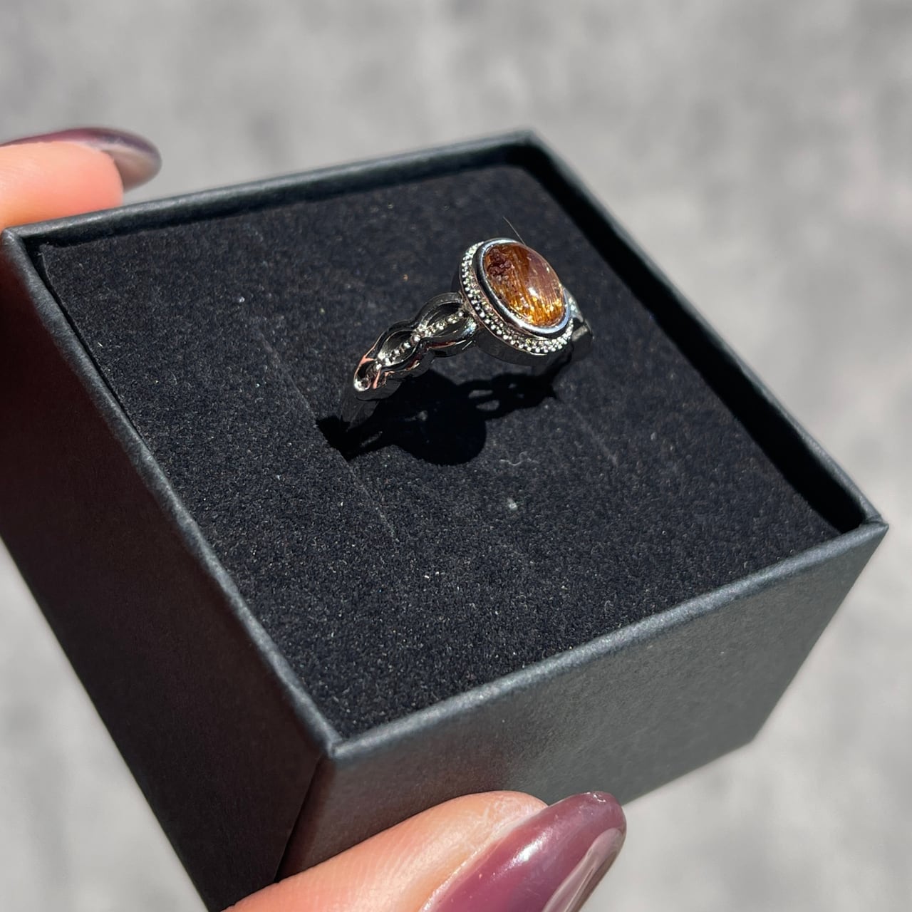 水晶の中に赤茶色~茶褐色の針状の内包物が見られる、ブラウンルチルクォーツのリング。