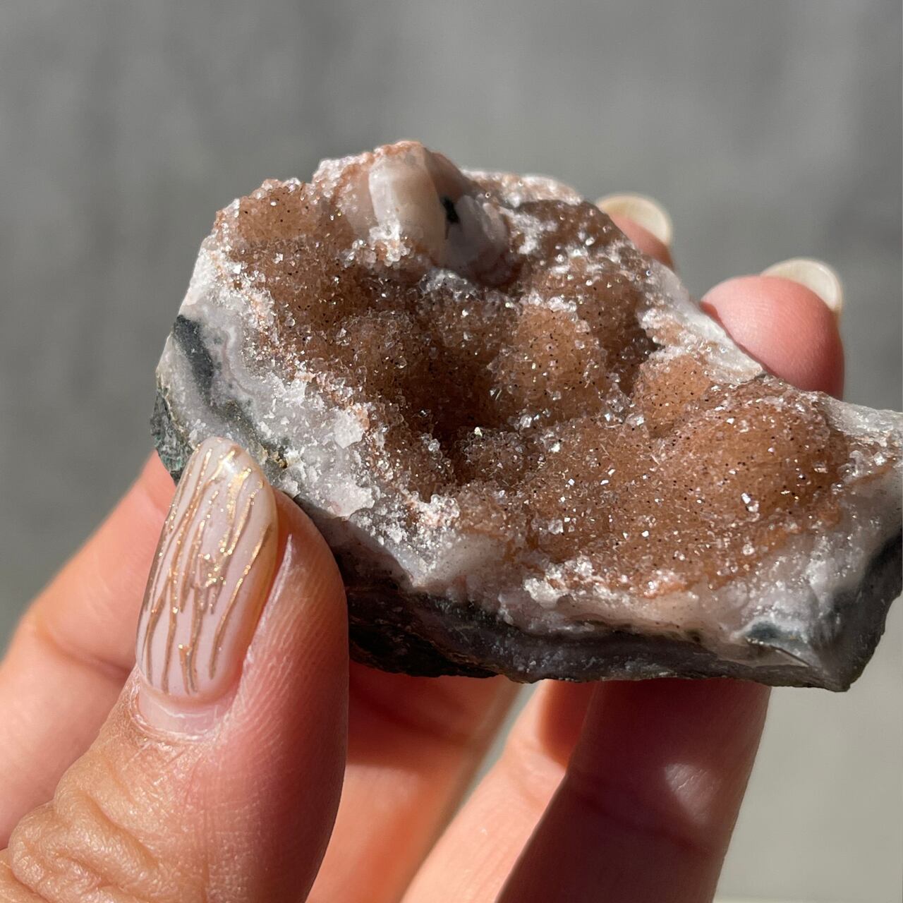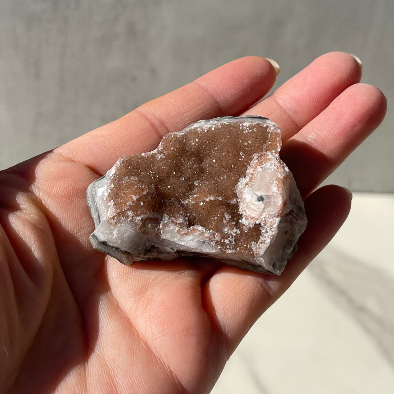 赤茶色の細やかな結晶と半透明の白っぽい鉱物が組み合わさった、アメジスト/ゼオライトのクラスター。