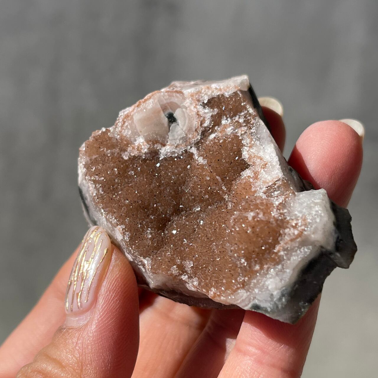 ゼオライトは、主に白色に繊維質な模様が見られる鉱物です。和名を「沸石(ふっせき)」といい、水分を含んでいるため、加熱すると小さな隙間から水が沸きあがっているように見えるためだといわれています。